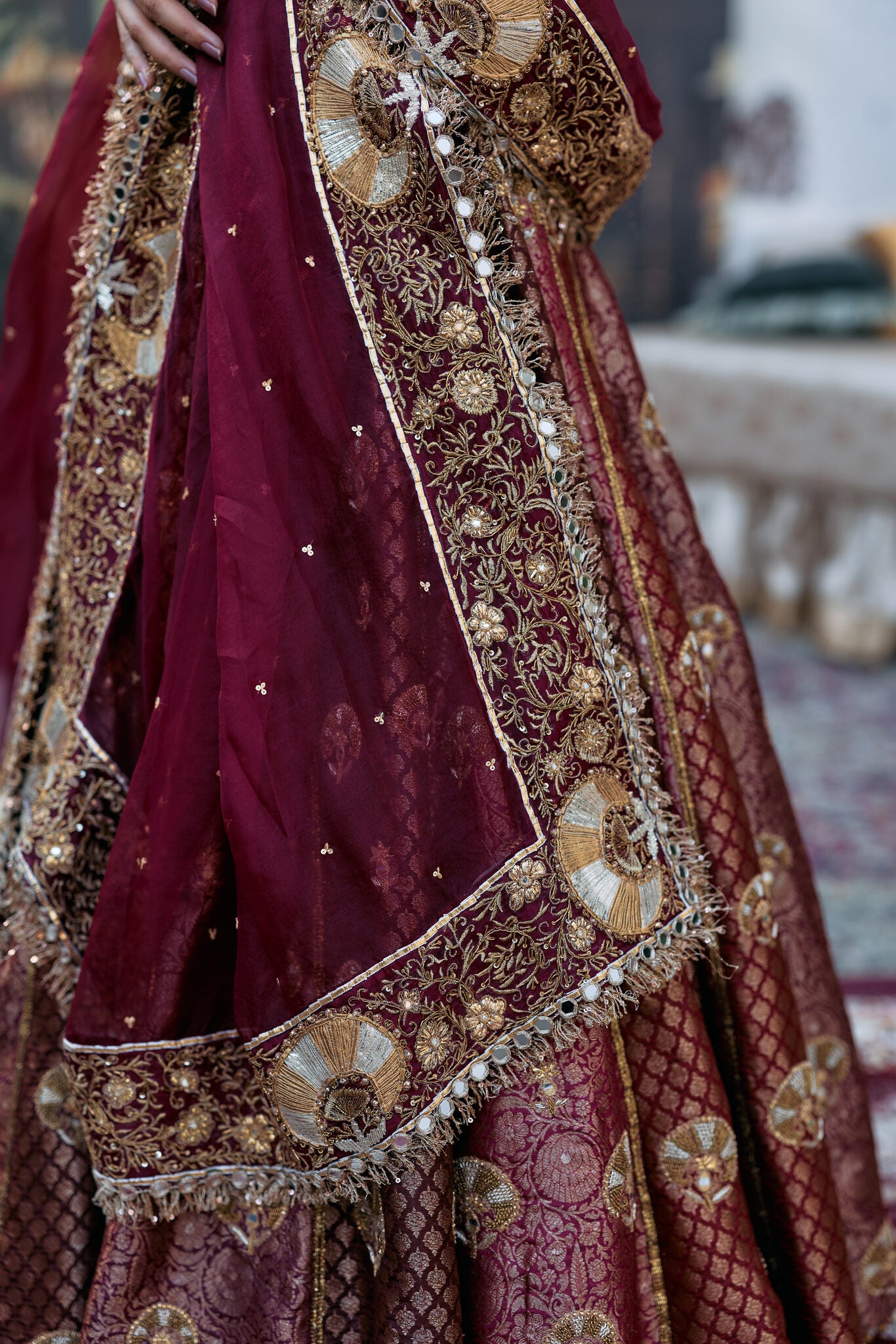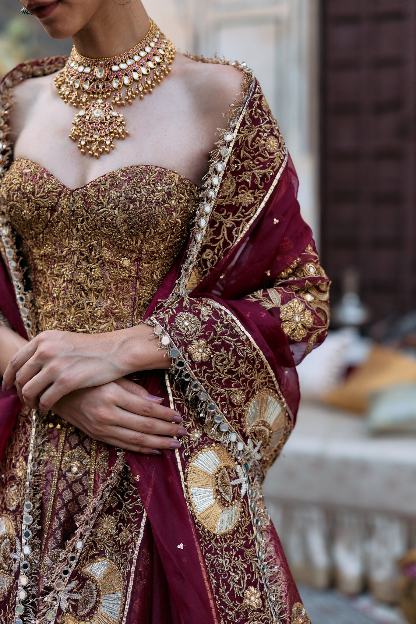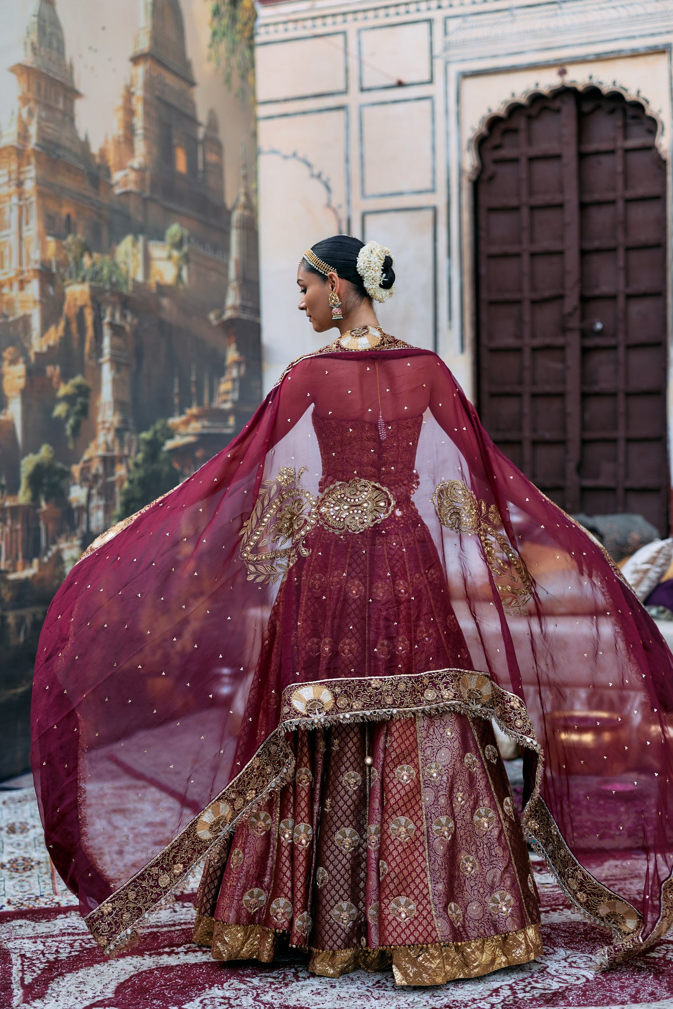 This set consists of a magenta, red, purple and brown panelled embroidered lehenga paired with a panelled intricate embroidered corset and organza embroidered dupatta
