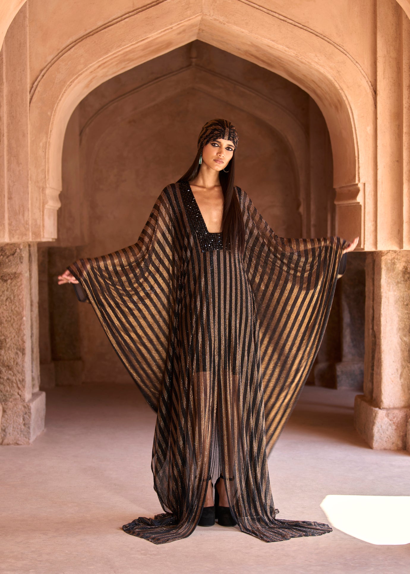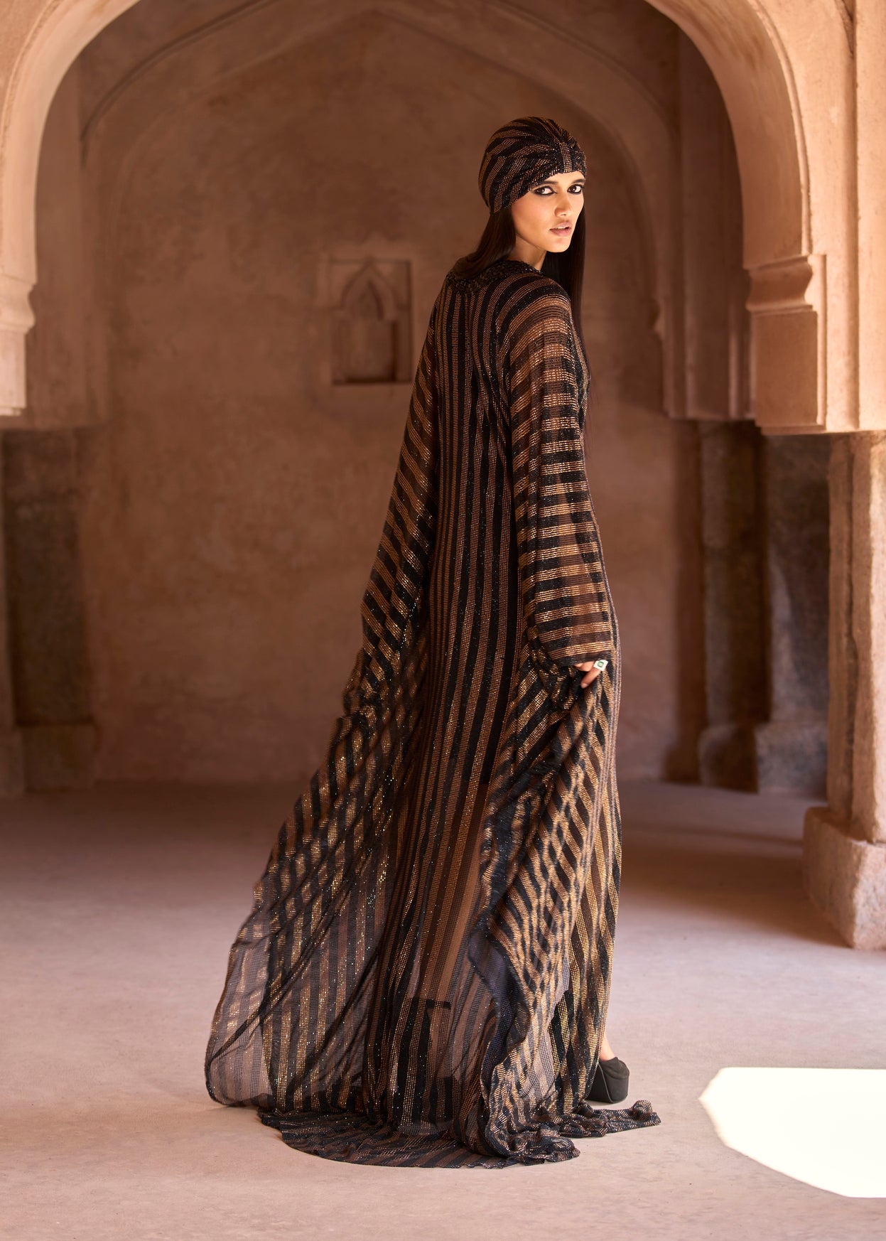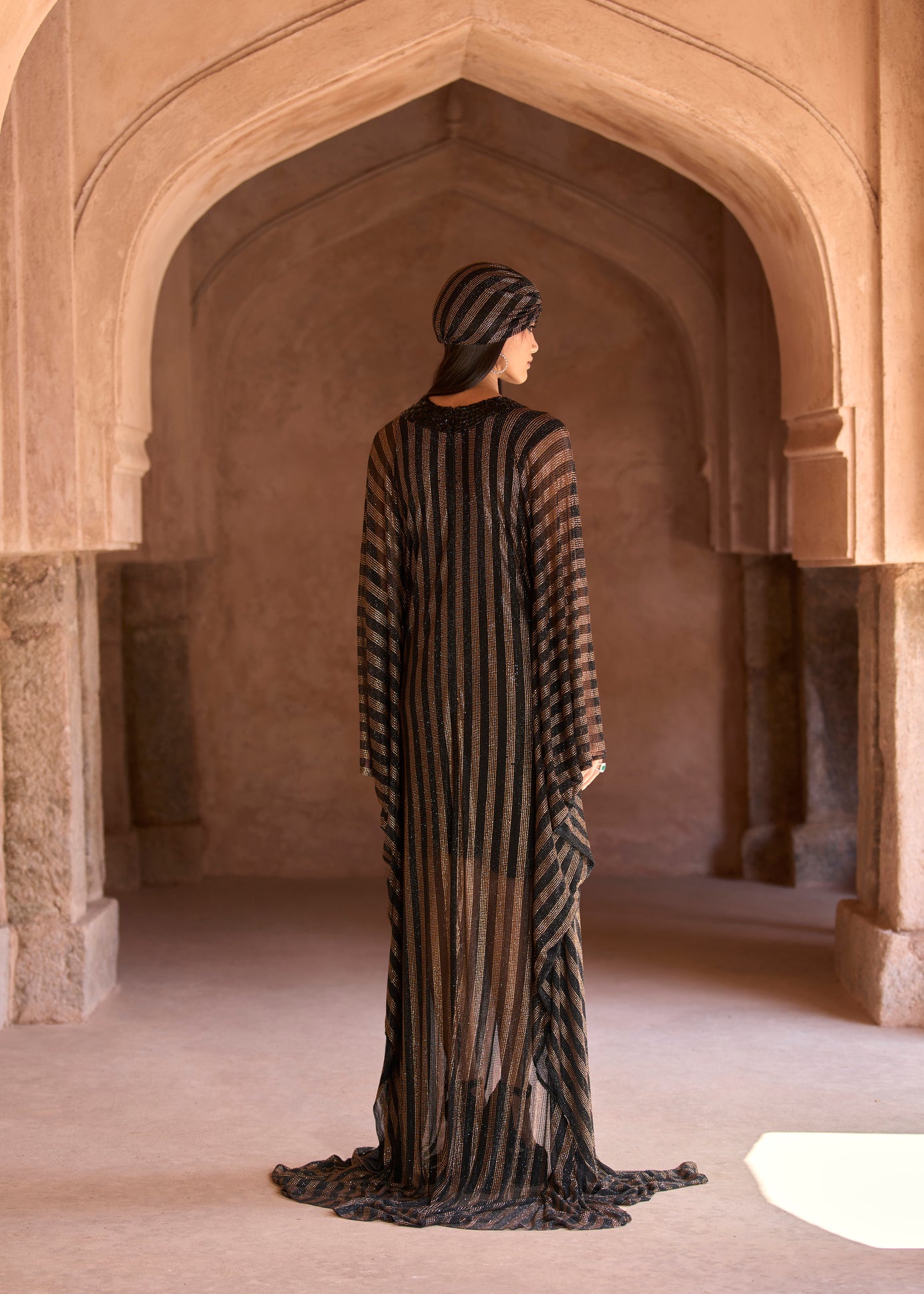 Black and gold striped crystal-embellished full-length kaftan, featuring a stone-embellished embroidered yoke and paired with a black crepe slip along with a matching headgear accessory.