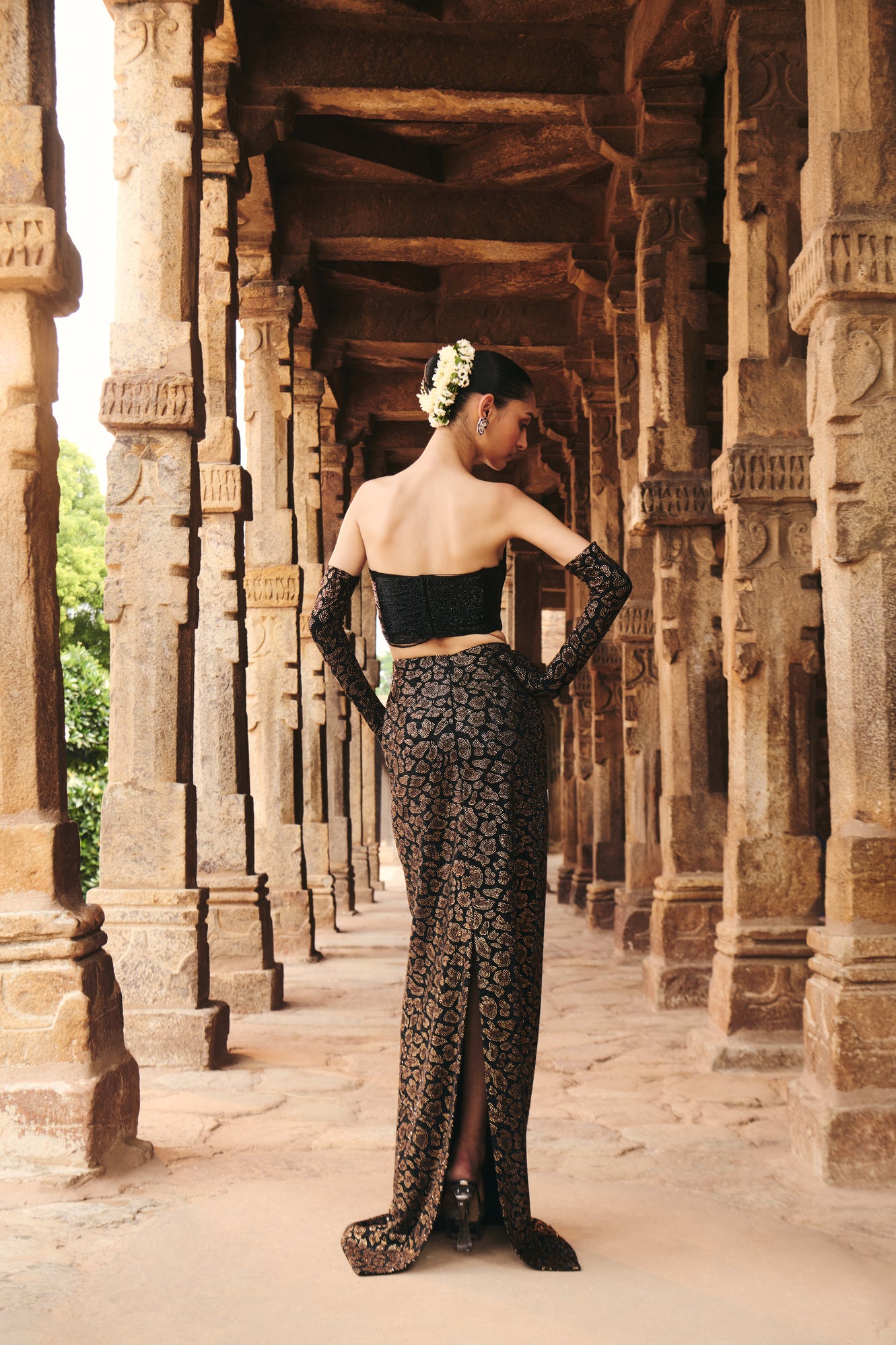 Black fringe corset on net base and a crepe skirt that has a pocket. The skirt has leopard print all over. This outfit is paired with leopard print gloves.