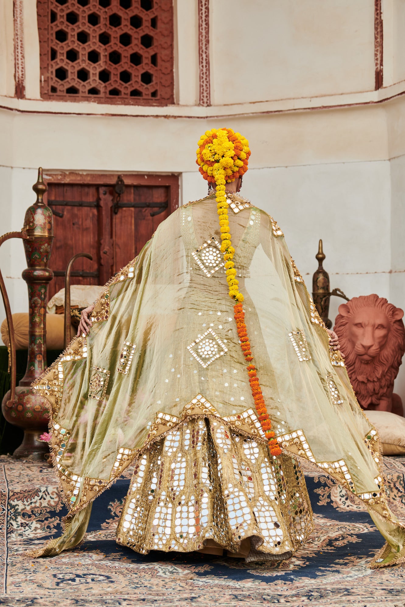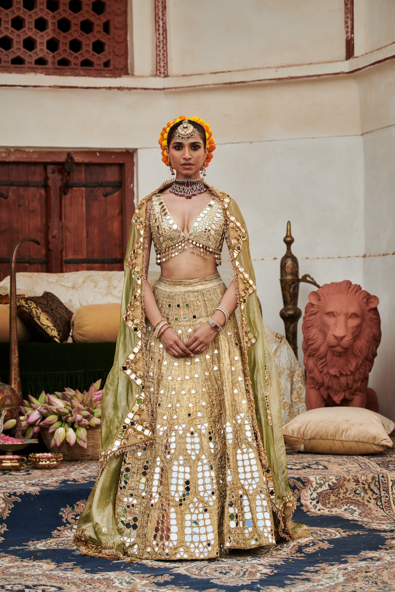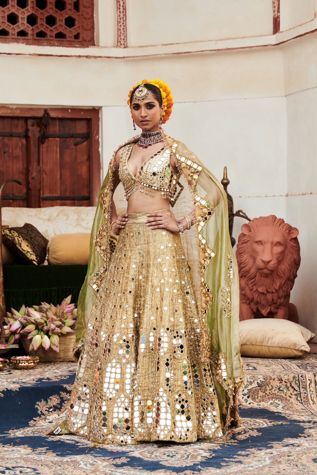 Golden chanderi lehenga adorned with intricately placed mirrors and mirror work blouse on gota lined with chanderi silk paired with a tissue dupatta with fine kiran.
