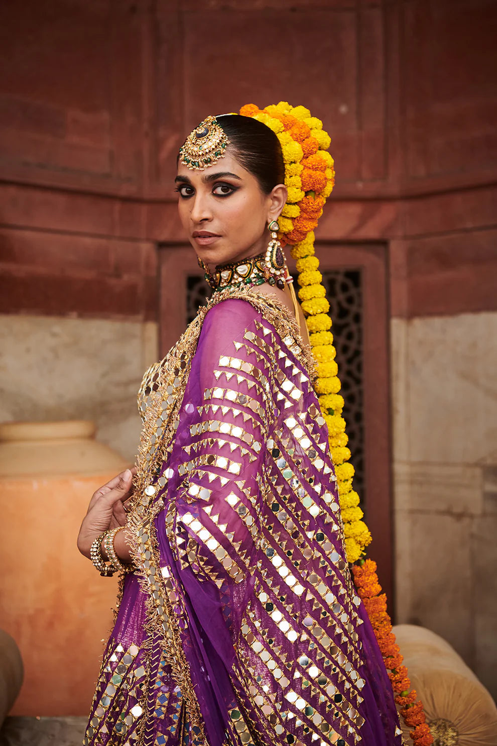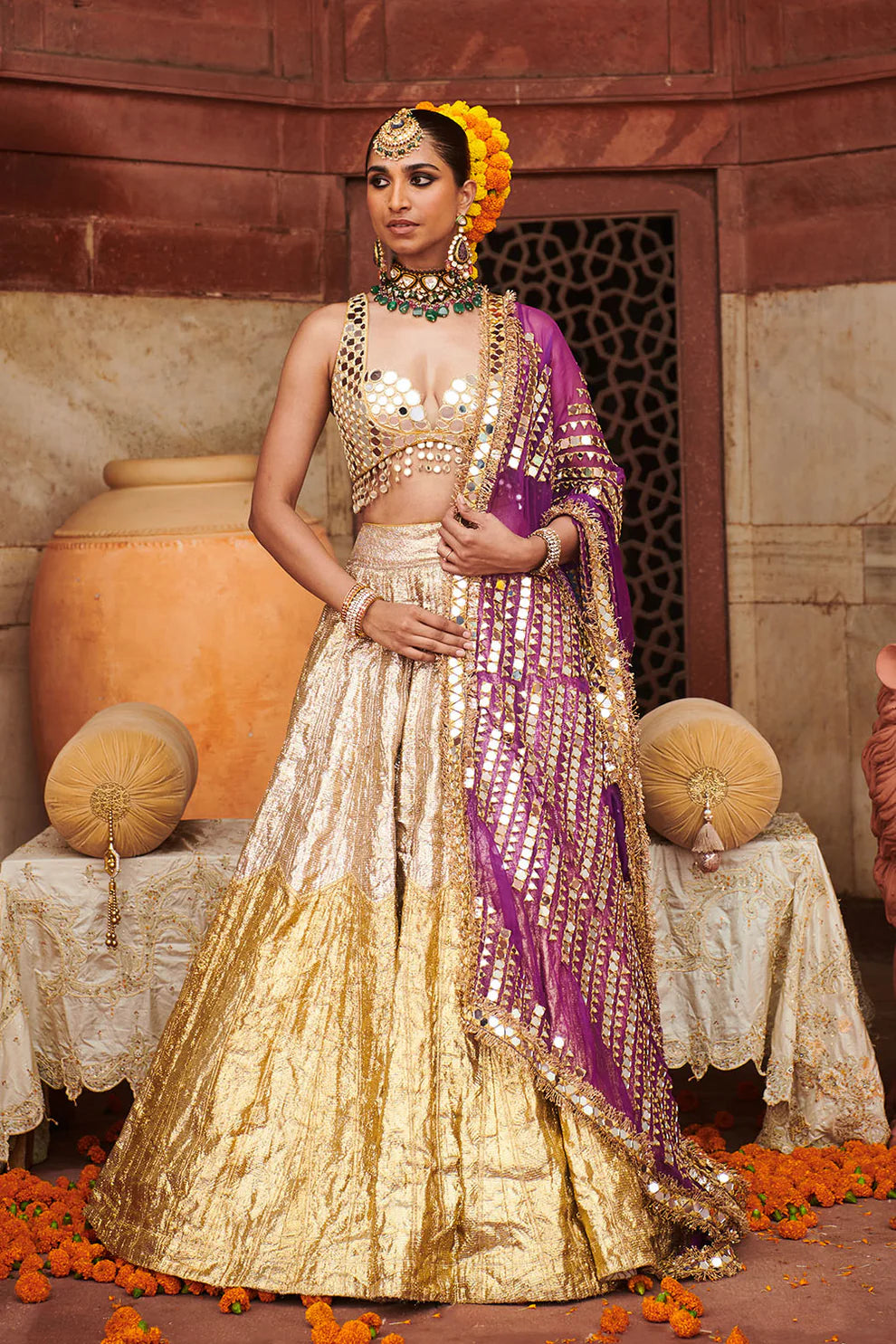 The skirt features a unique design split into two contrasting halves, silver and gold. Paired with a mirror work blouse on gota lined with chanderi silk and pop of colour is added with a purple organza dupatta.