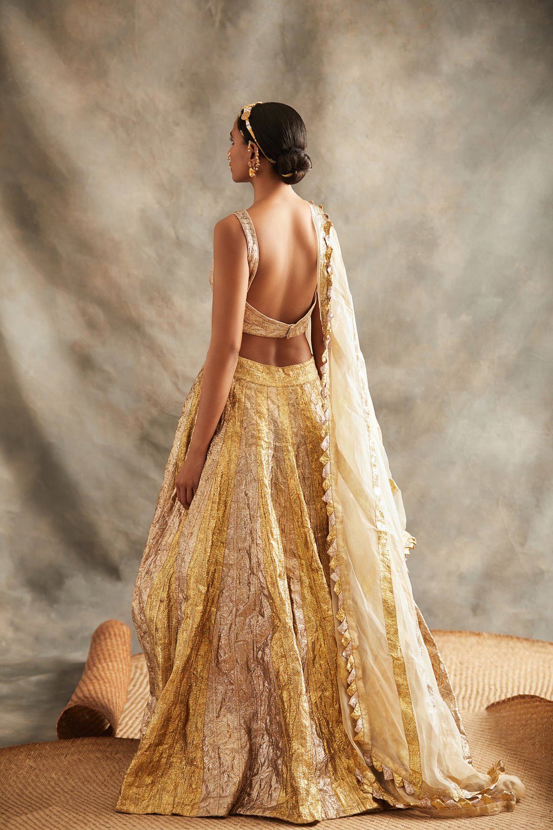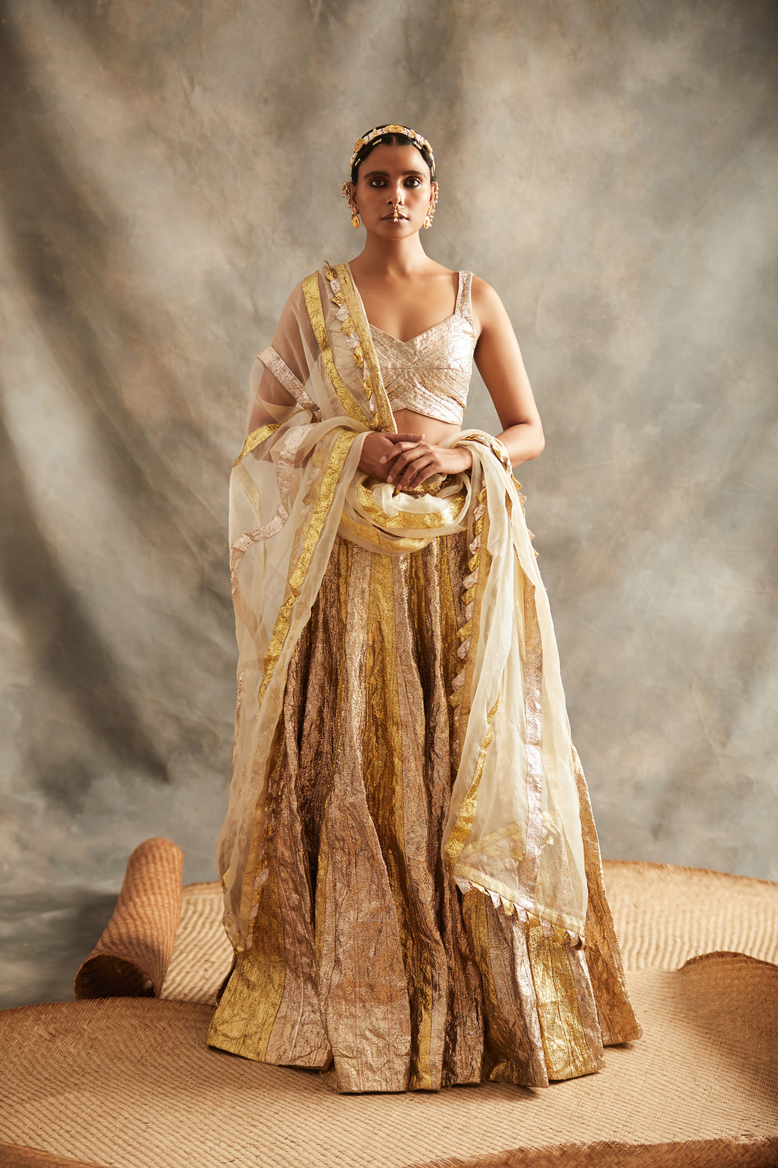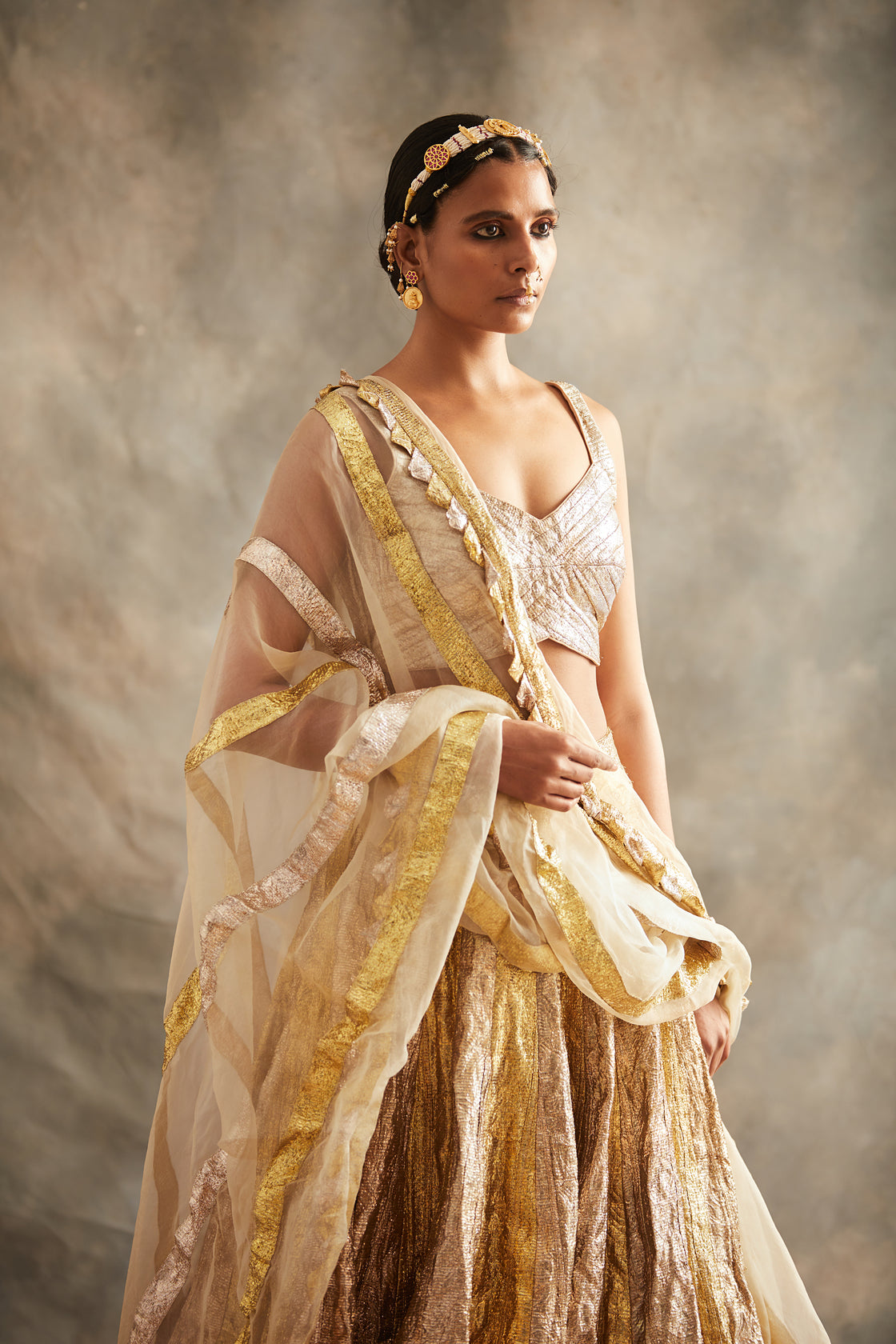 Gold Silver Woven Zari Crinkled Lehenga Teamed With Silver Woven Blouse Accentuated With Organza Dupatta With The Touch Of Lampi Strips And Traingles