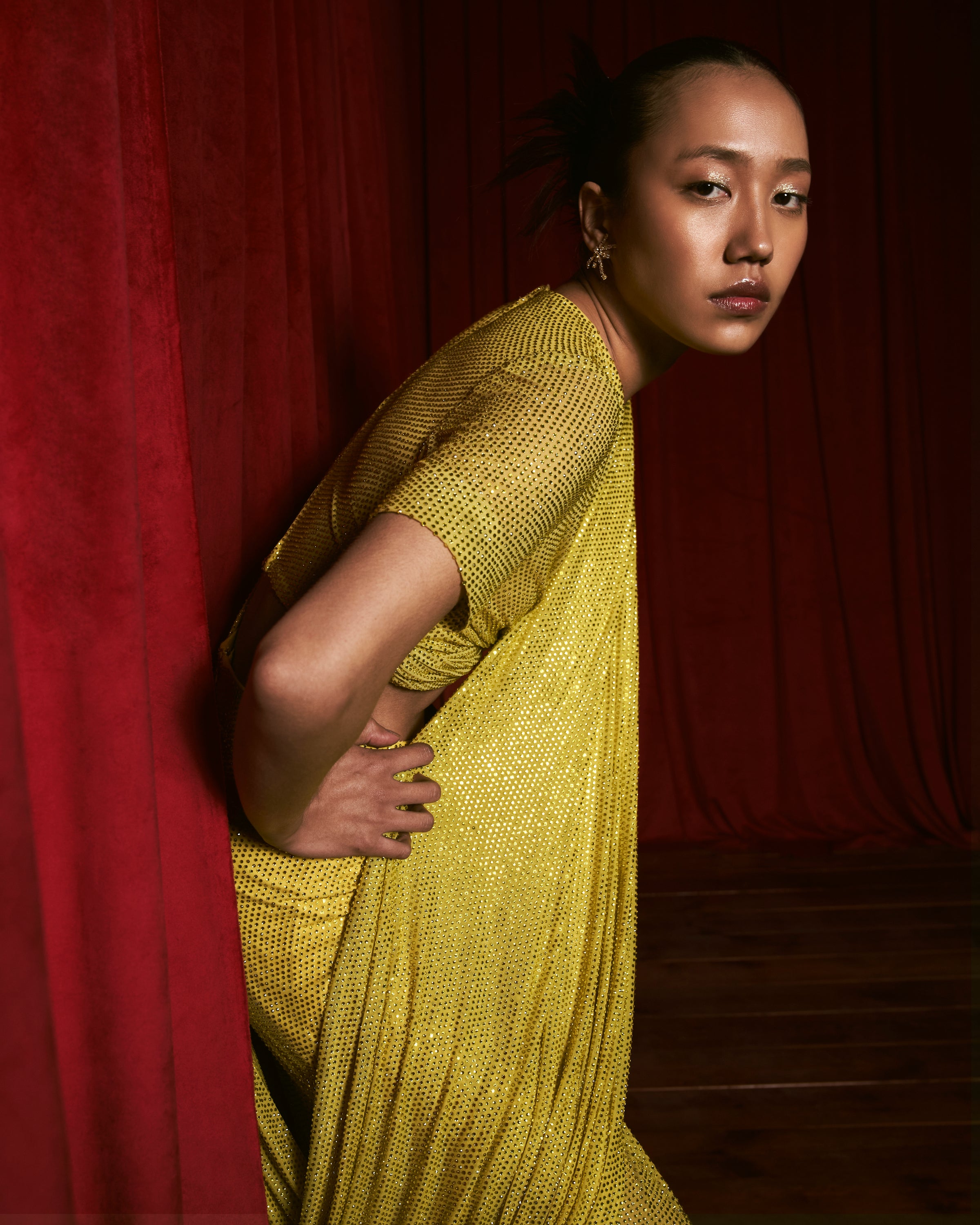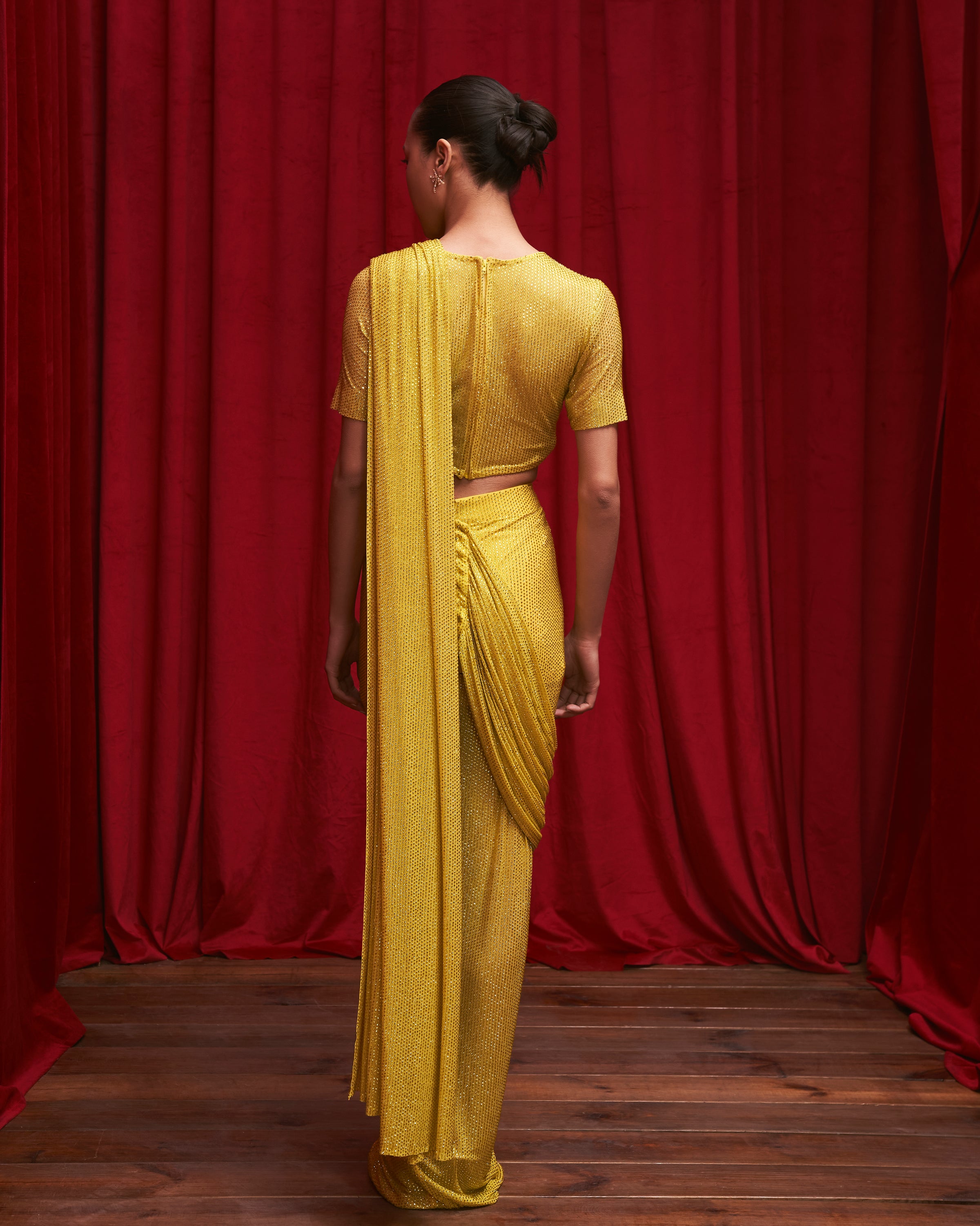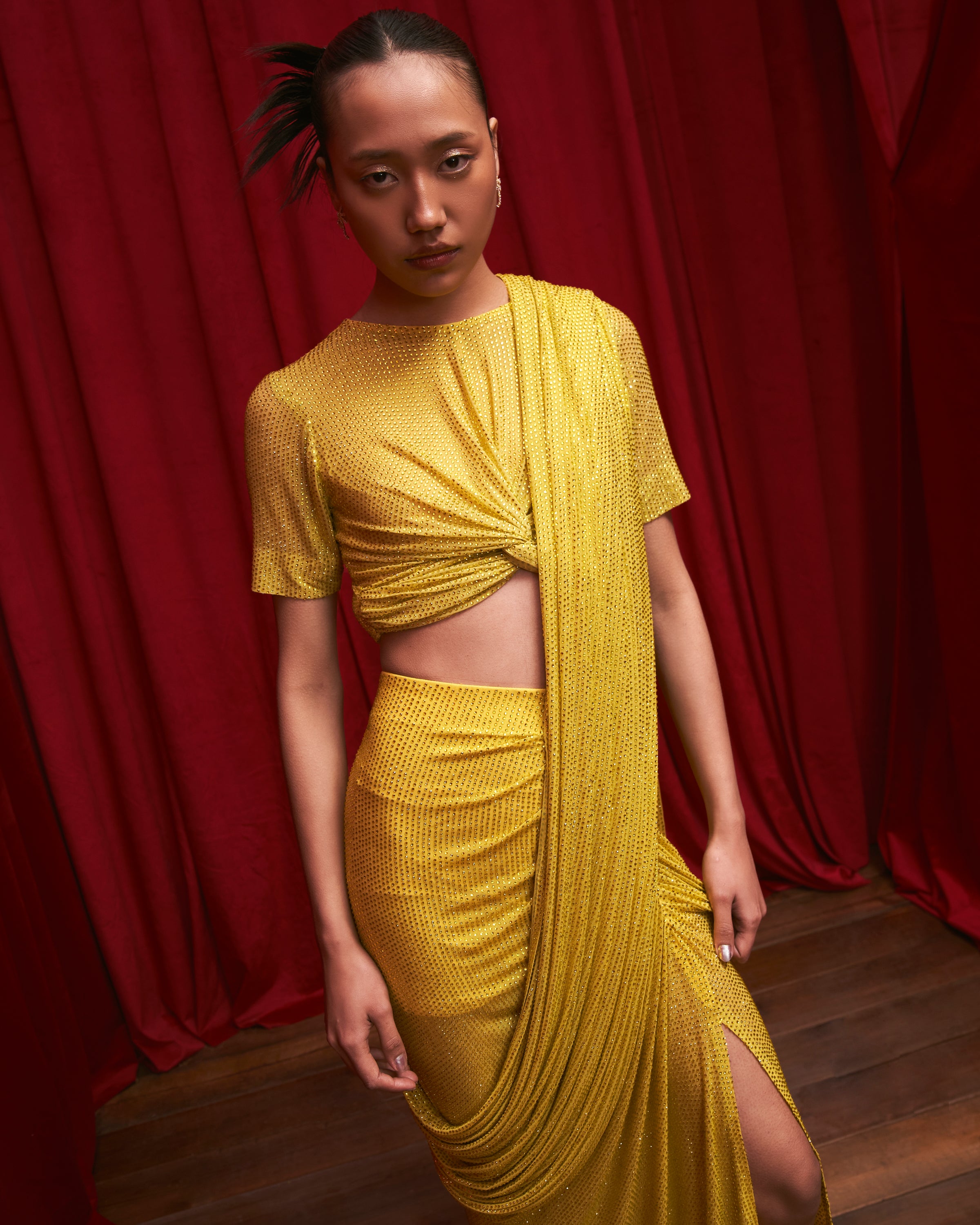 Yellow crystal embellished crew neck blouse with twisted knot detail on hem paired with front slit ruched skirt and detachable palla.