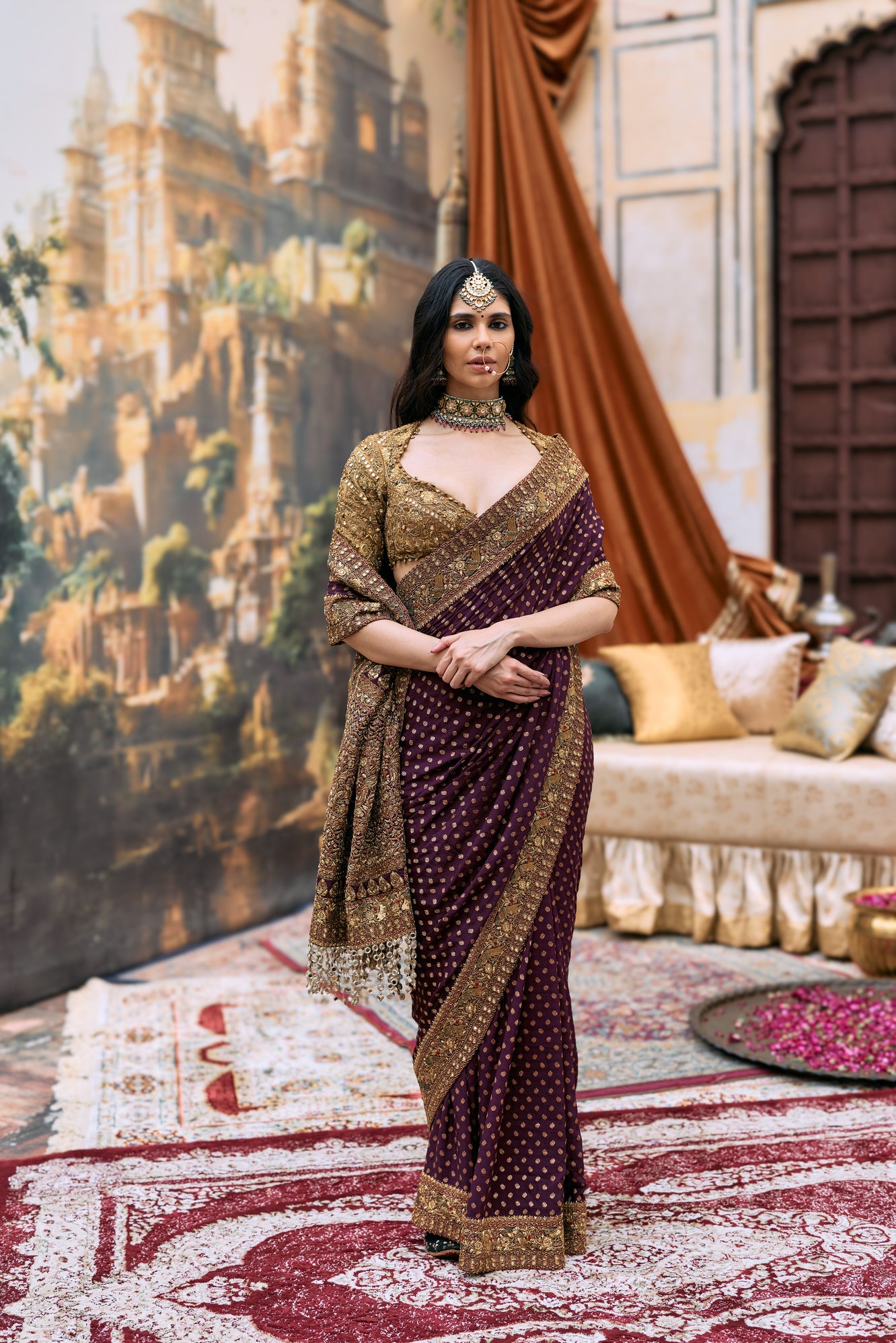 A luxurious crepe saree adorned with intricate antique embroidery, complemented by a fully hand embroidered contrast blouse.