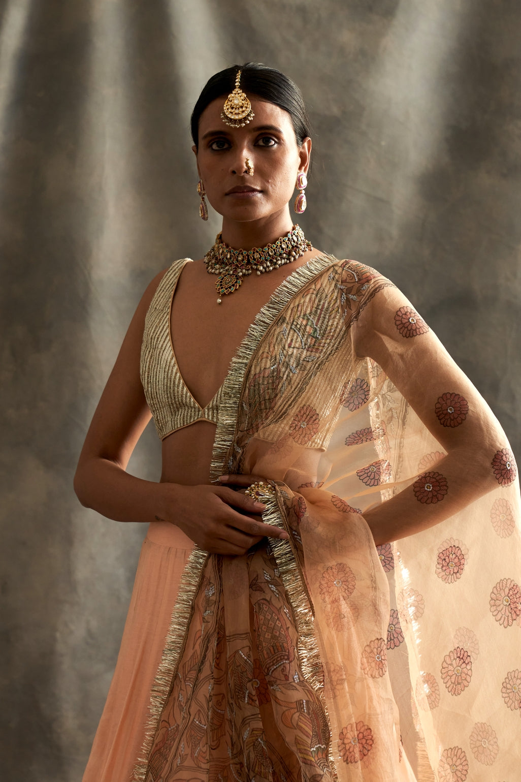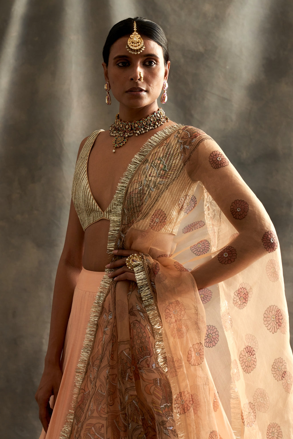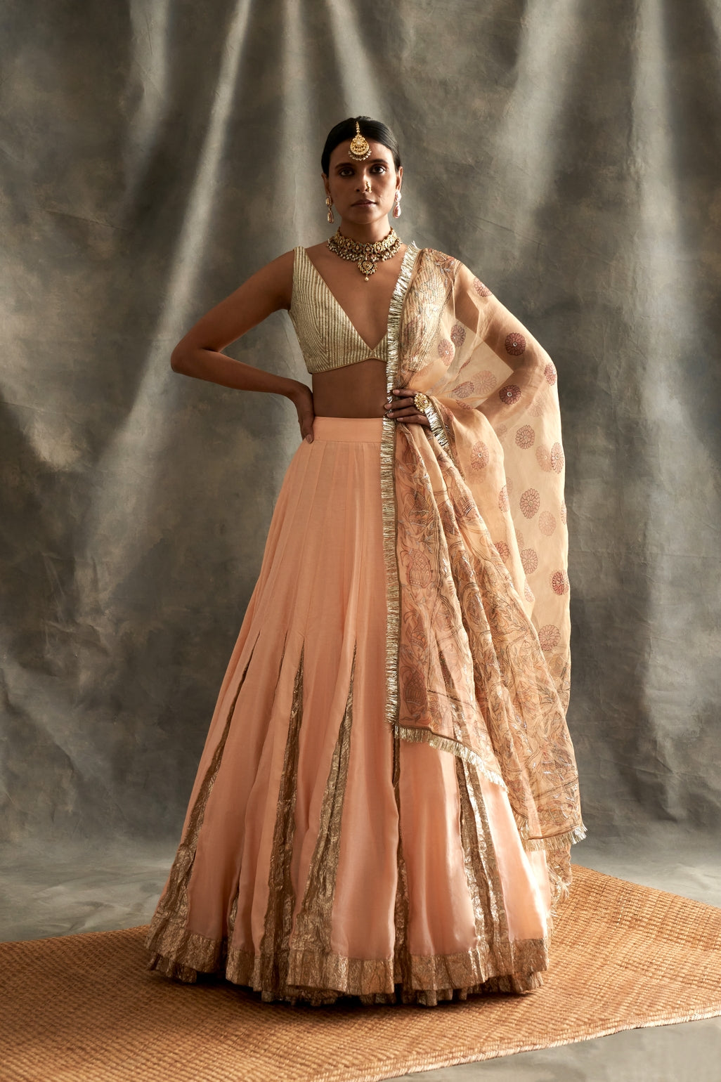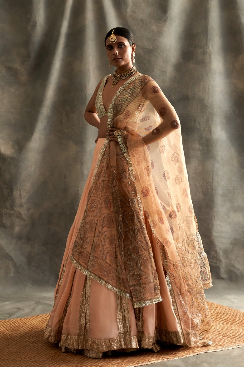 Peach Silk Chanderi Godet Lehenga With Lampi Inserts Teamed With A Lampi Textured Blouse. The Dupatta Is A Hand Painted Madhubani Silk Organza With Sequins Highlights