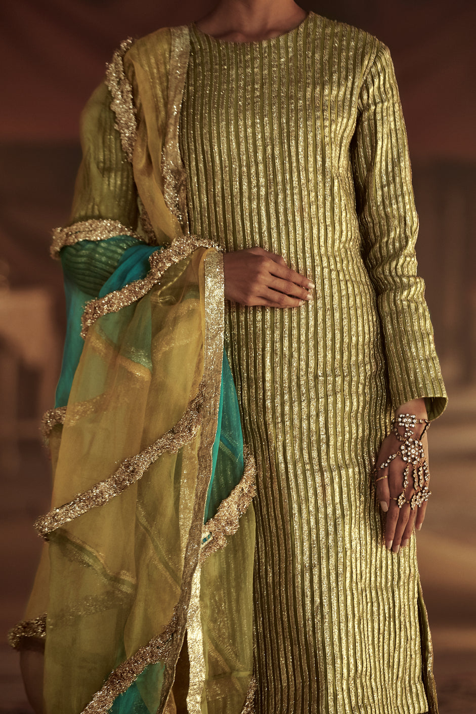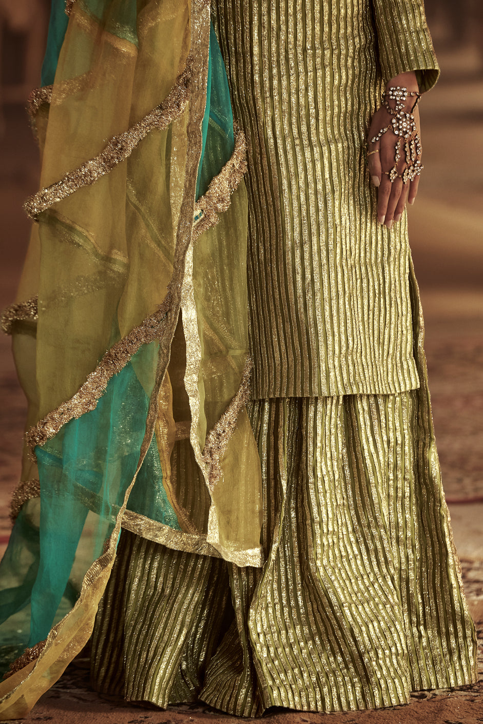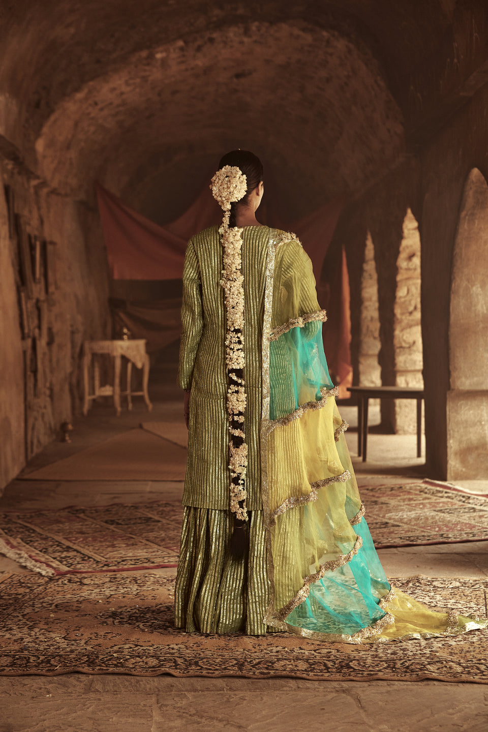 silk chanderi kurta sharara set with handmade lampi stripes teamed with Diagonally colour block silk organza dupatta highlighted and edged with fine kiran.
