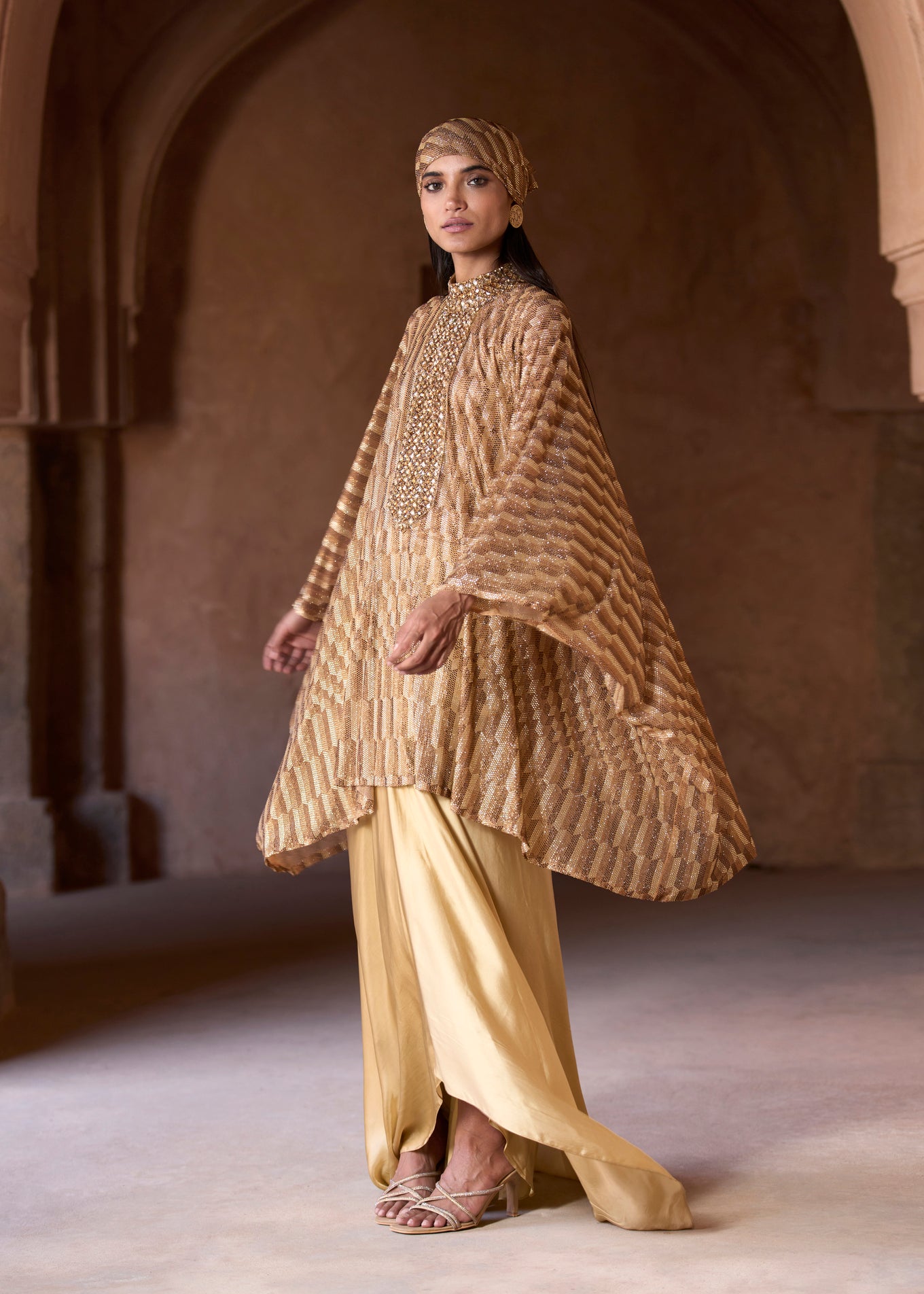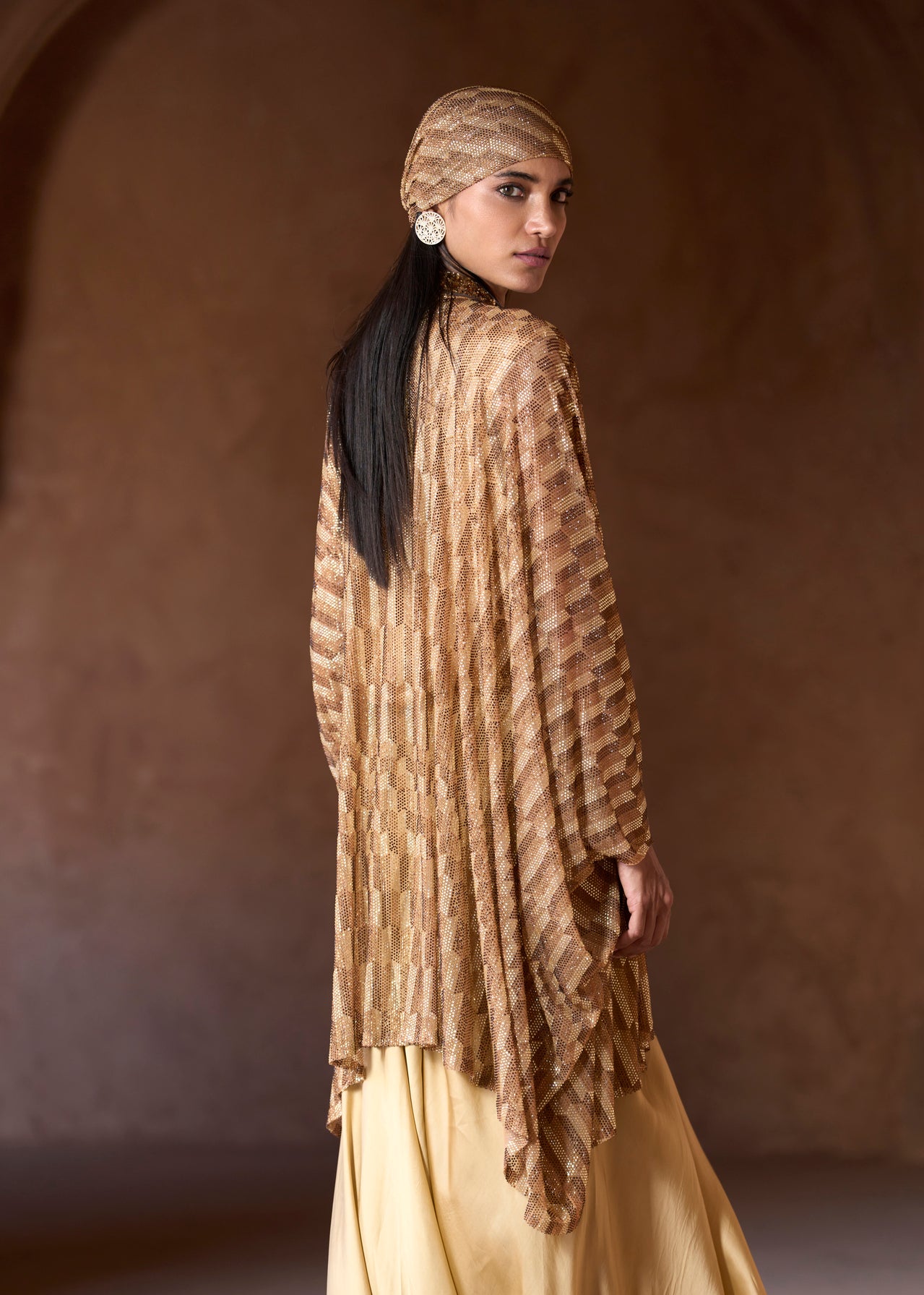 Crystal-embellished illusion print gold tunic with stone-embellished embroidered yoke, paired with a draped satin skirt along with a matching headgear accessory.