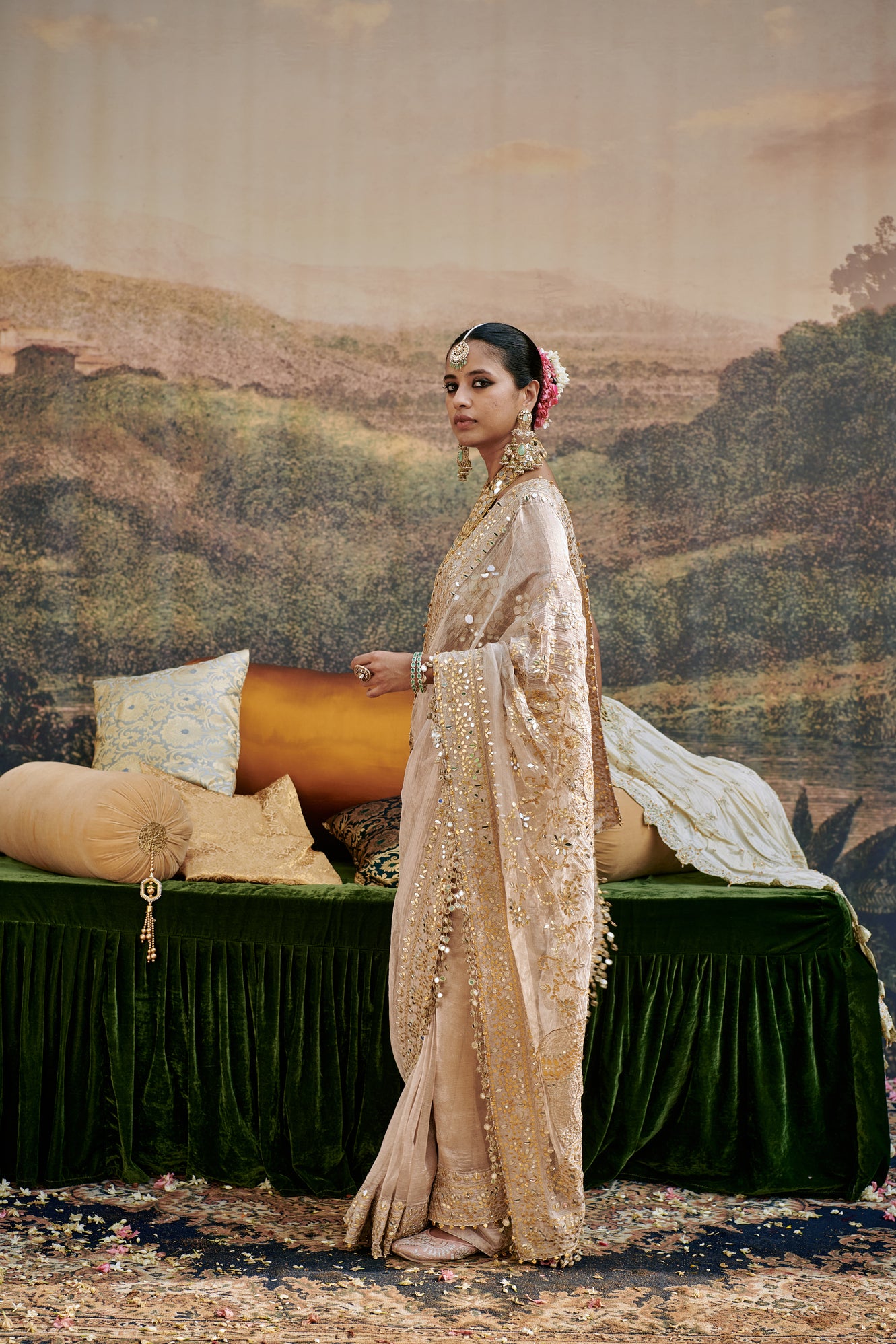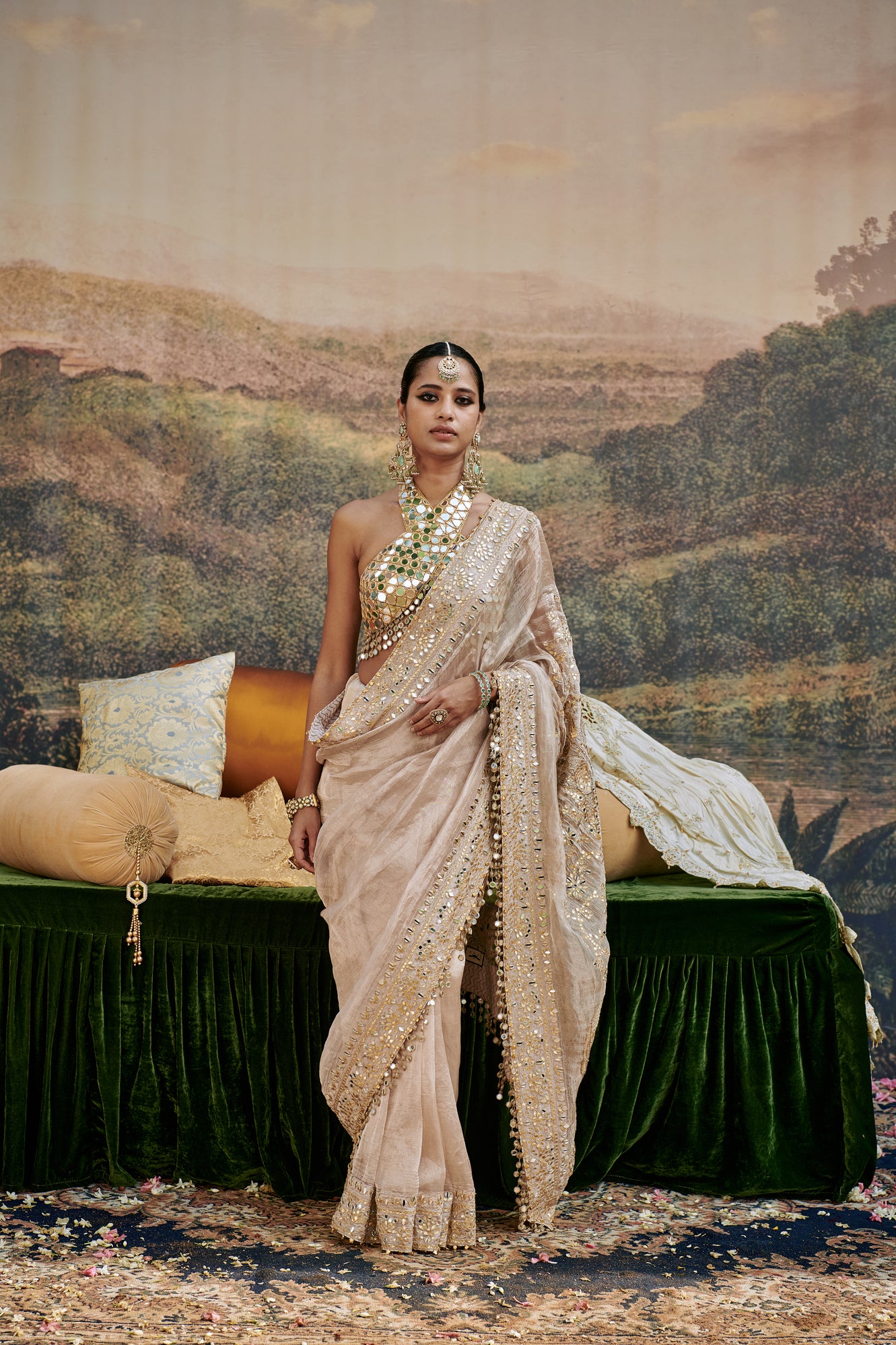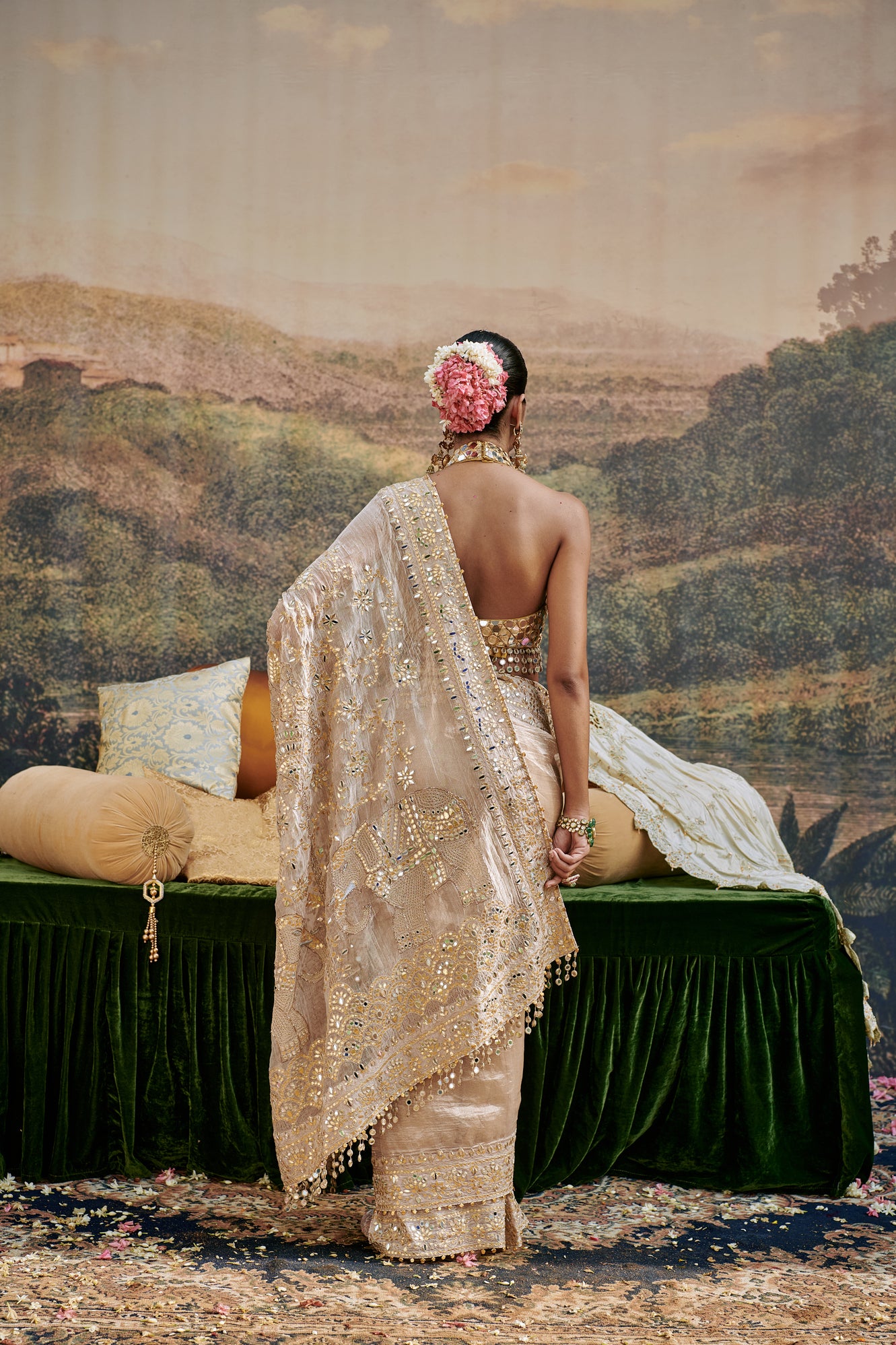 Ivory tissue saree paired with mirror work blouse on gota lined with chanderi silk , embellished with gota patti, ghungroos.