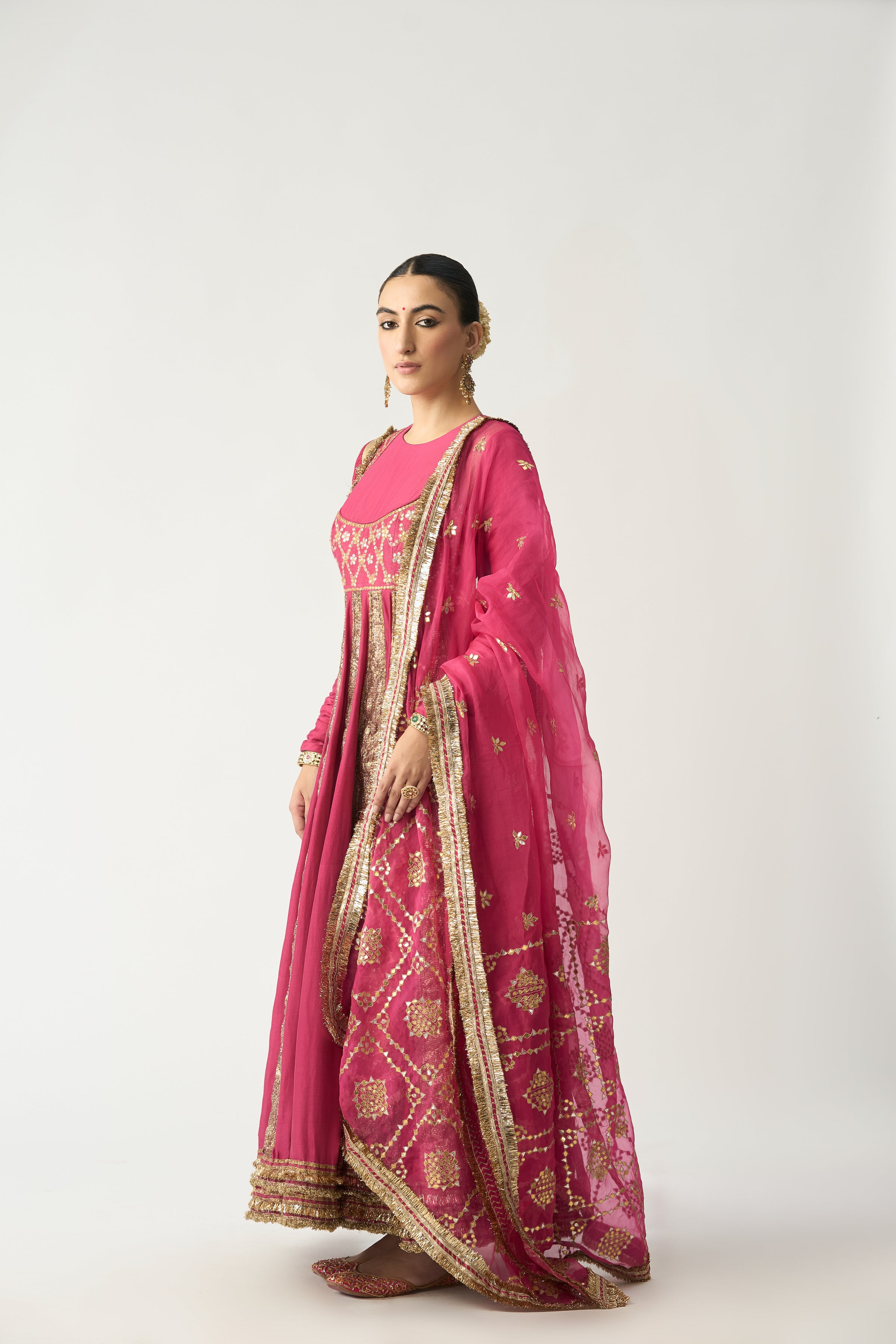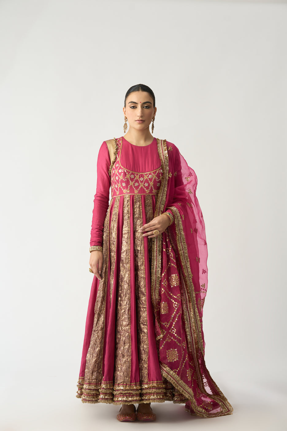 Product Info:- Purple Gold Lampi Lehenga and Blouse + Fuschia Silk Organza Gota Patti Dupatta Edged With Kiran
