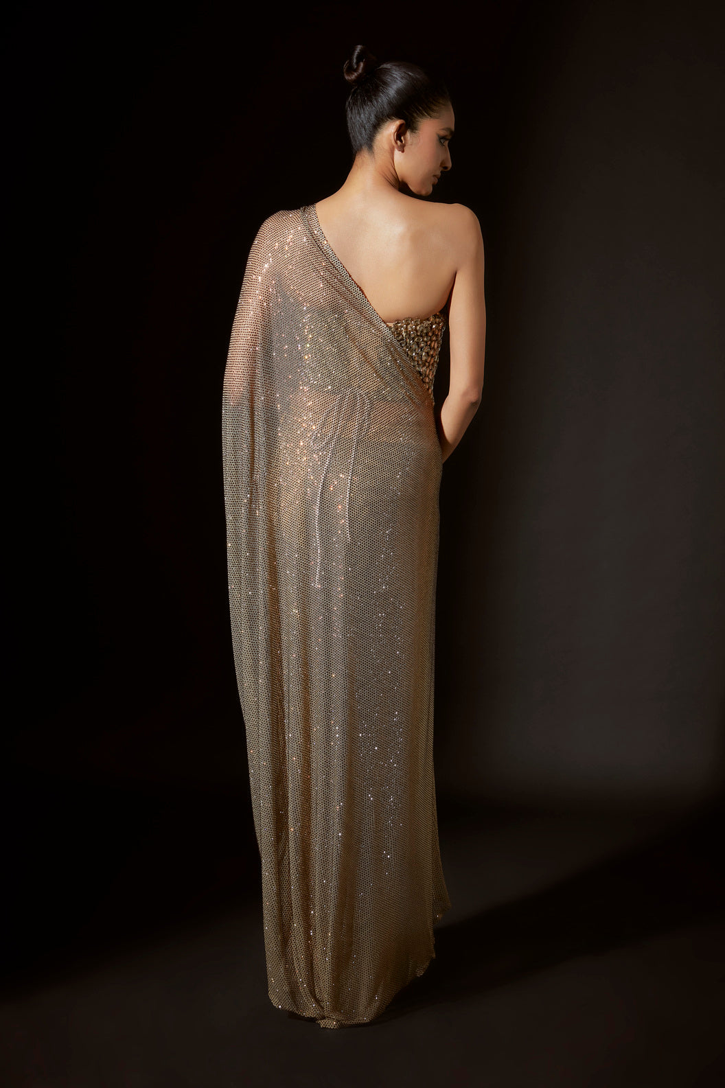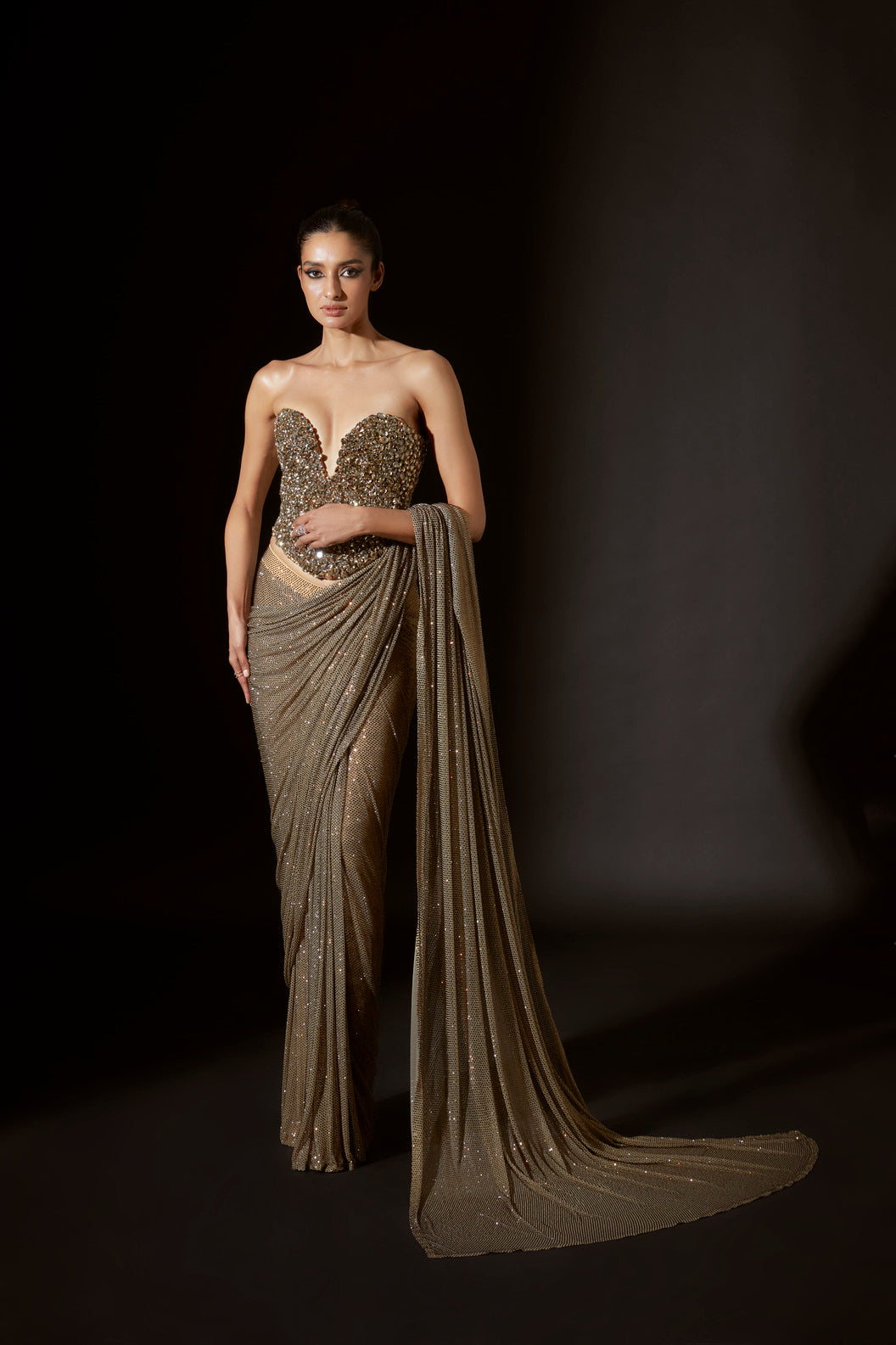 Gold jewel corset , adorned with dazzling big crystals, radiates glamour and allure, drawing eyes with its captivating sparkle. paired with dusky gold emebellished prestitched saree.