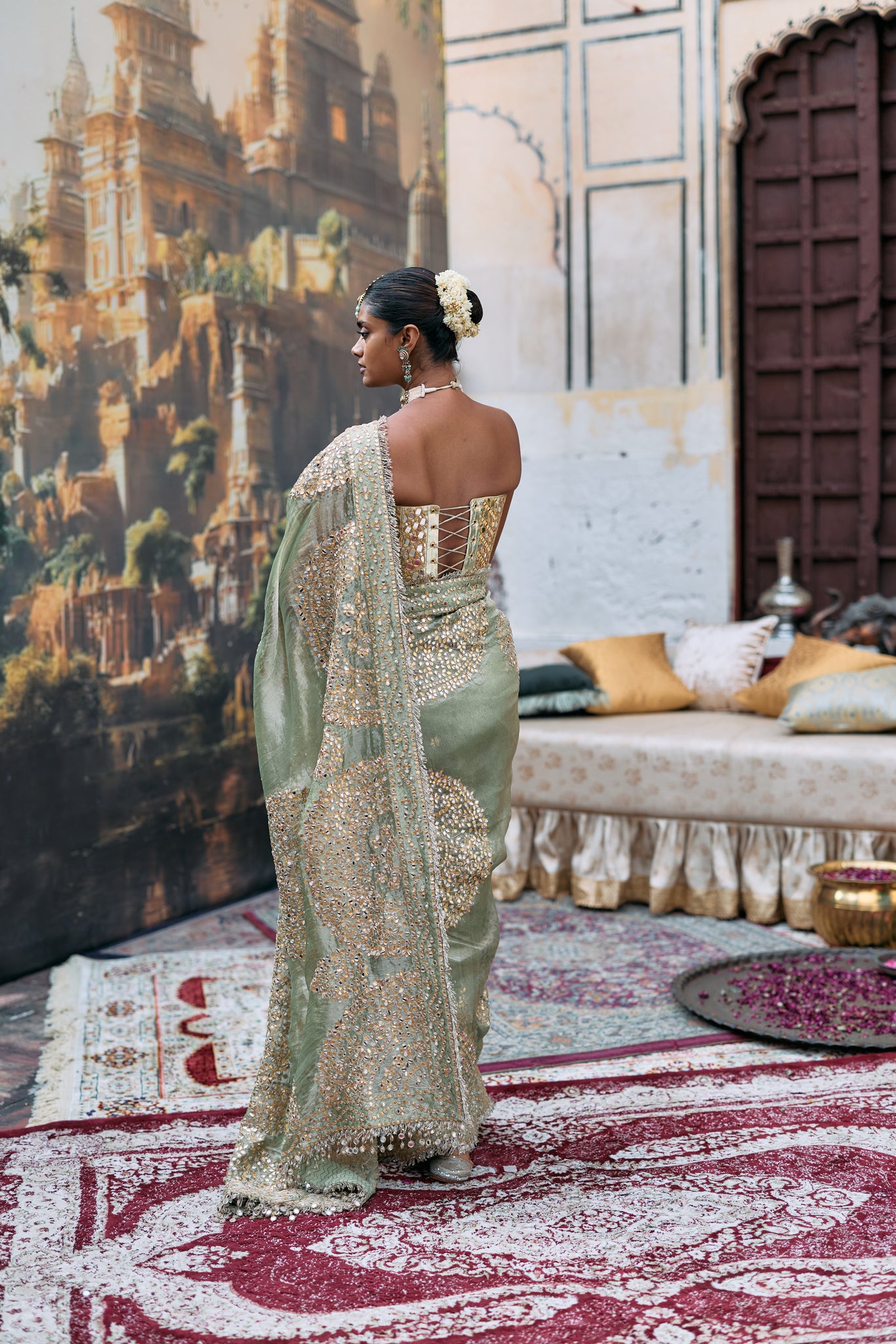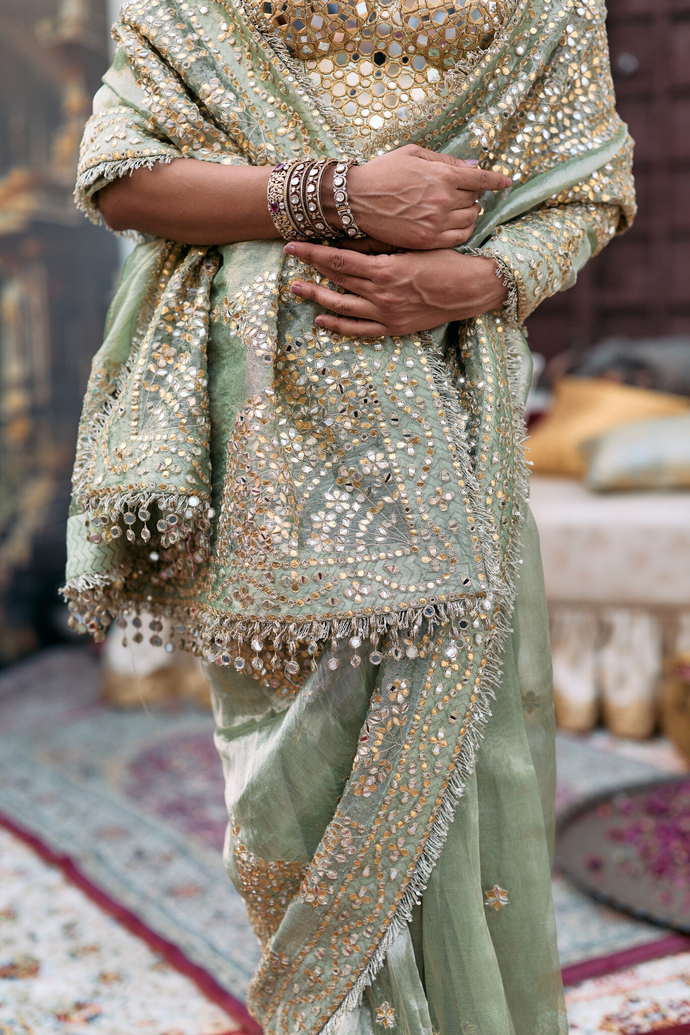 Our signature long mirror corset paired with tissue mirror and gotta embroidered green saree.