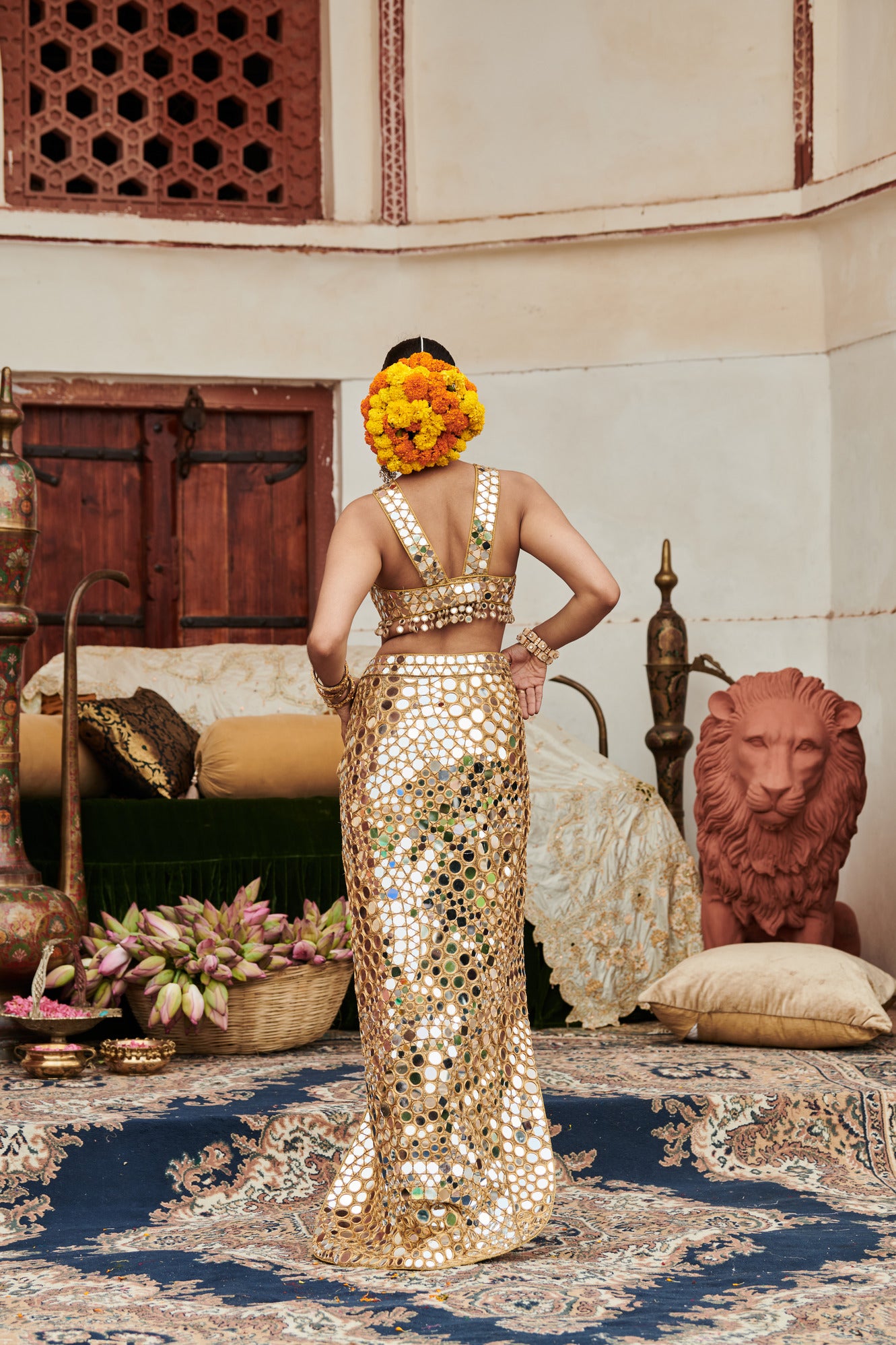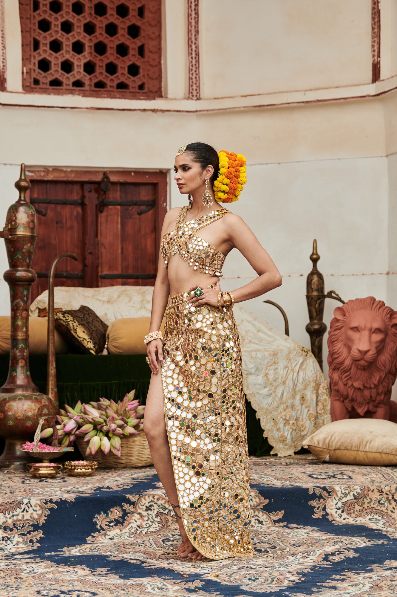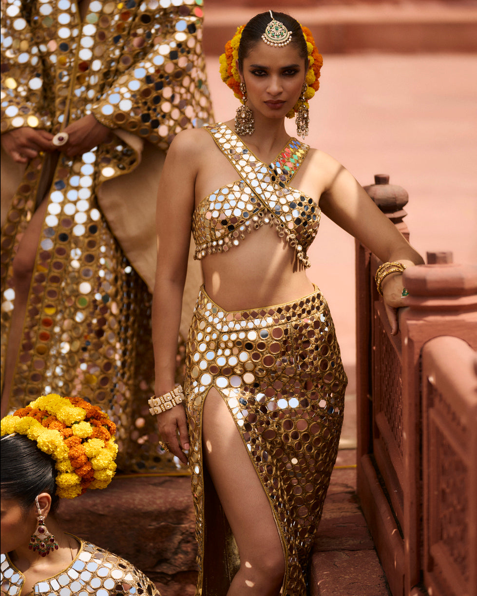 The mirror work skirt on gota lined with chanderi silk is adorned entirely with intricate mirror detailing featuring a stylish slit, and paired with criss-cross halter blouse.