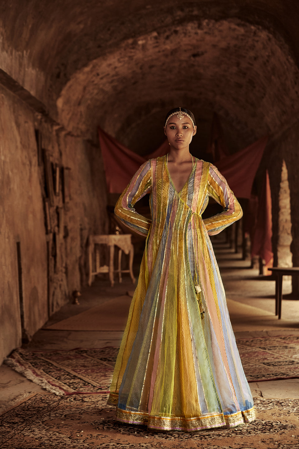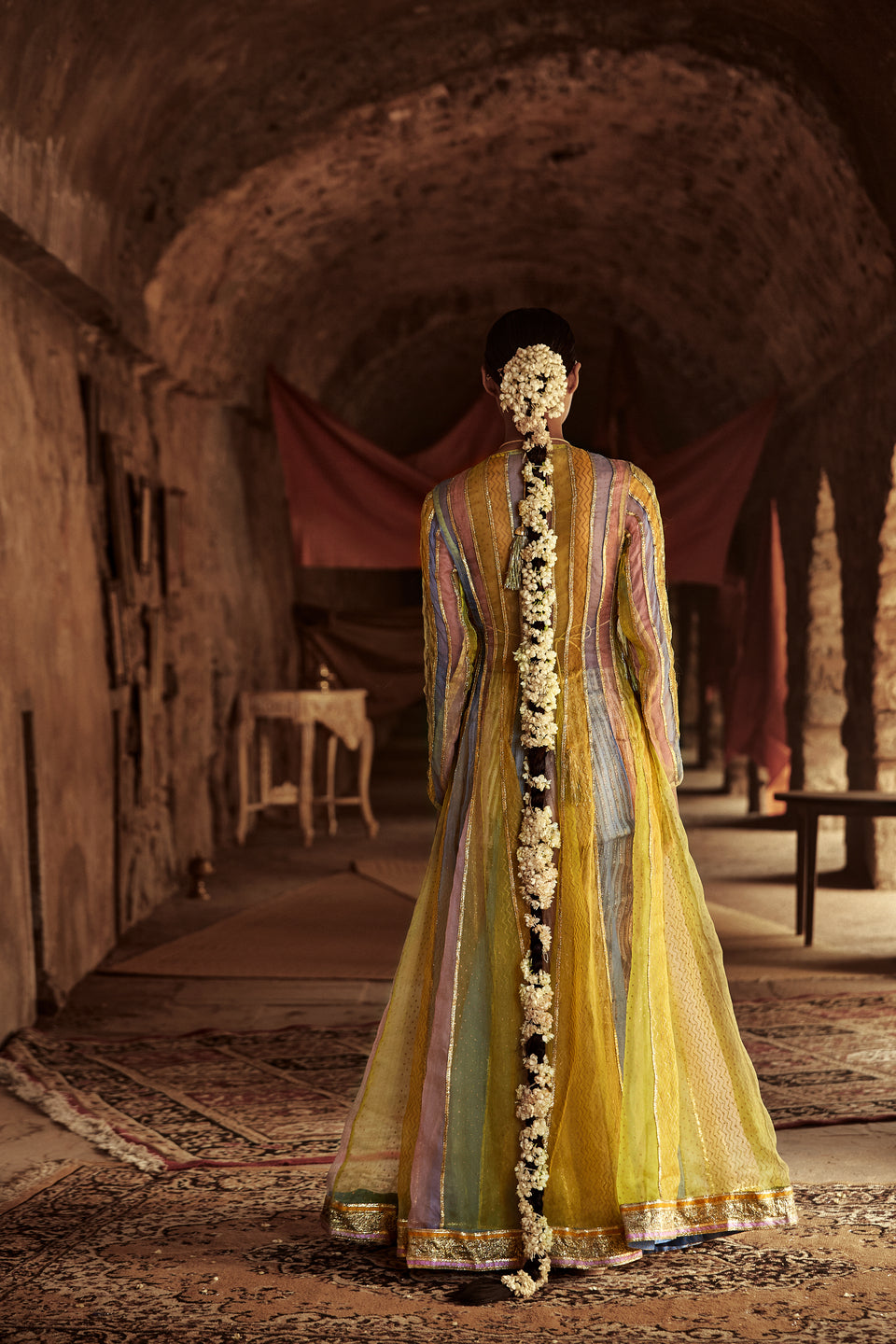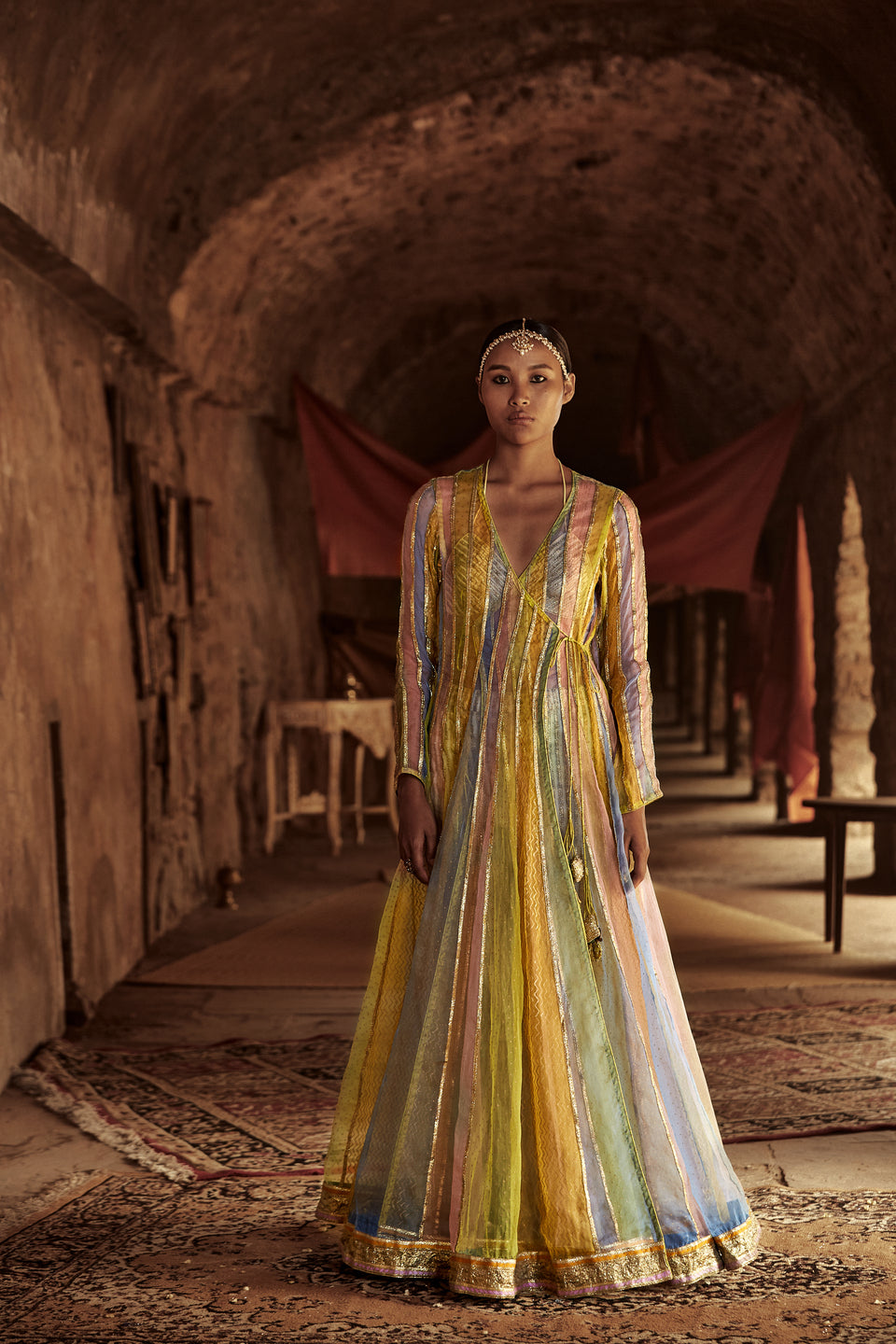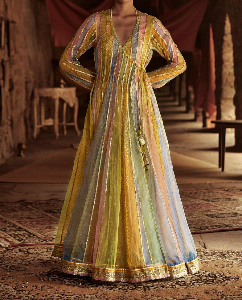 Silk organza khadi block printed panelled angrakha reinforced with lampi strips bordered with kadhi and lampi. The inner is a handmade metallic stripes bralette and fitted pants in cotton lycra.