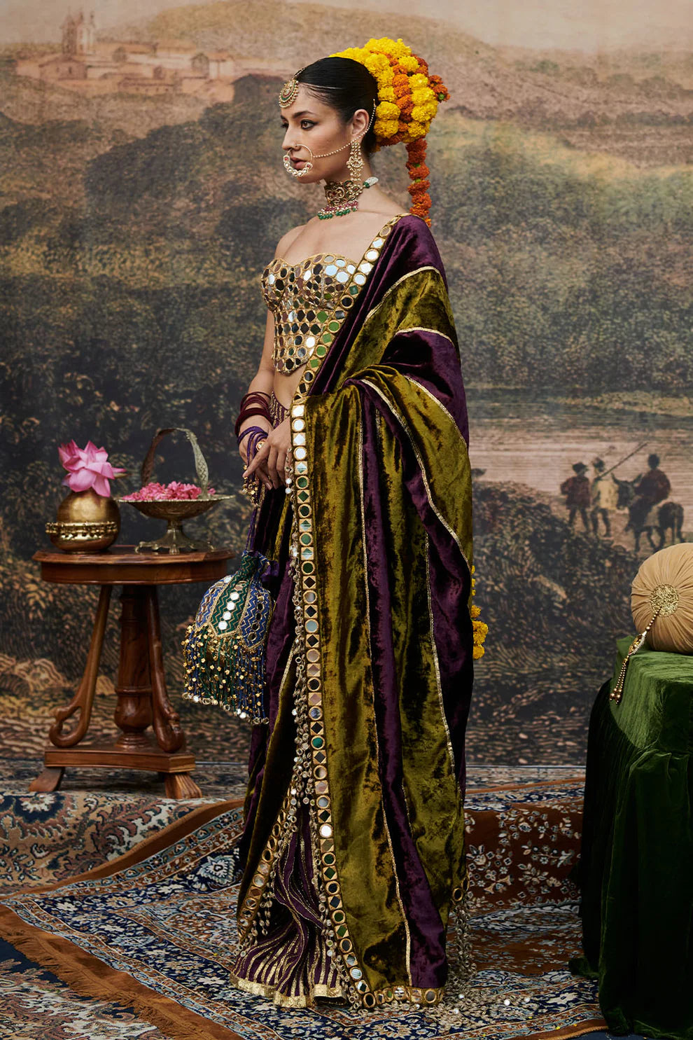 Velvet Olive and green panelled saree styled with mirror work corset blouse on gota lined with chanderi silk.