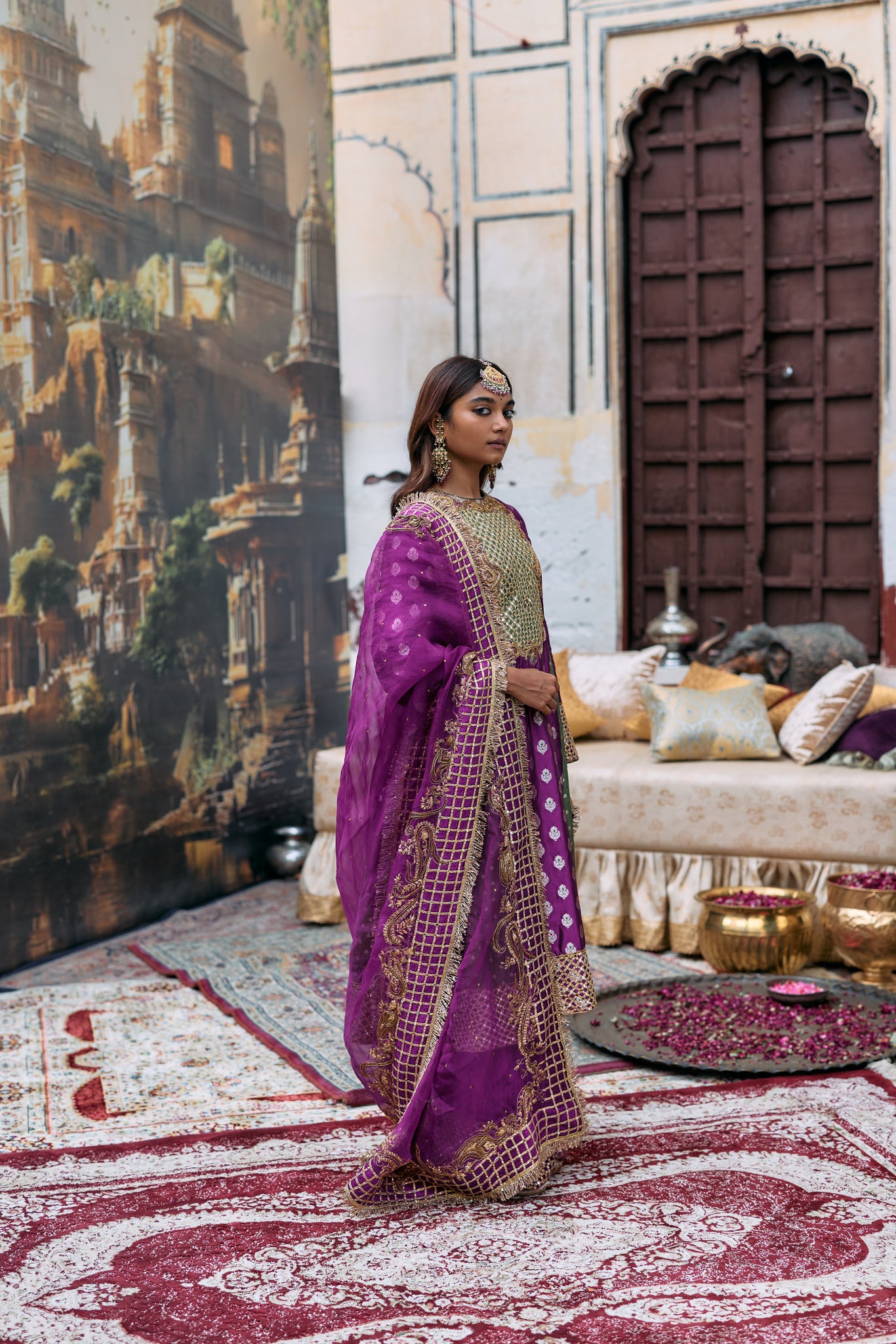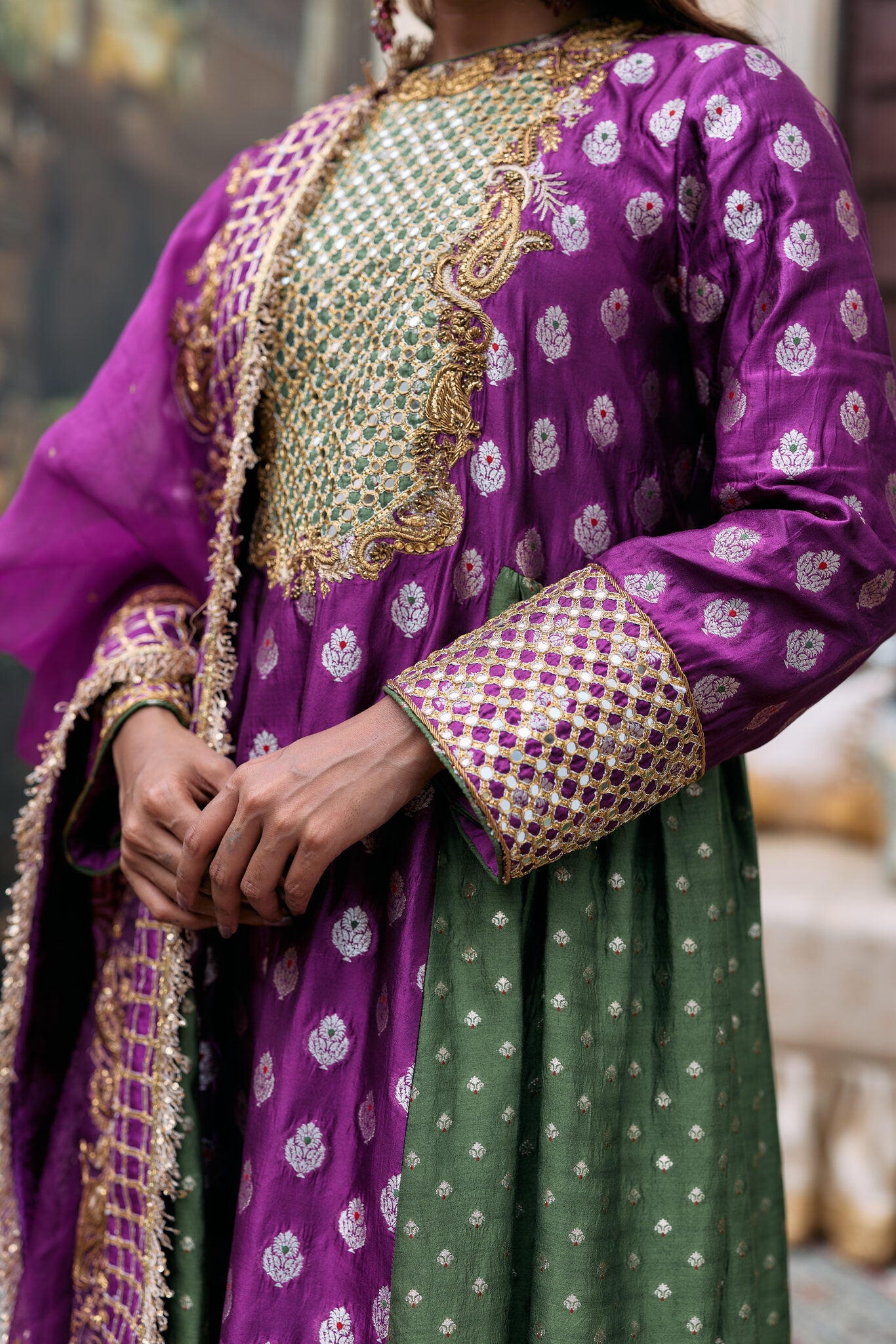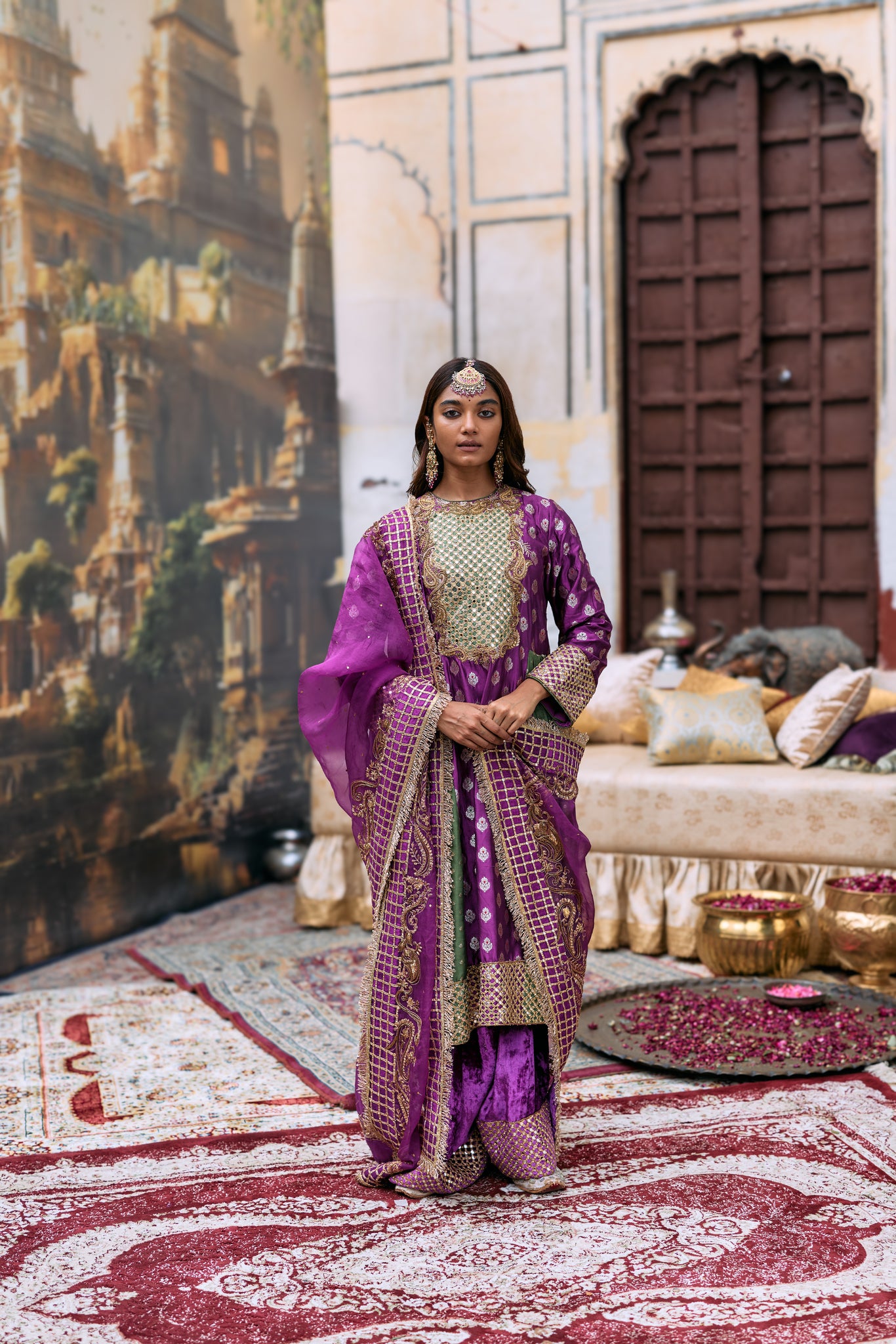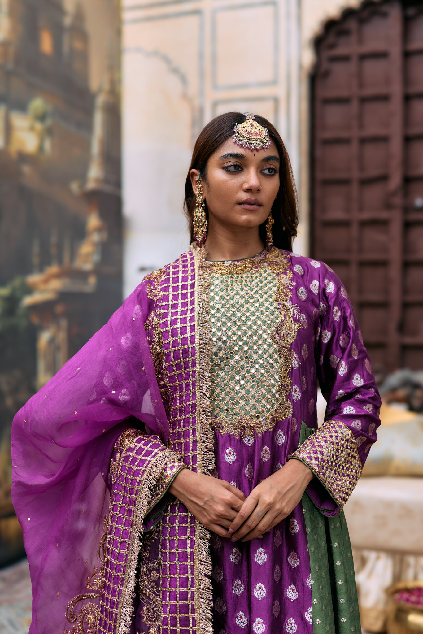 An A-line colorblock gathered pleats kurta adorned with mirror jaal embroidery, paired with velvet salwar and a heavy embroidered dupatta.