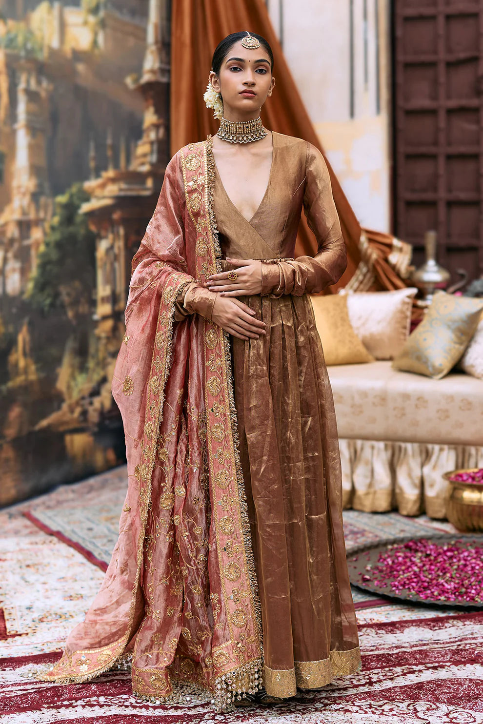 An Anarkali, paired with churidar and a heavily embroidered dupatta.