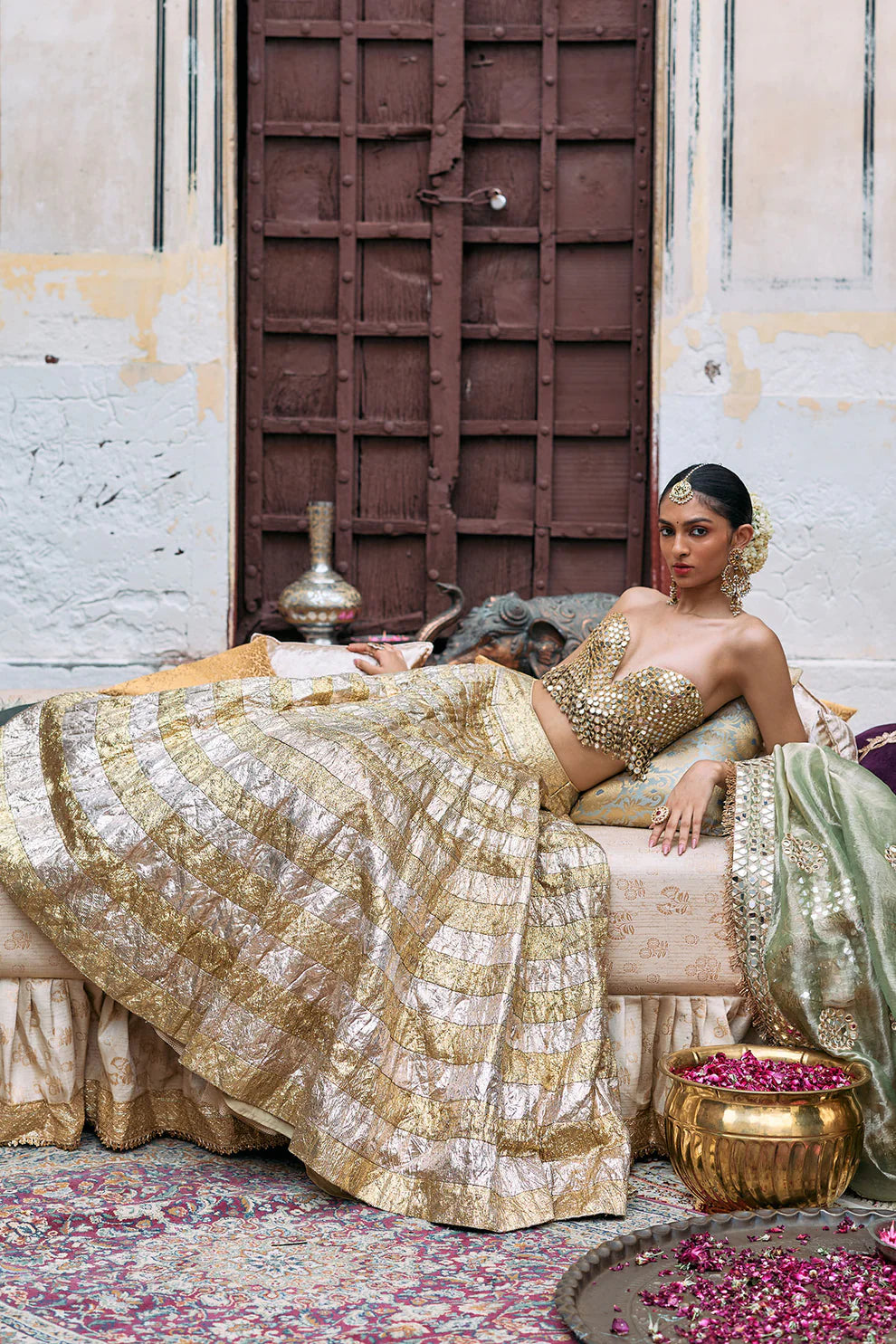 A gold and silver horizontal lampi lehenga with bold metallic shine. Paired with a mirror lace corset featuring playful fringes and a green tissue dupatta with intricate hand-embroidered mirror work.