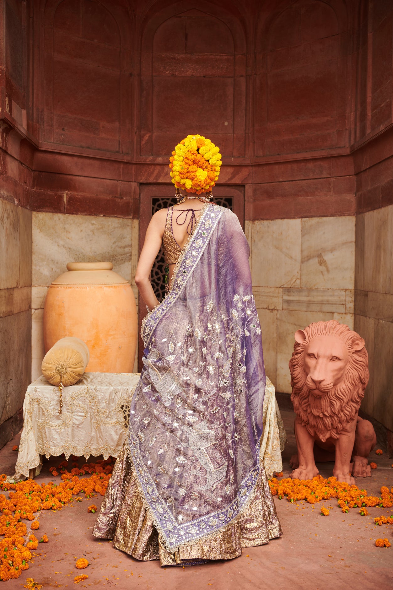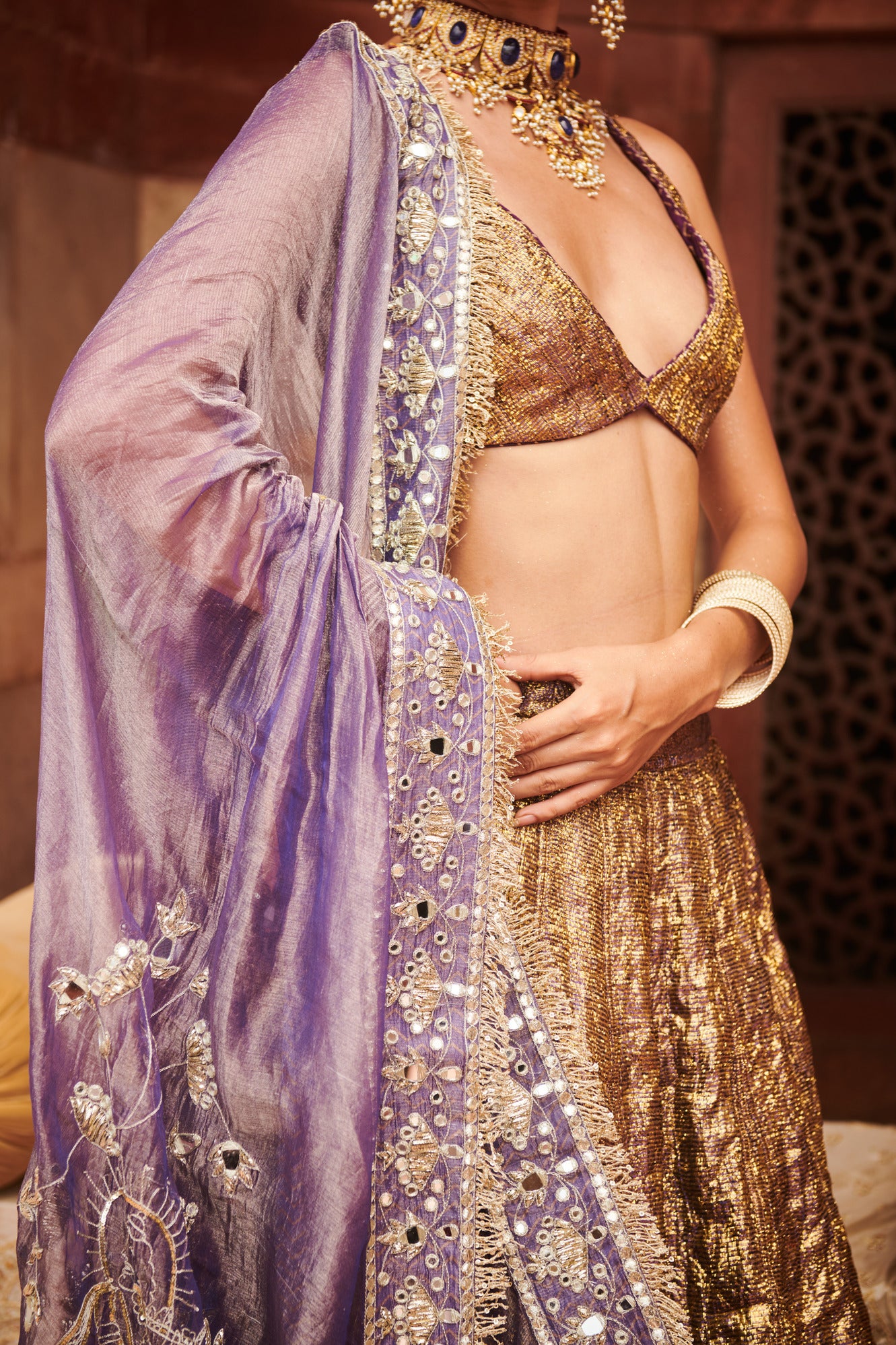 Purple lampi Lehenga with sleeveless blouse is paired with purple organza krishna leela embroidery work in silver mirror and sequins dupatta.