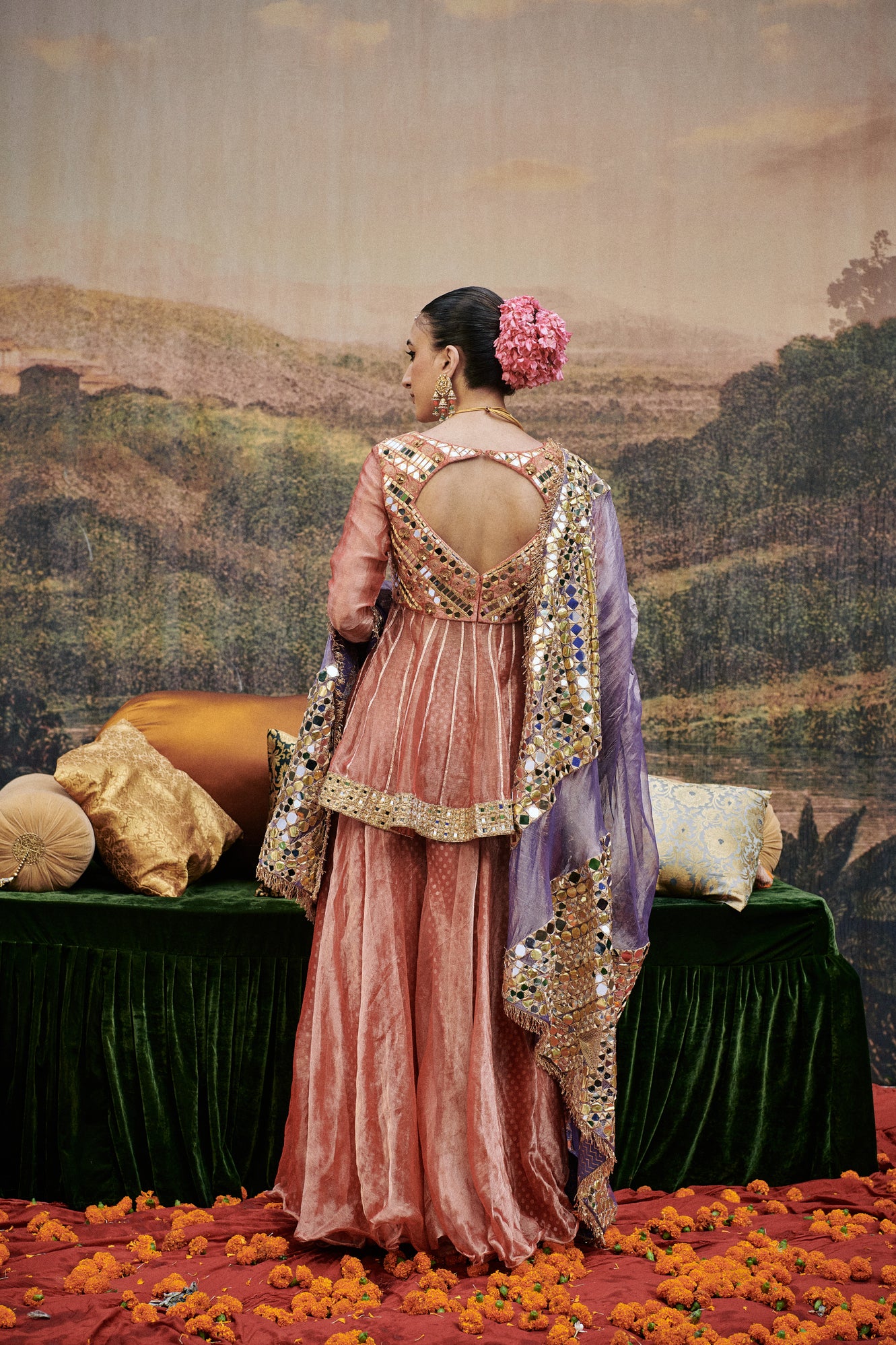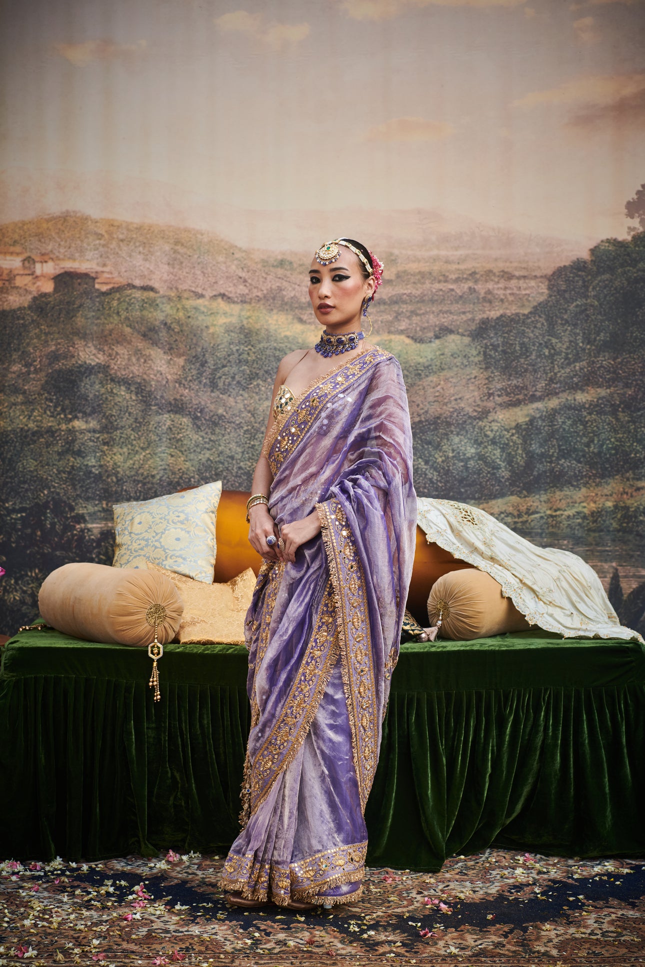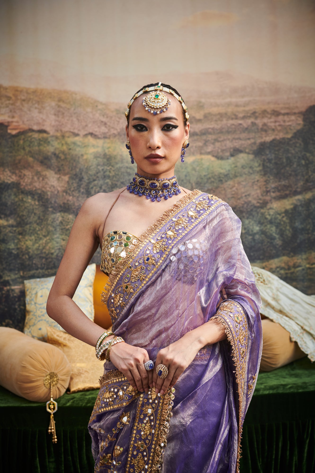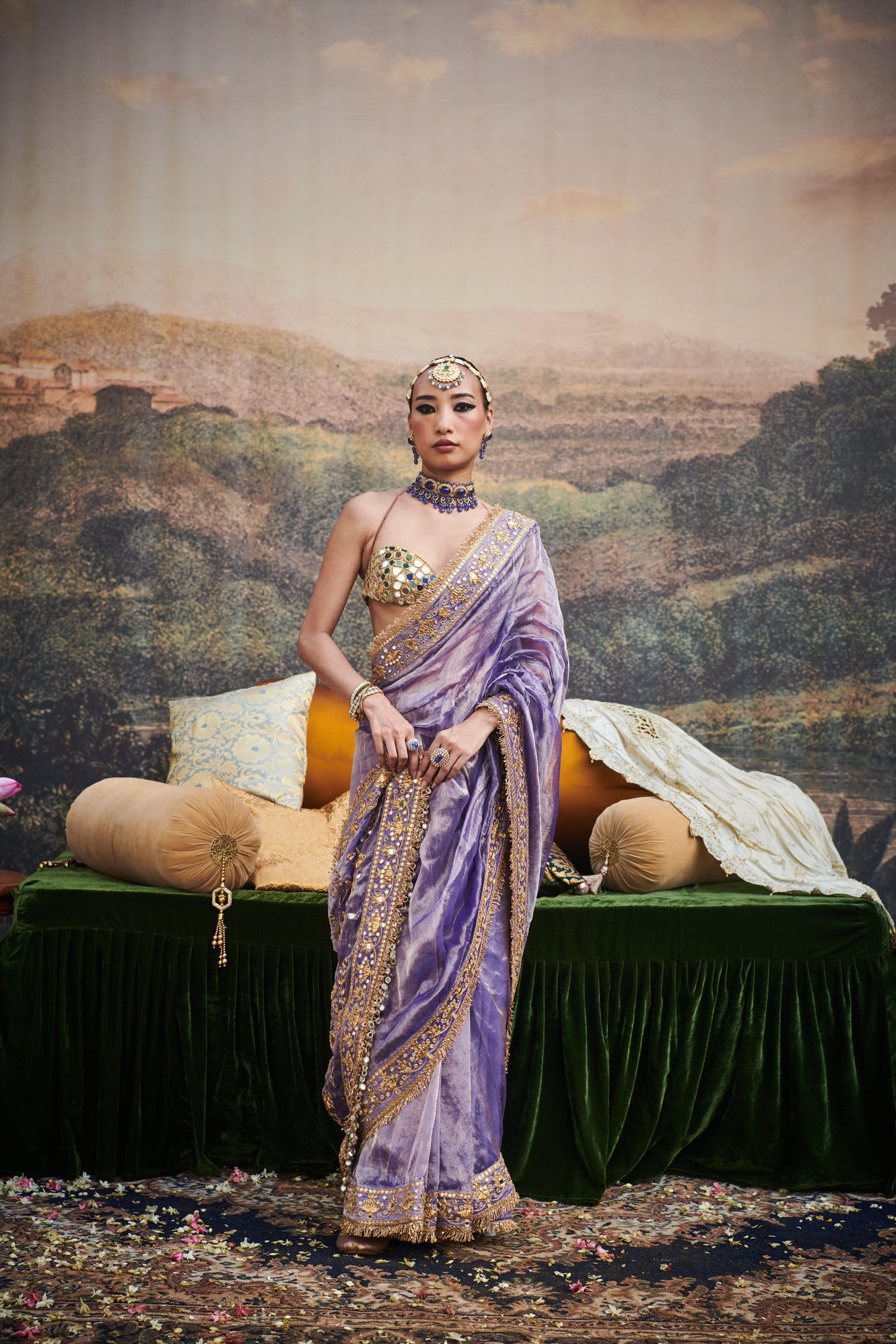 The saree features a delicate tissue fabric with ghungroo embellishments with mirror work blouse on gota lined with chanderi silk and details on border with gota patti and mirrors .