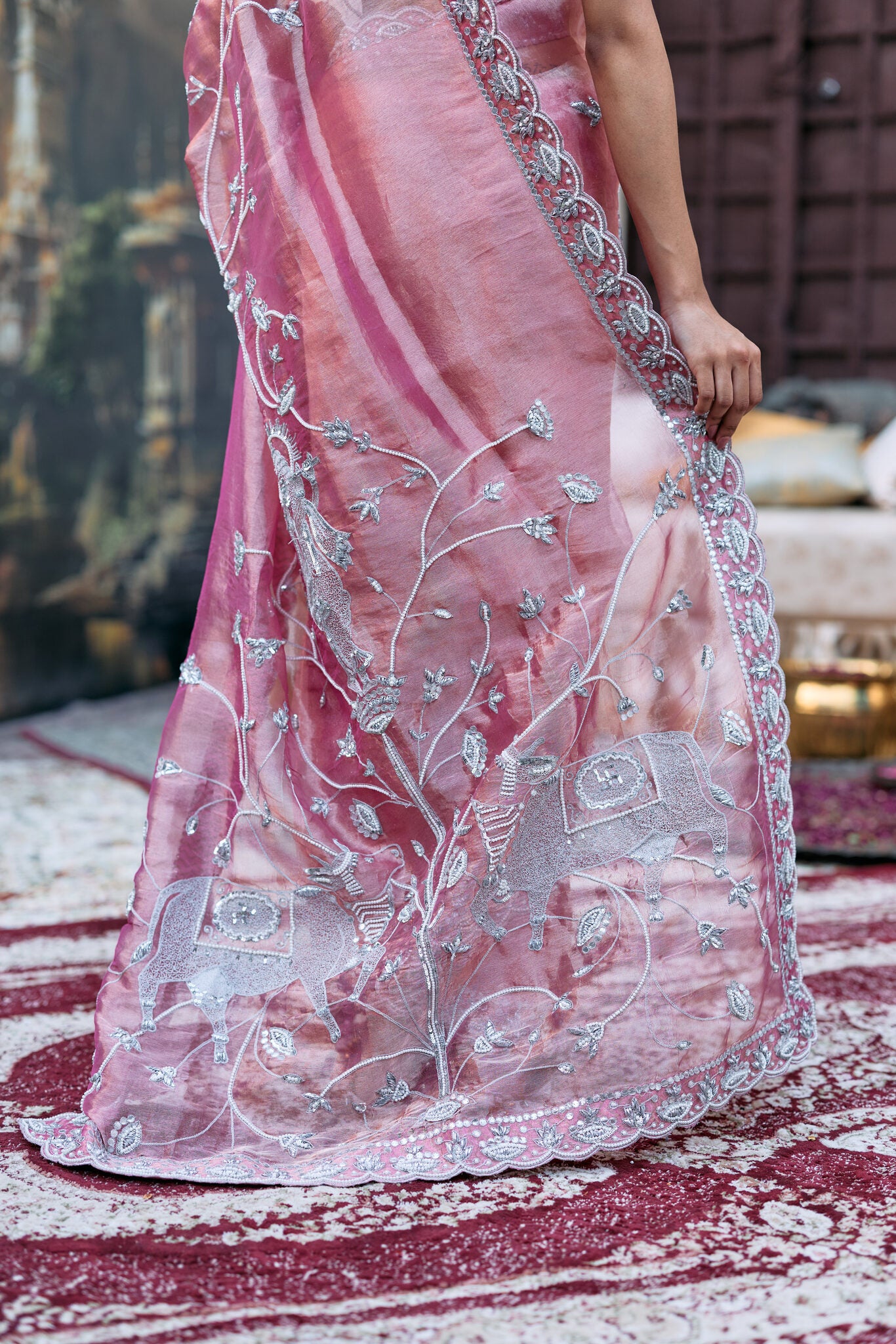 Pink tissue saree with an intricately embroidered palla and border, paired with a signature rose gold mirror blouse.