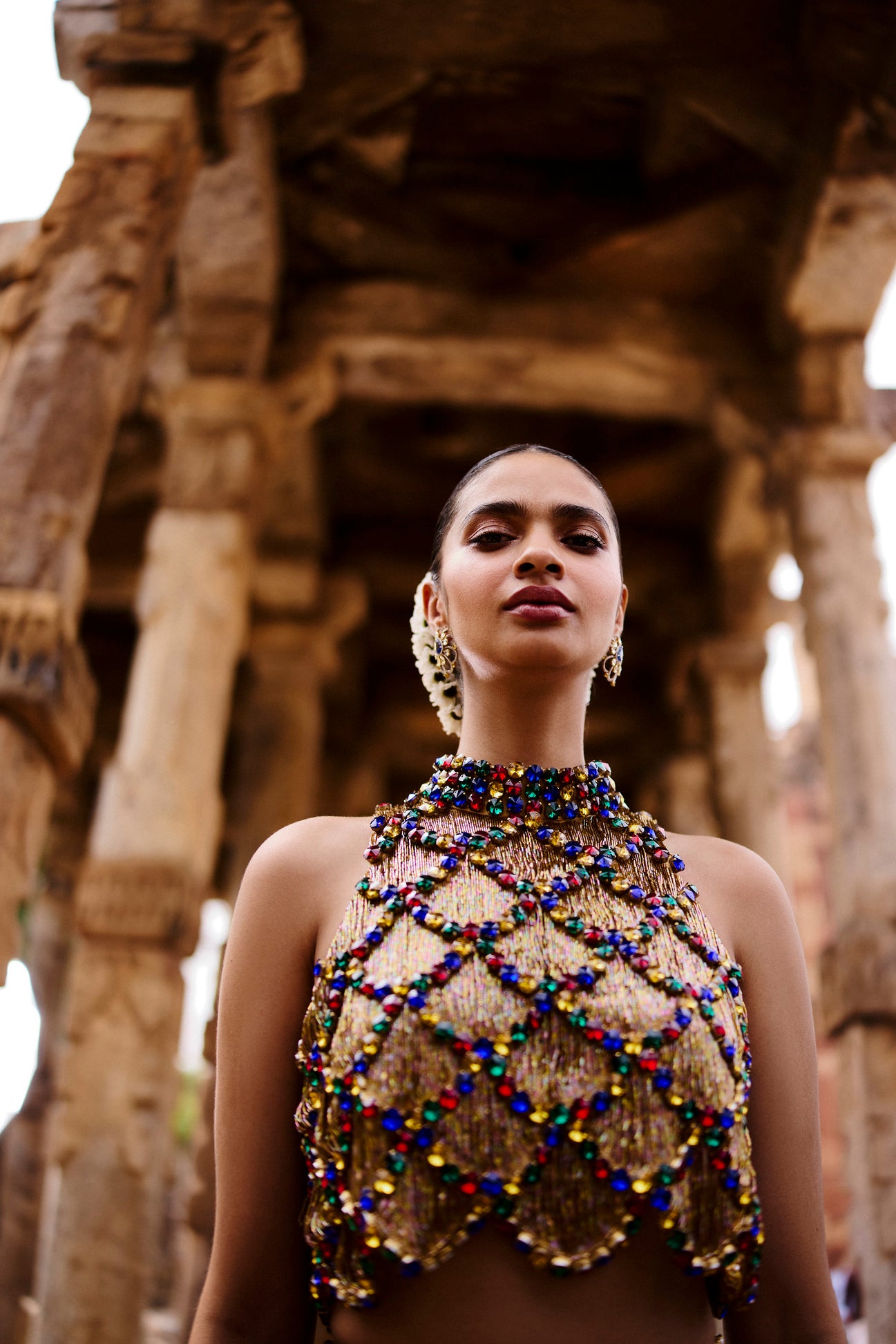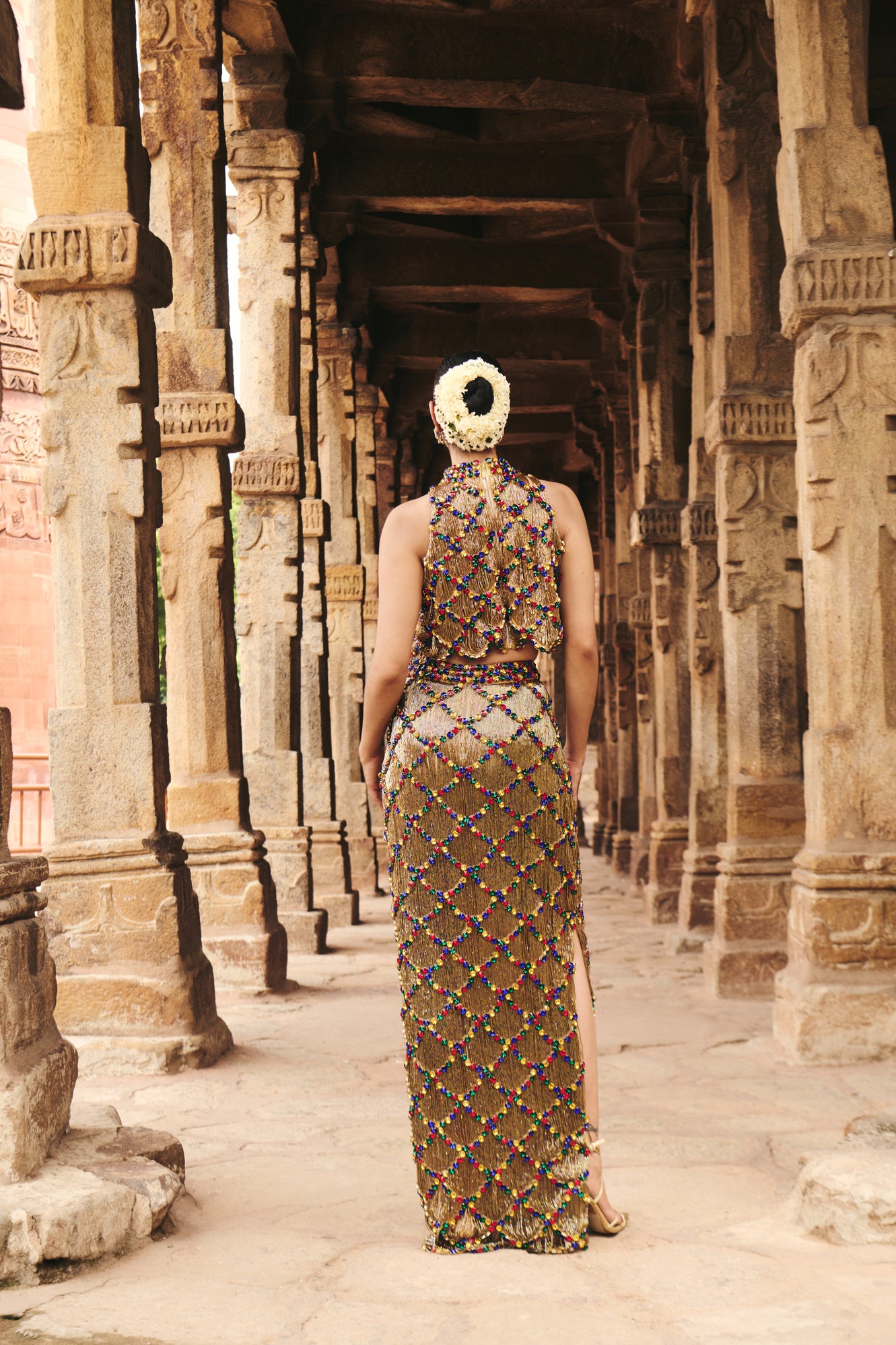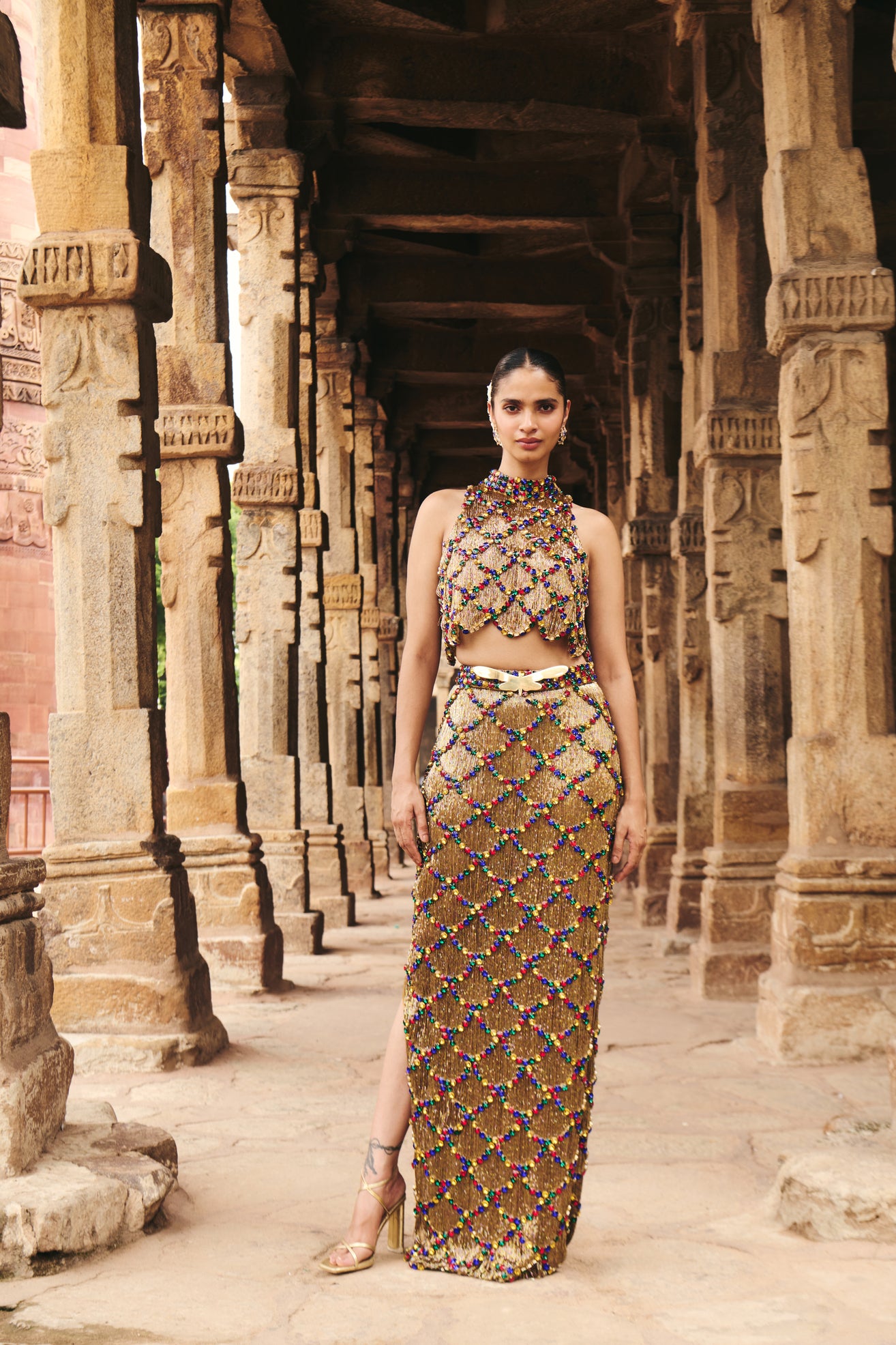 Gold Lattice skirt and top with cut dana work on net lining all over, and multi coloured stones set into a lattice pattern. The skirt features our custom brand logo on the belt.