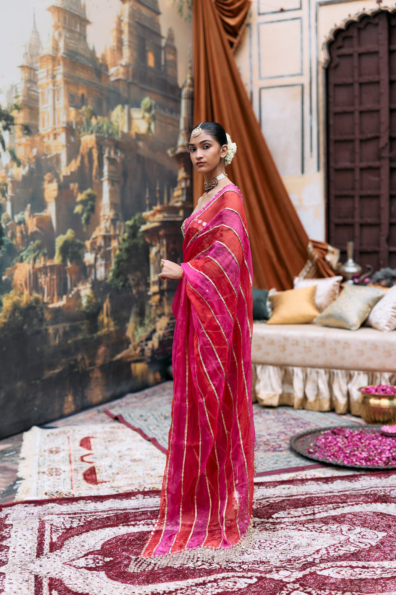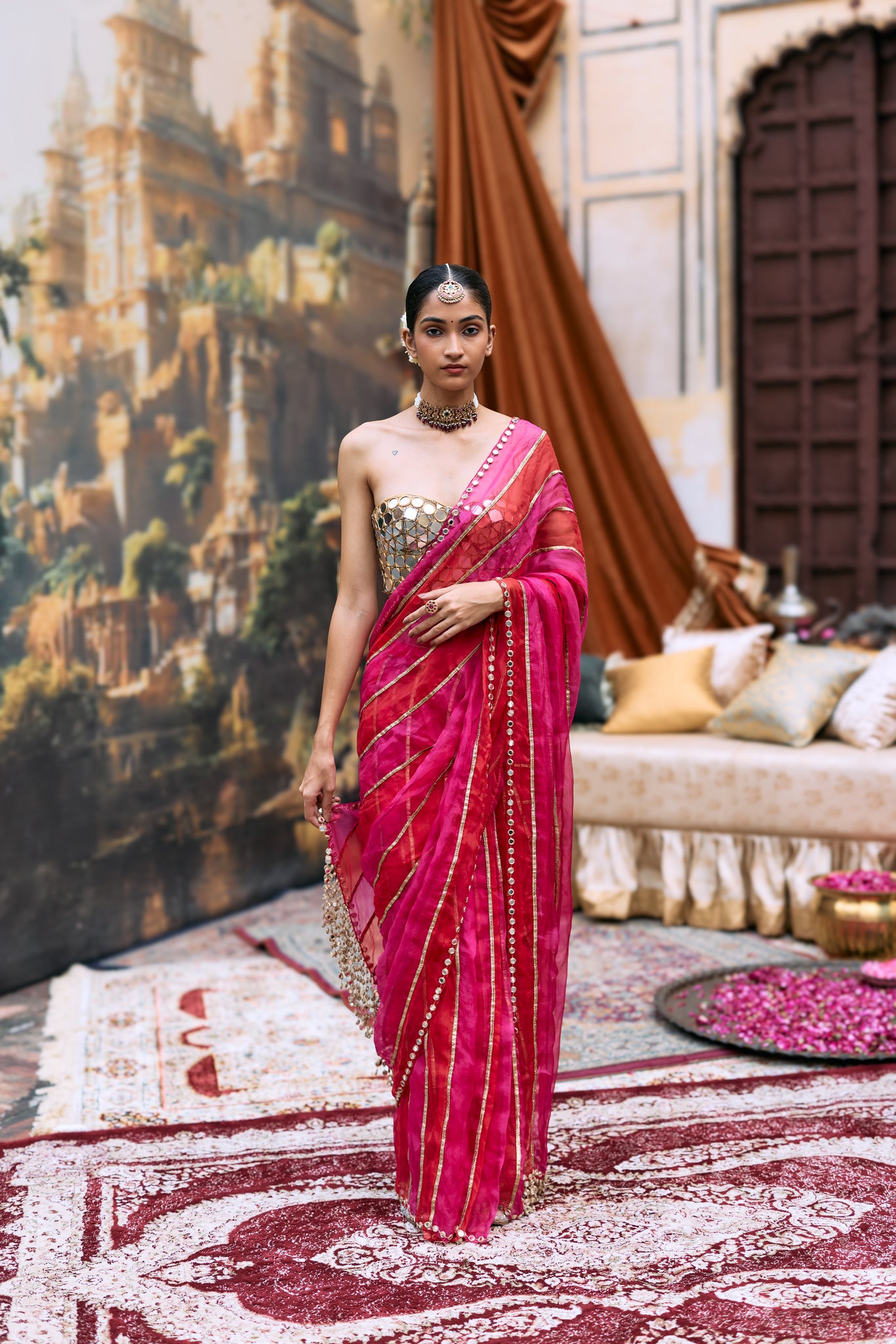 This is a saree in pink and red tissue stripes. It has a gota detailing. The saree is paired with a mirror corset.