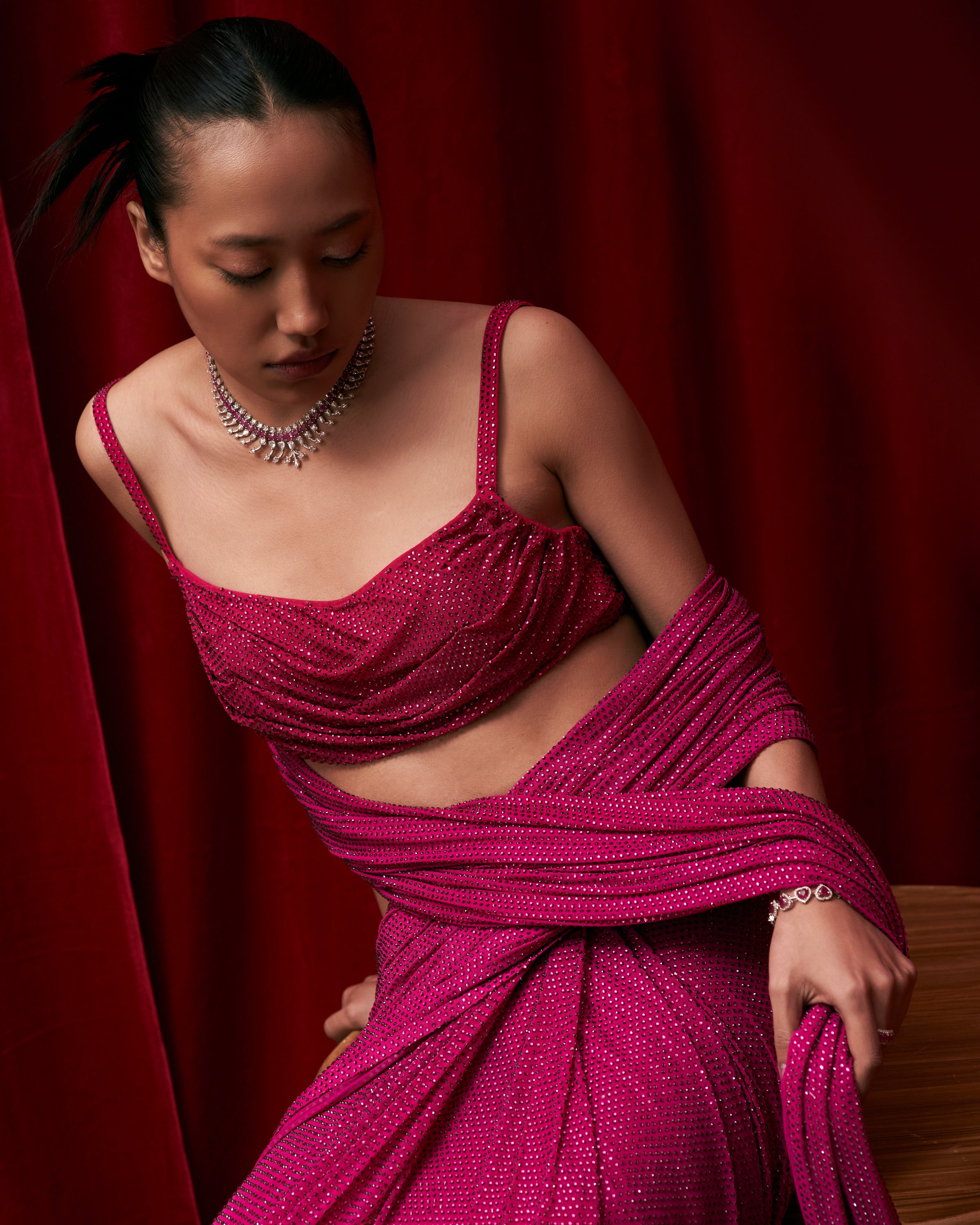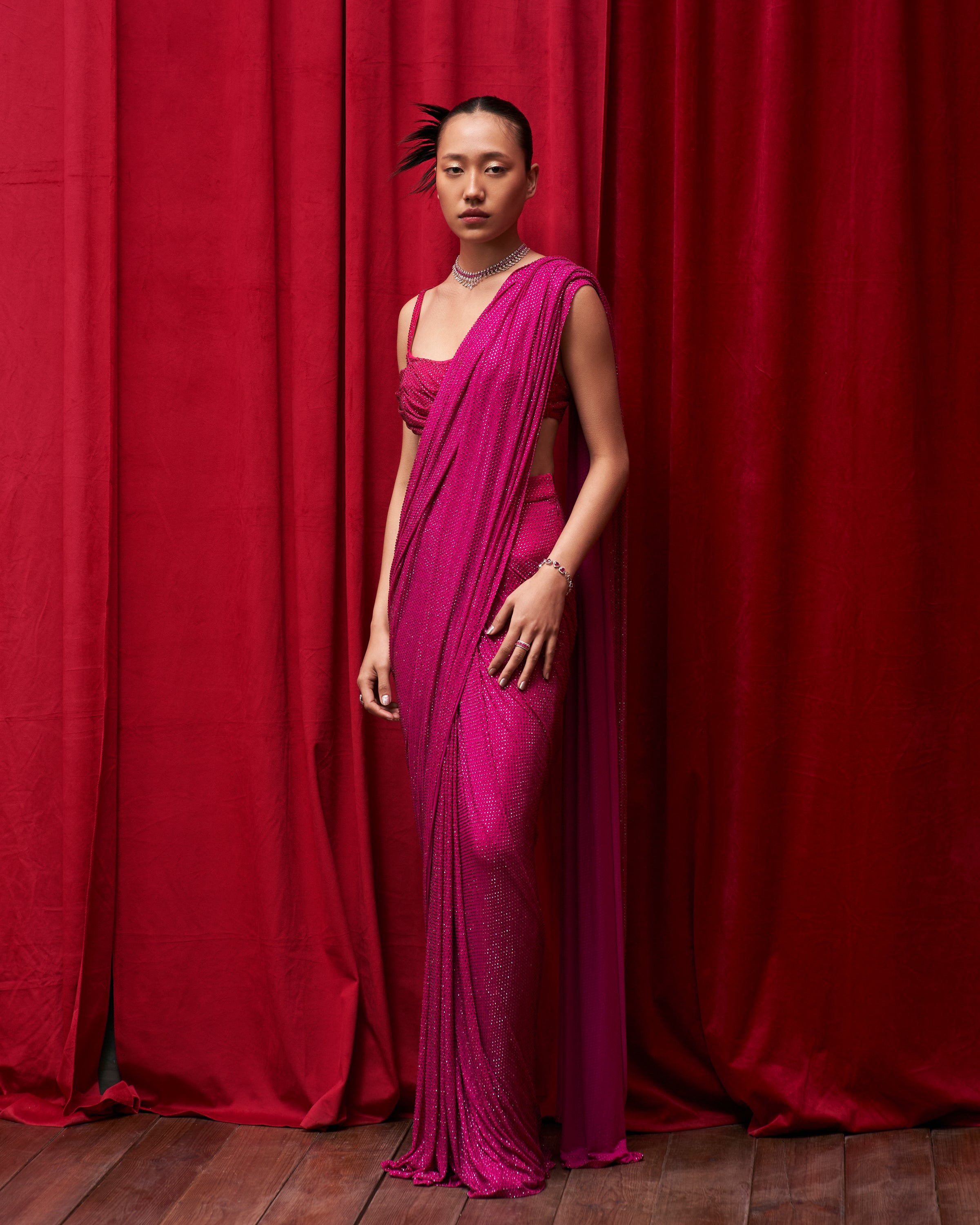 Magenta pink crystal embellished restitched saree paired with a ruched strappy blouse.