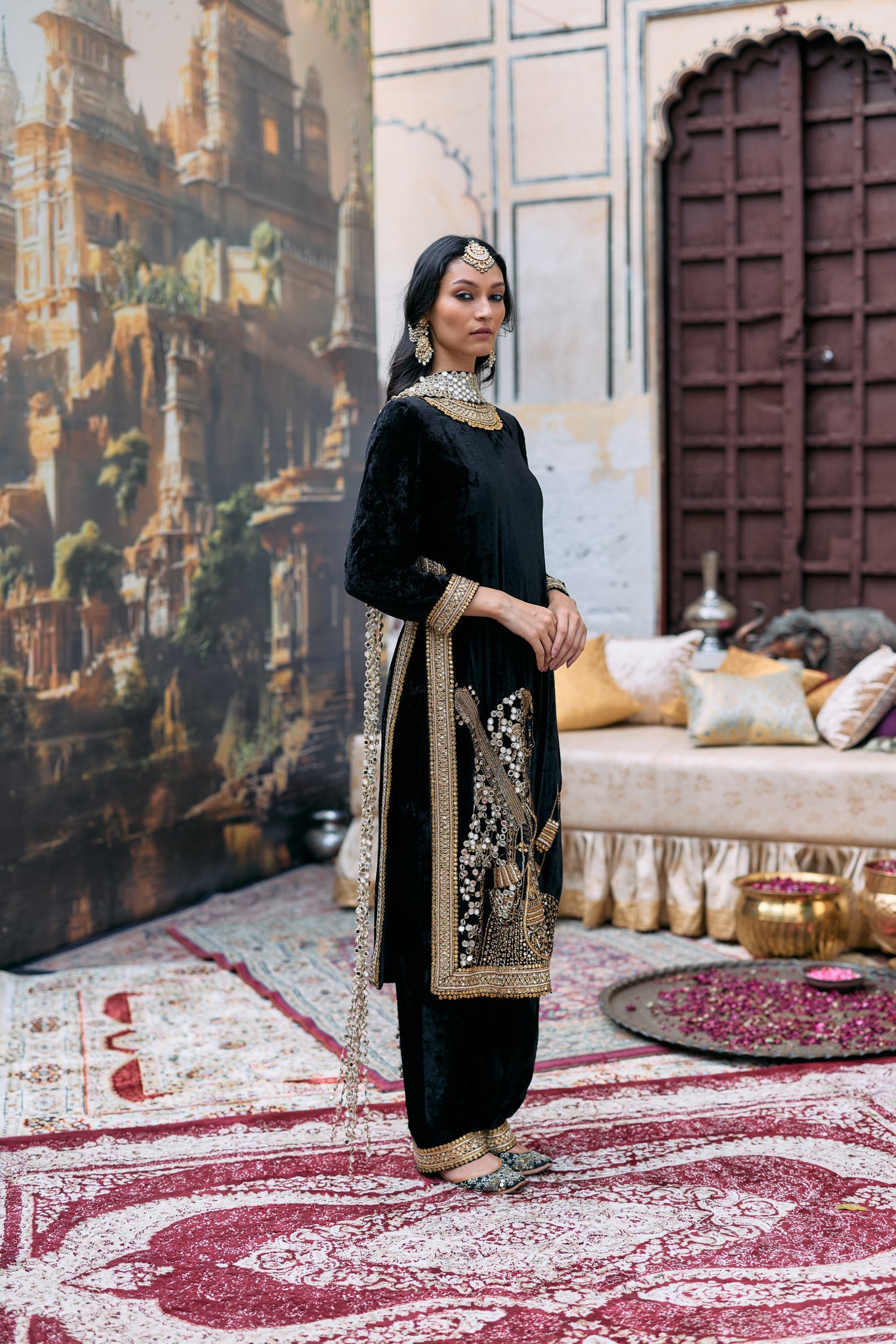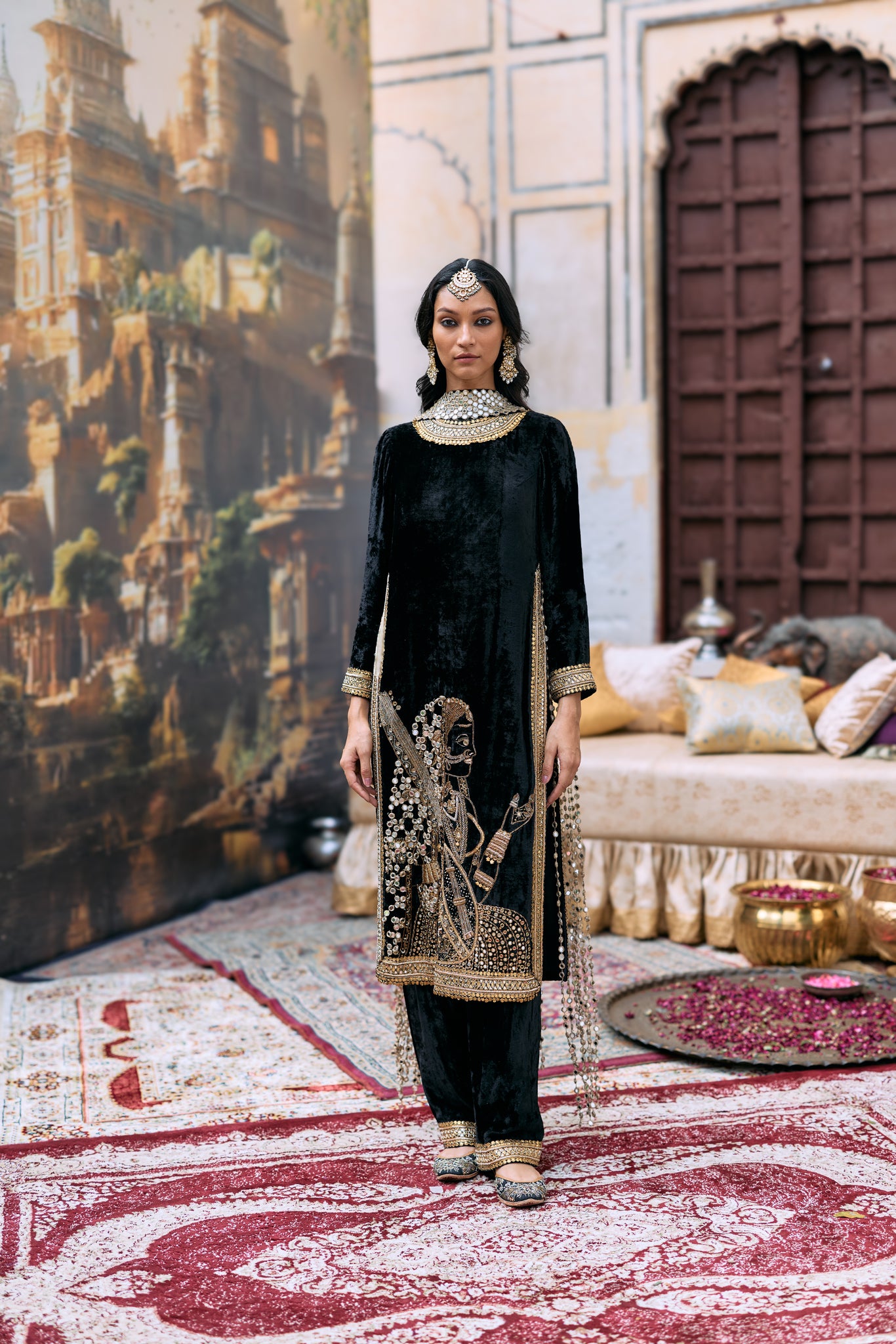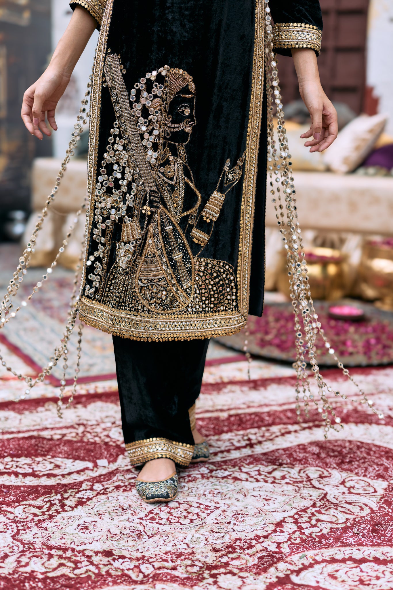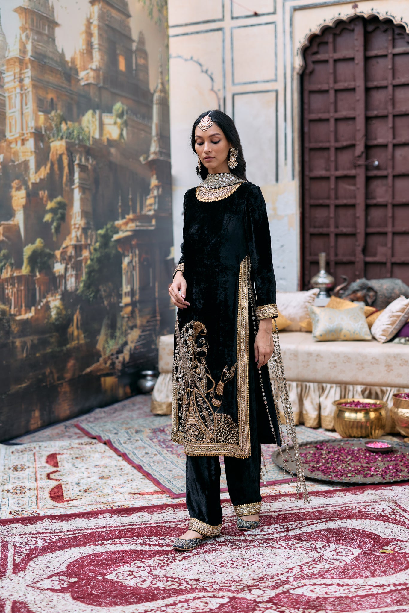 A black velvet suit featuring an exquisite fusion of Madhubani artistry embroidered on the hem, paired with straight pants and a mirror lace dupatta.