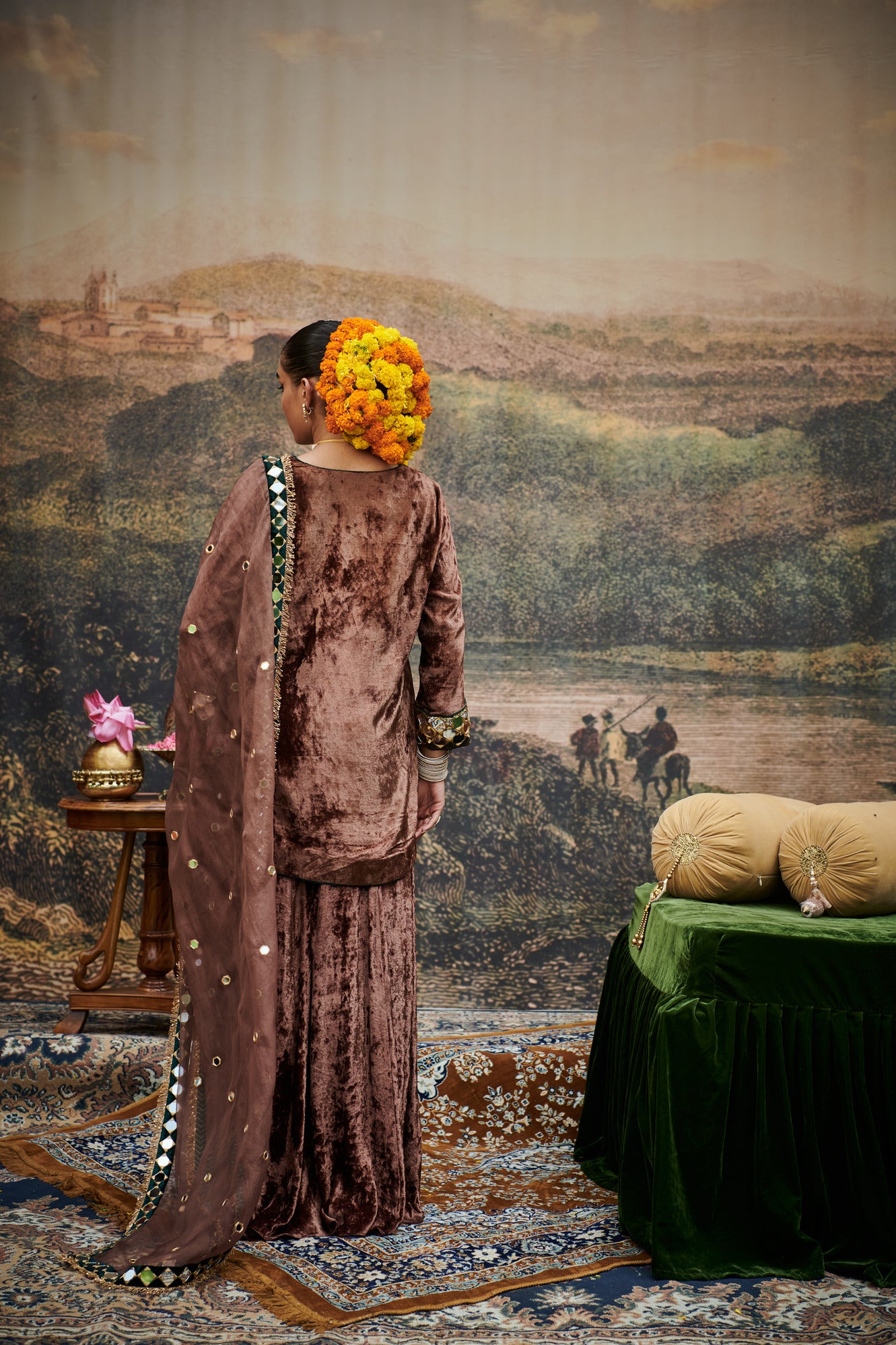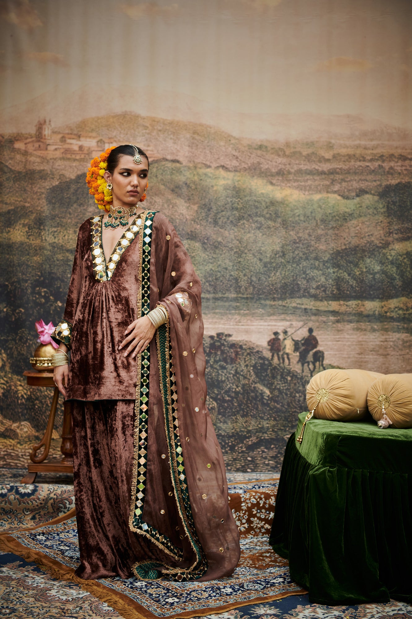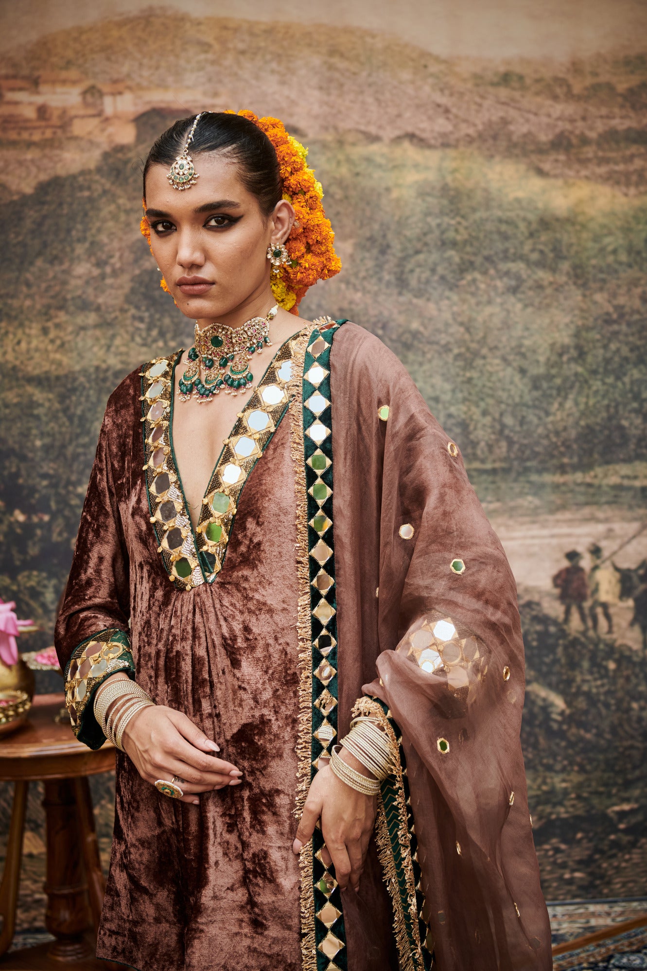 Brown velvet tunic with mirror work neckline and sleeves , paired with velvet pants and organza dupatta with mirror work on border.