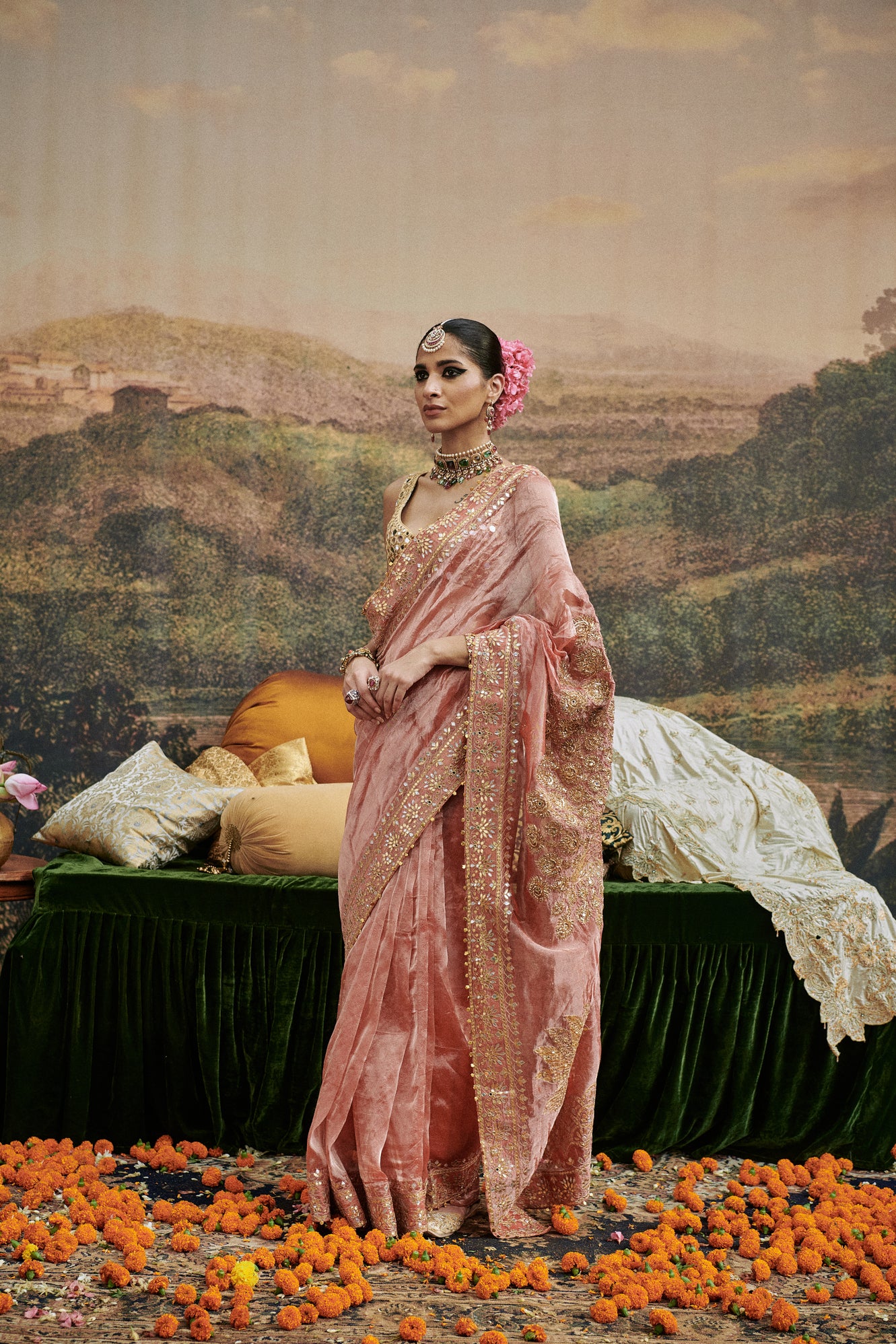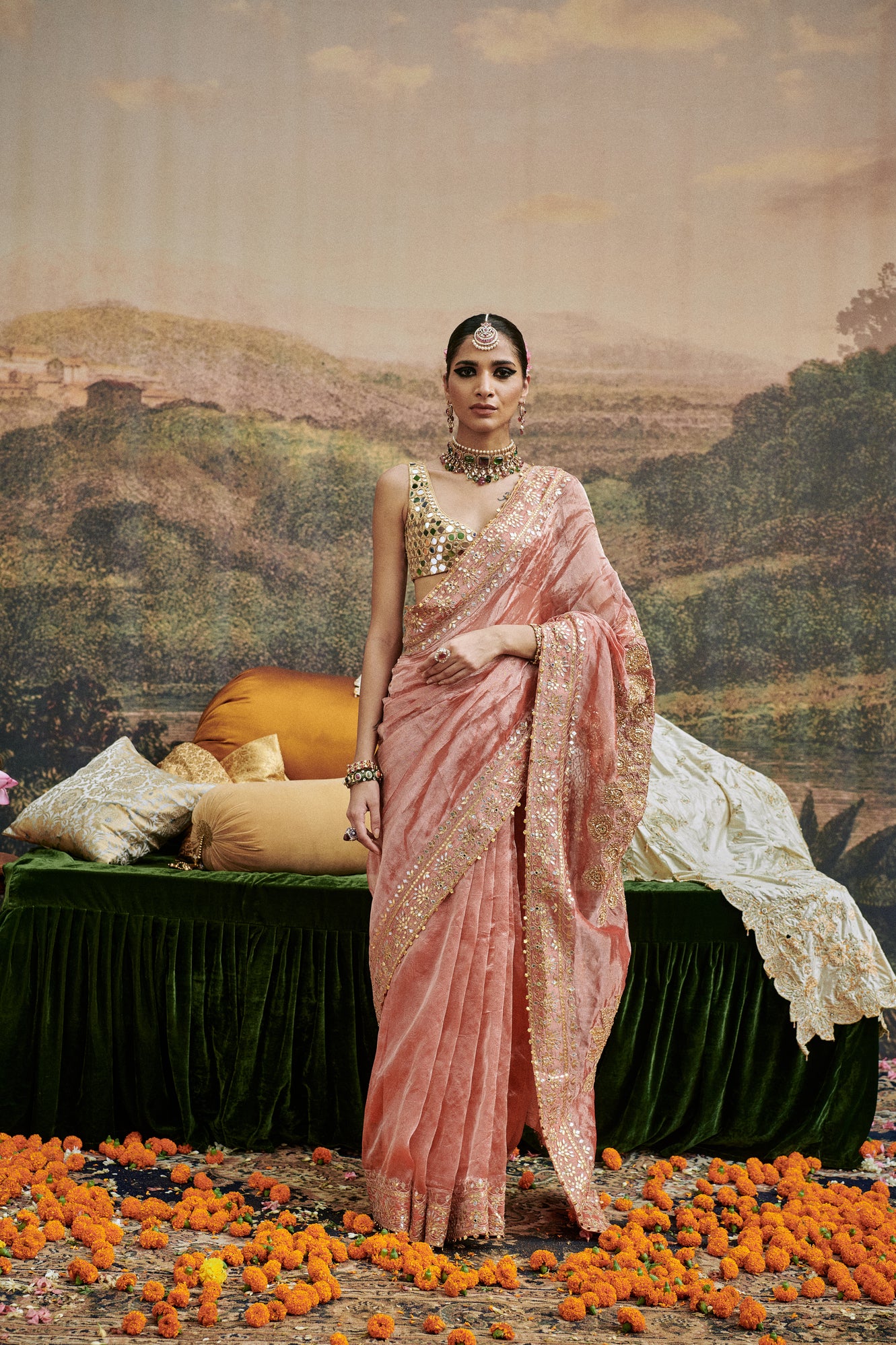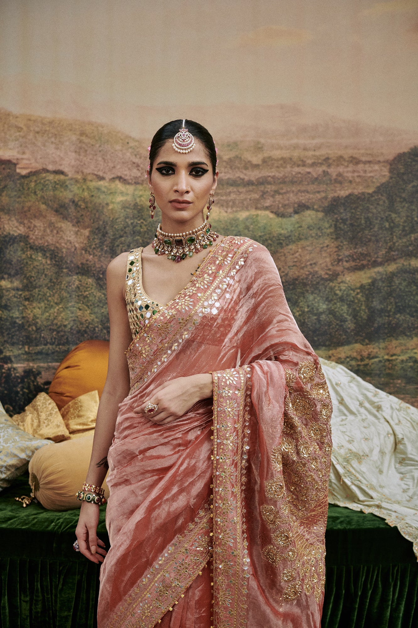 The saree is made in tissue fabric with mirror work blouse on gota lined with chanderi silk it features details on border and pallu with gota and ghungroos.