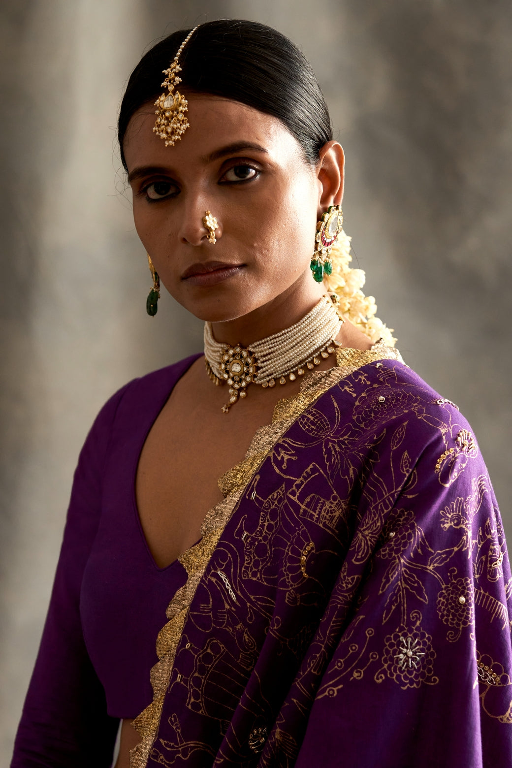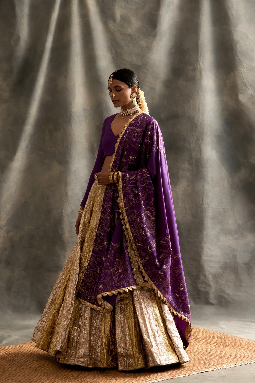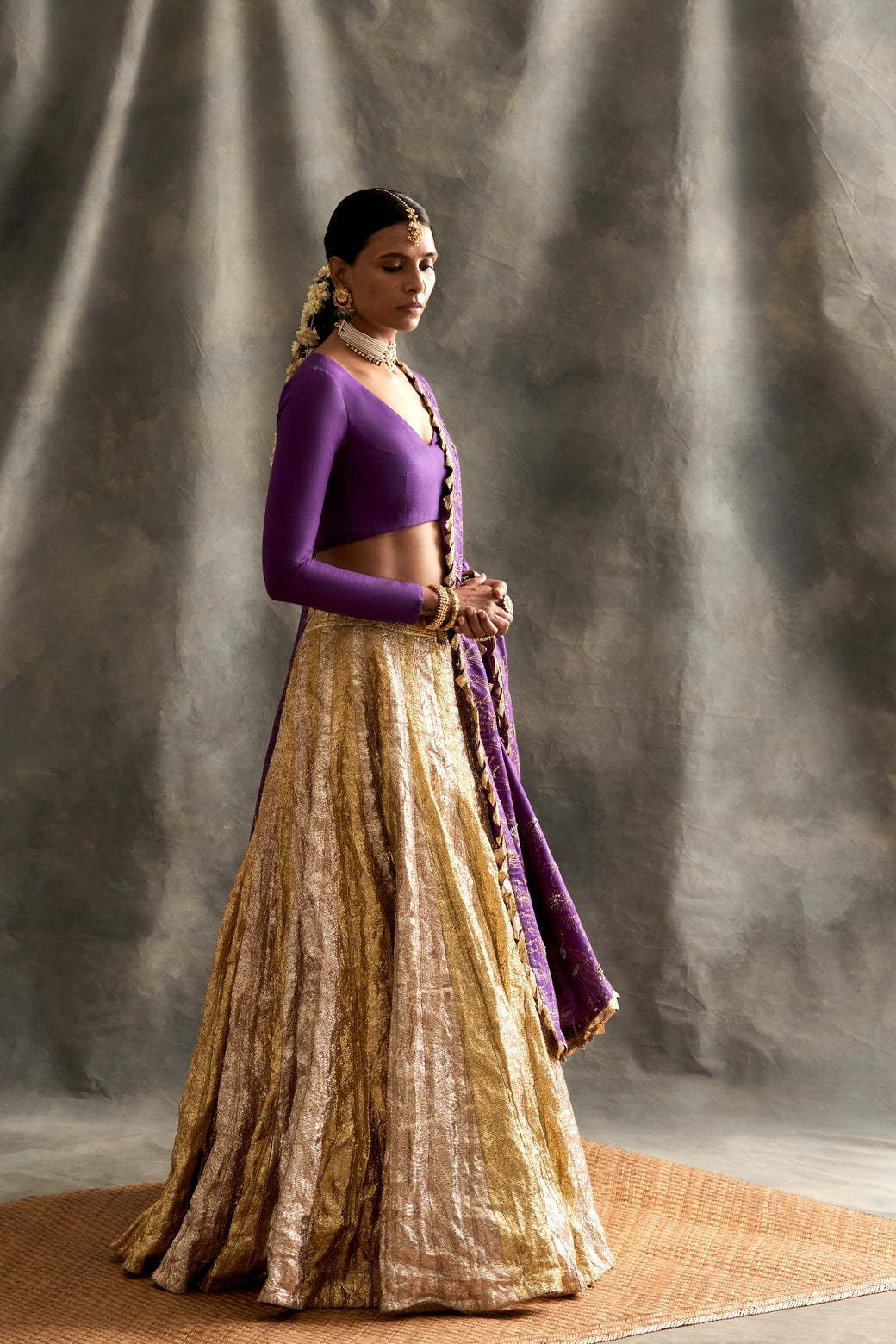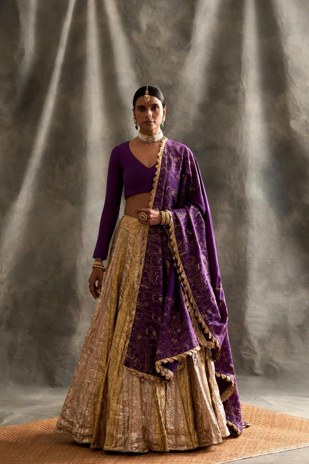 Purple Linen Blouse With A Silver Gold Panelled Lampi Lehenga. The Dupatta Is In Linen With Customised Khadi Block And Intricate Zardosi Dabka Embroidery