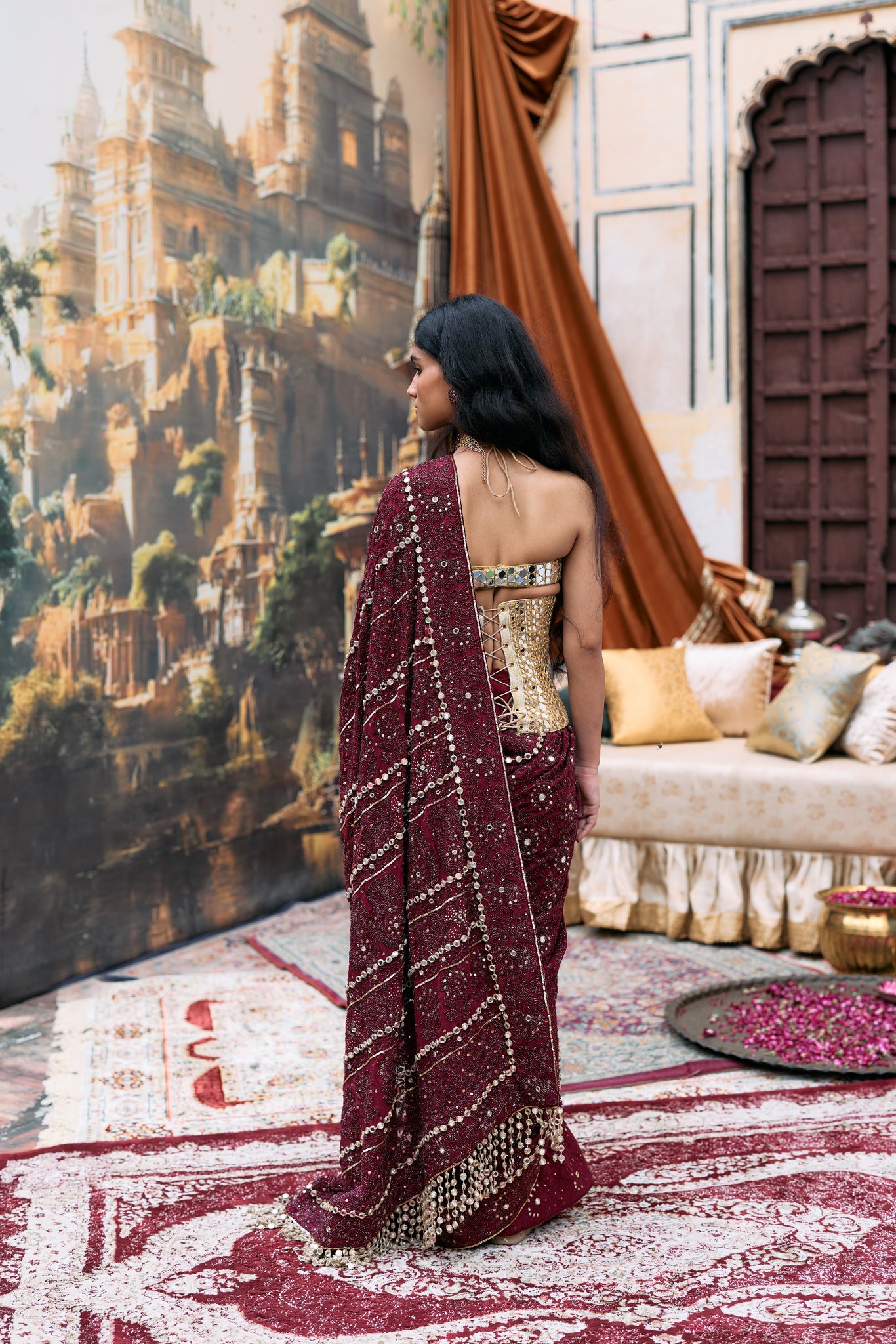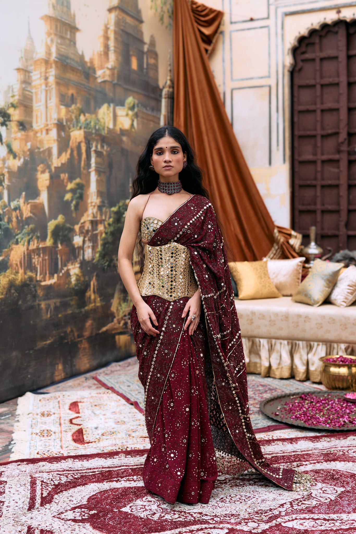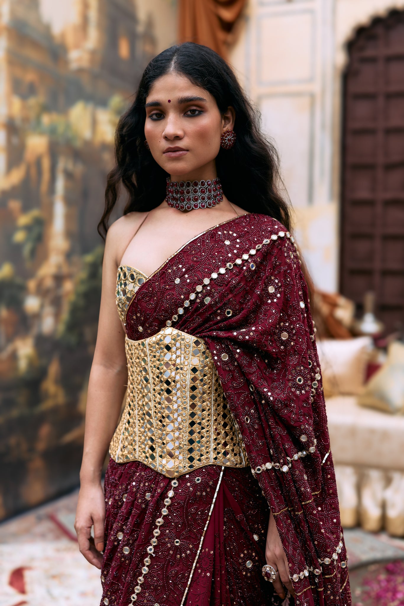 Our signature long mirror blouse and under bust corset belt paired with an intricate embroidered maroon chikankari saree.