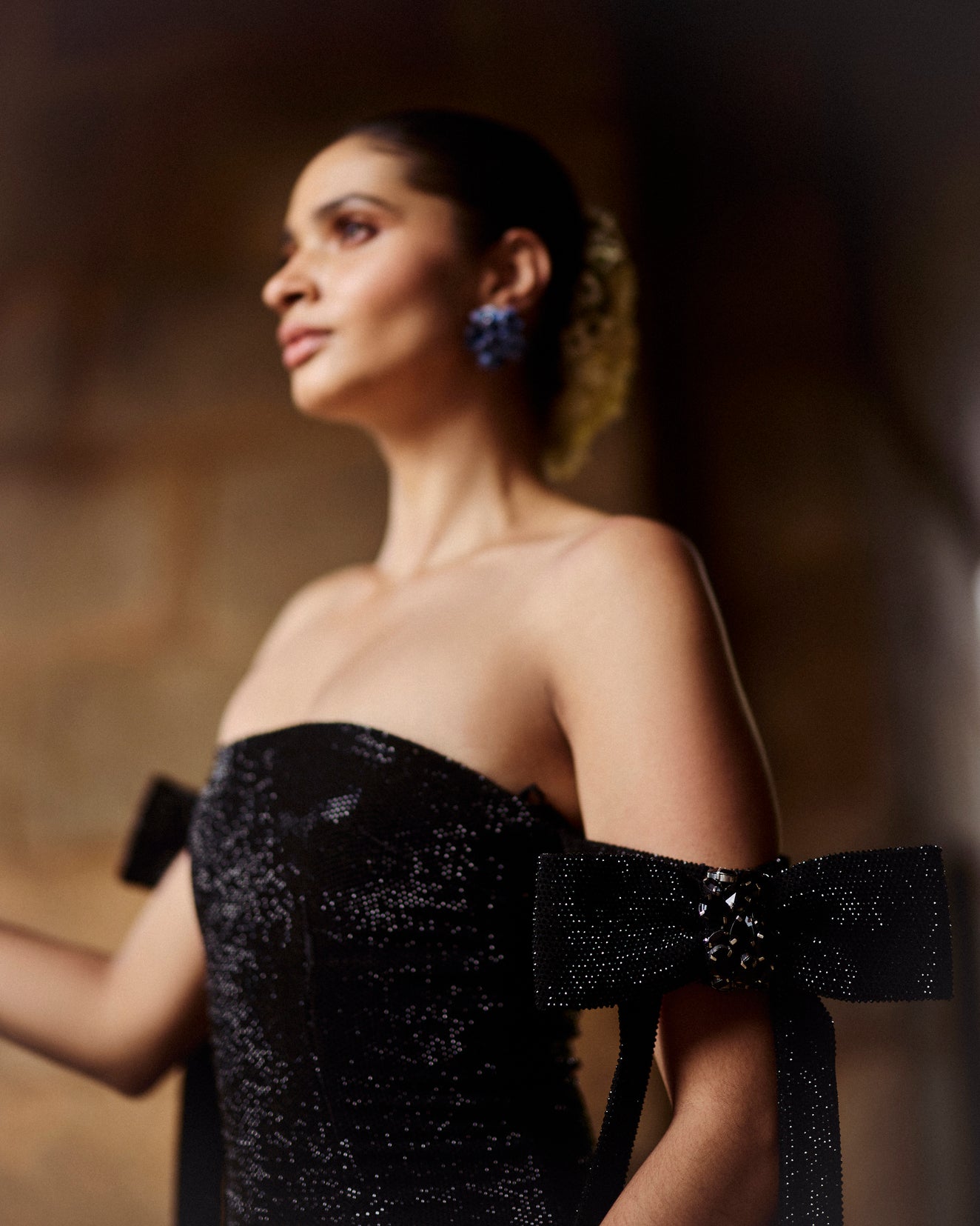 This black crepe crystal mini dress with off shoulder neckline and bows on both sleeves.