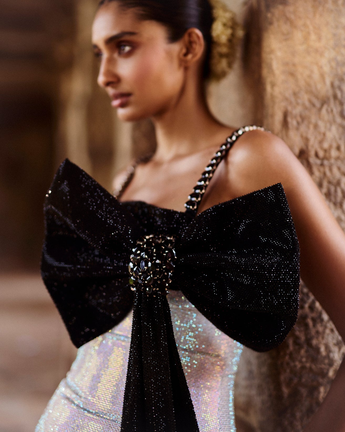 This white short dress is made from melon crepe and features an attached corset. It has a large black bow on the shoulder and black stone-embellished straps.
