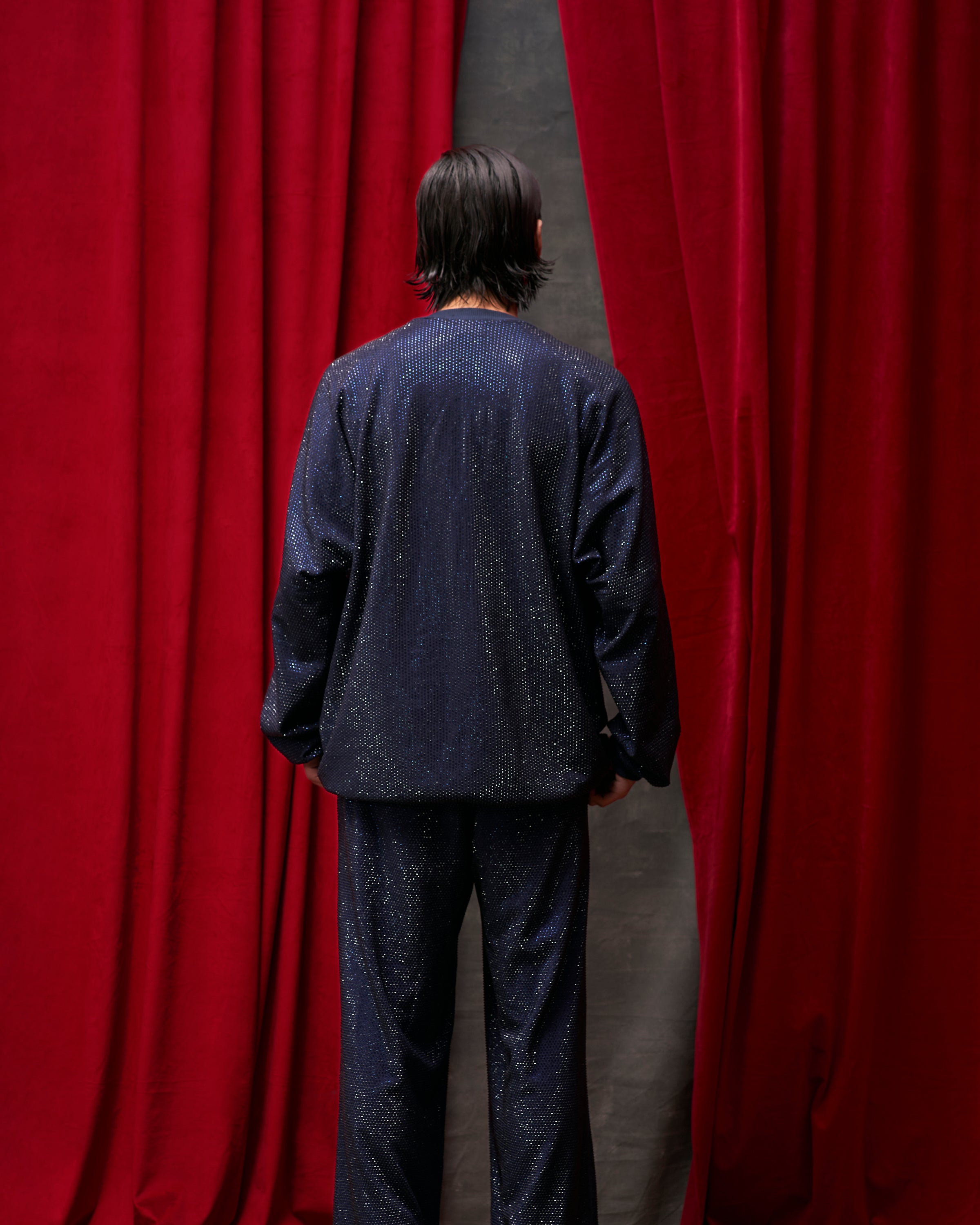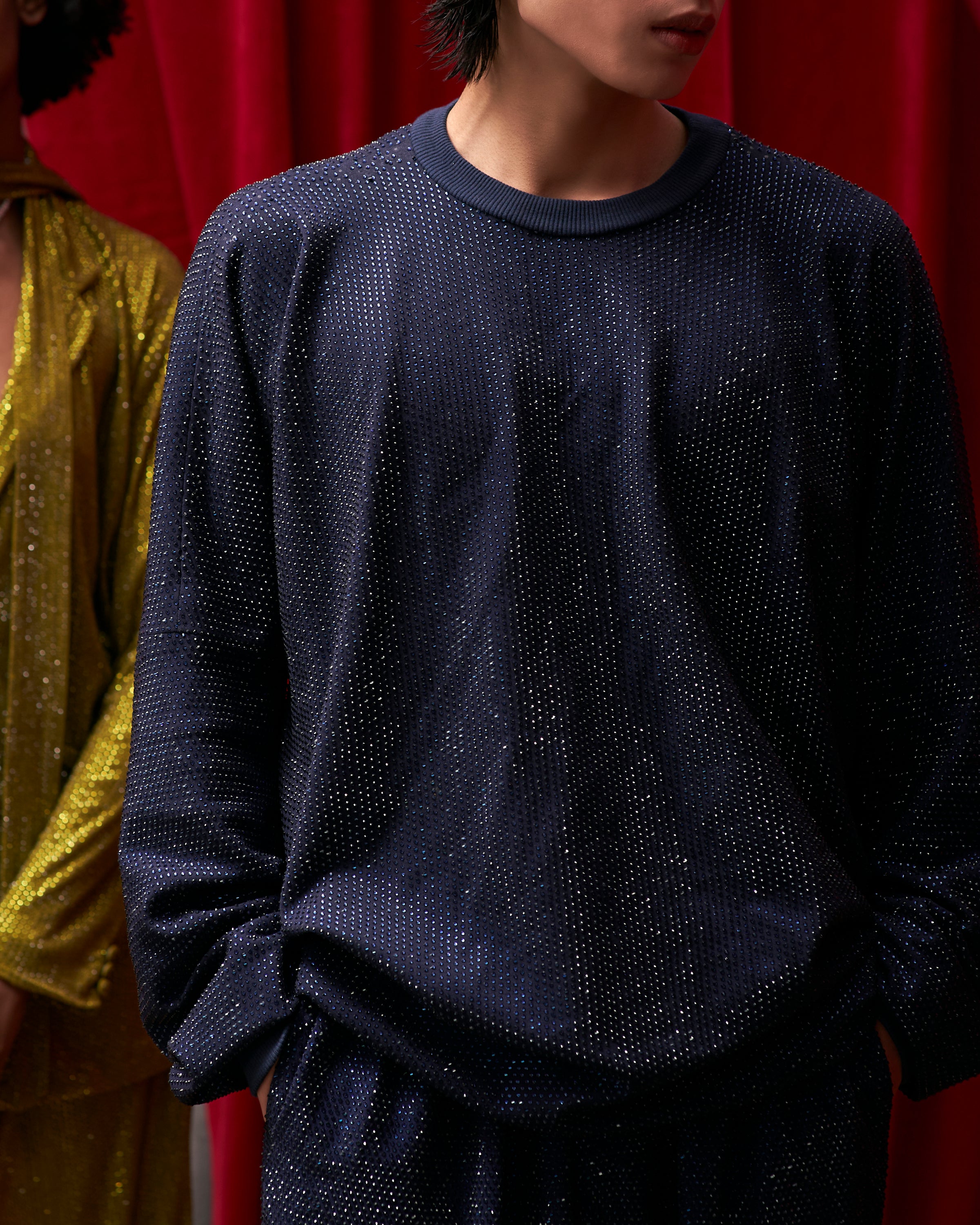 Midnight blue crystal embellished oversized sweatshirt paired with baggy loose fit pants.