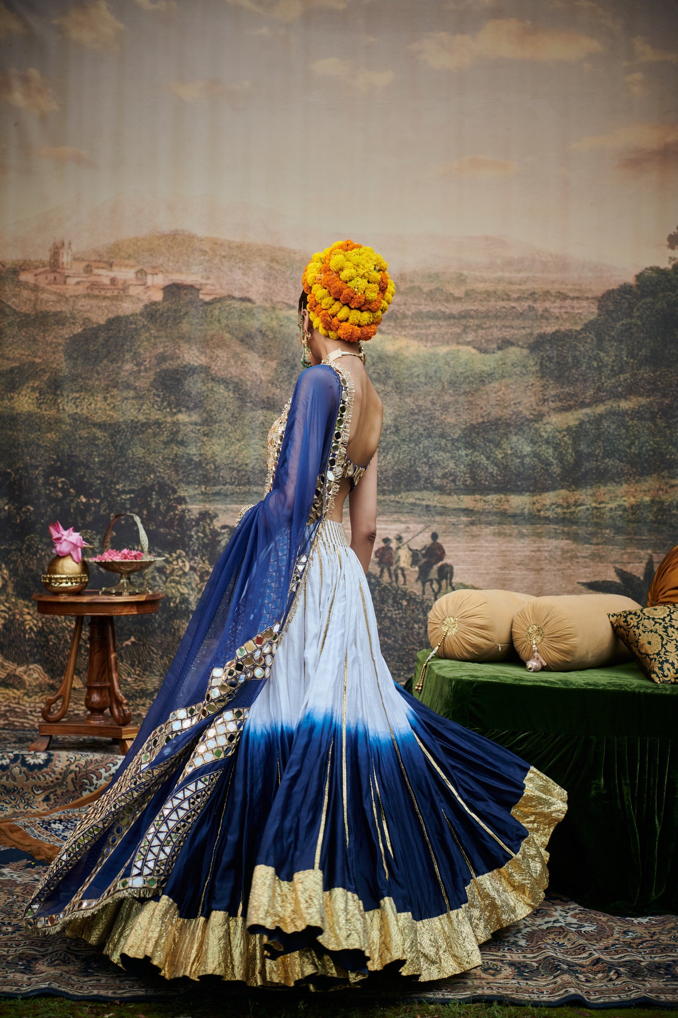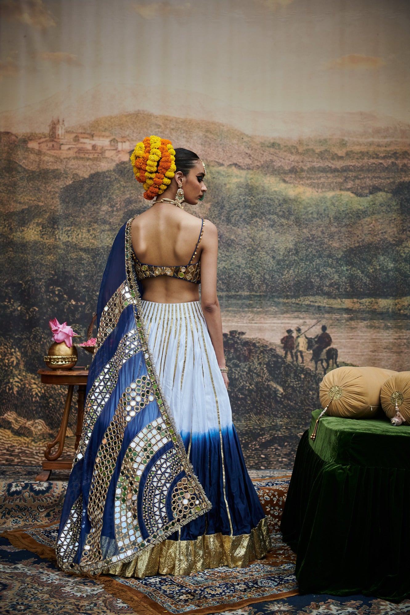 Ombre lehenga showcases a gradient effect, enhanced by a delicate gotta border and vertical gotta stripes,it is paired with a mirror work velvet blouse and a soft organza dupatta with mirror work.