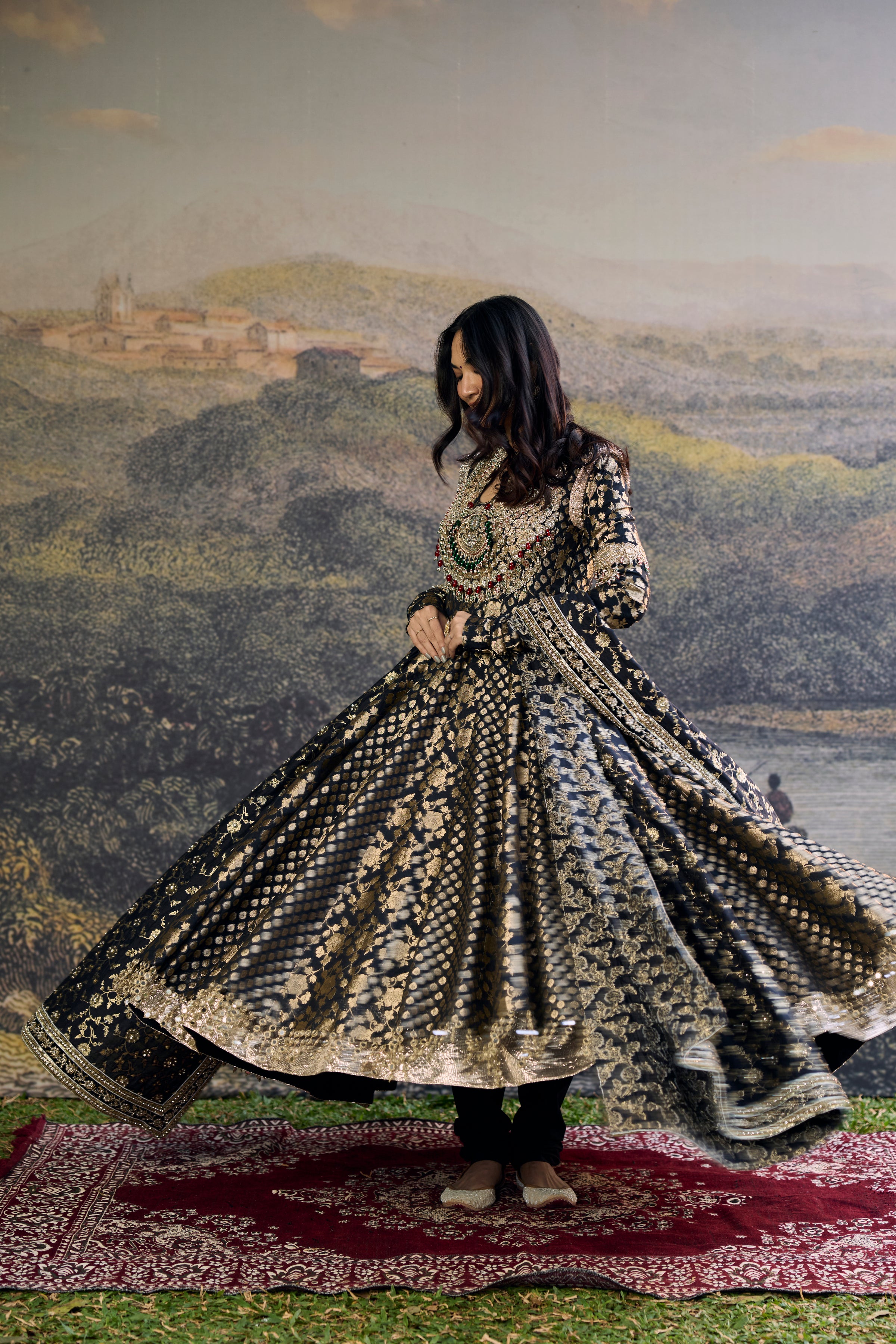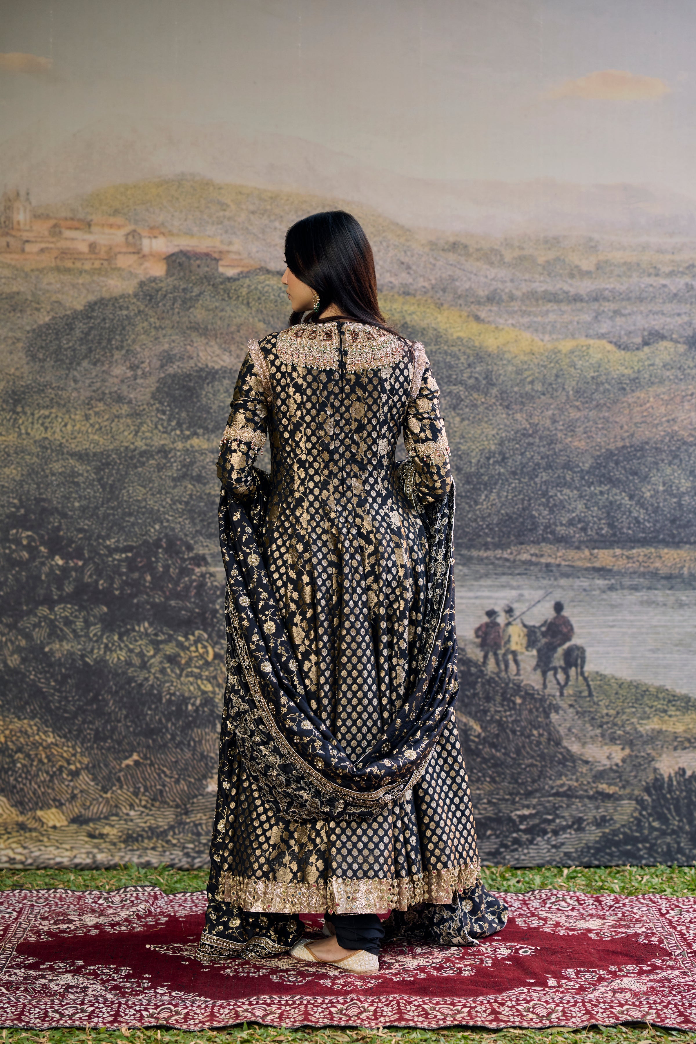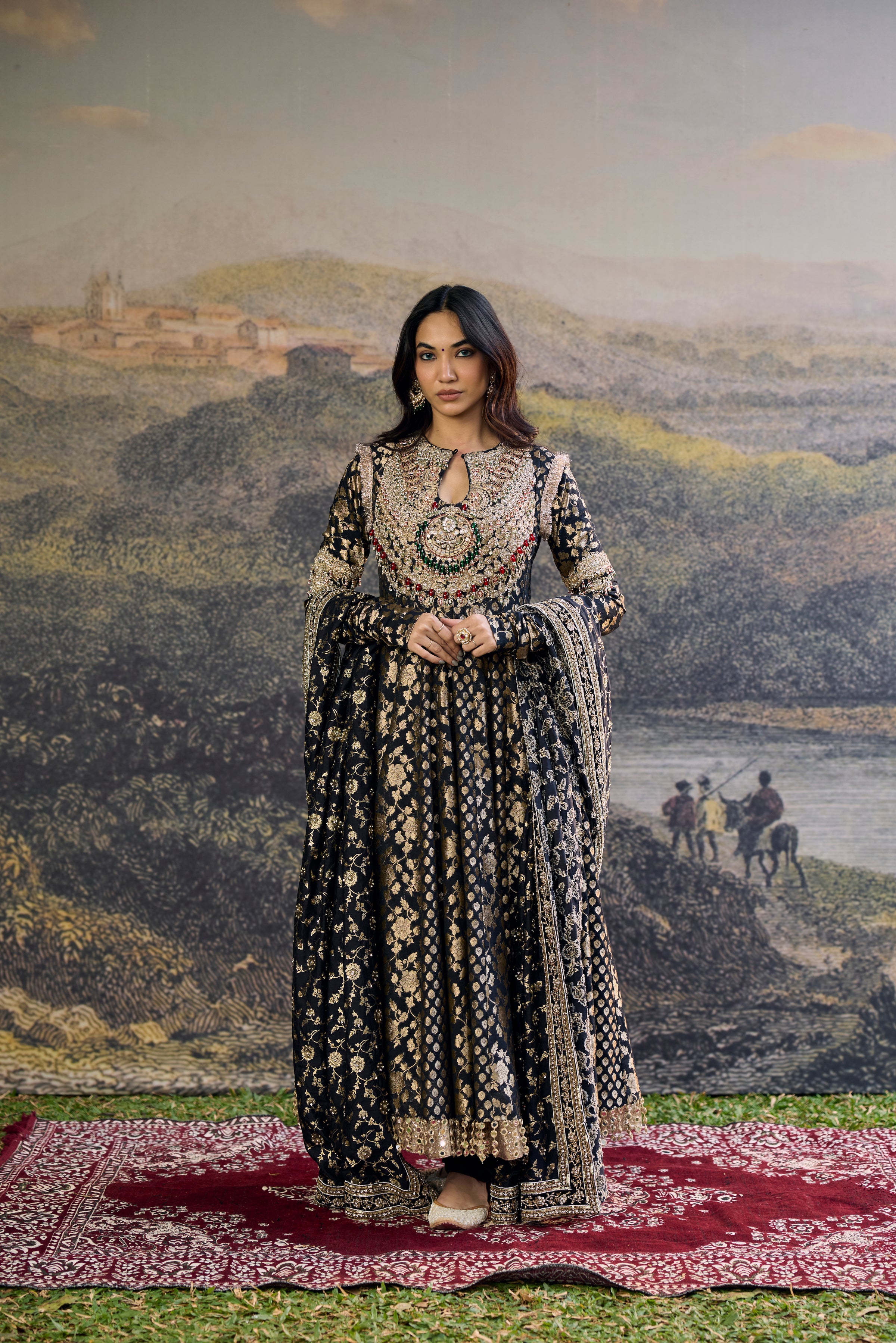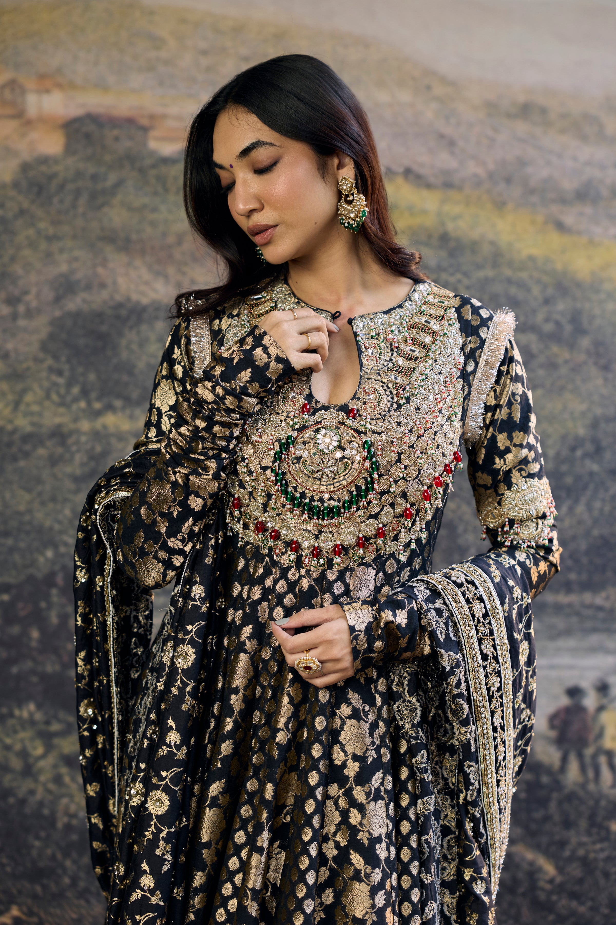 This Black Brocade Anarkali Features A Jewelled And Embellished Stone Neckline With Intricate Detailing. The Ensemble Showcases Rich Brocade Panels In Tones Of Black With Metallic Accents, Paired With A Matching Dupatta. Perfect For Luxury Bridal Wear And Grand Celebrations.