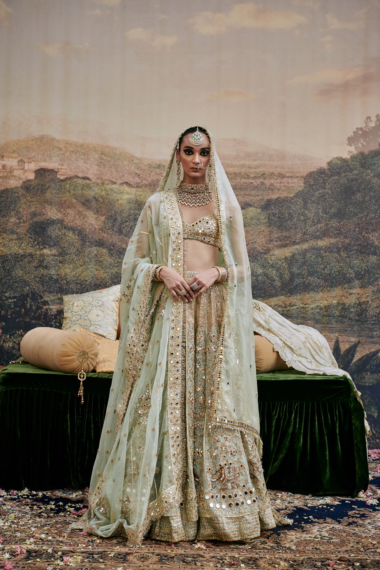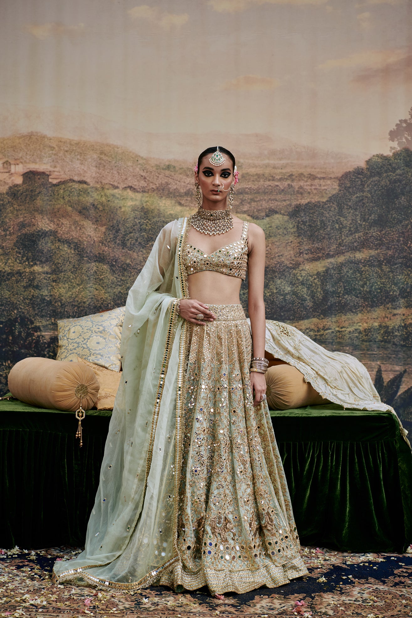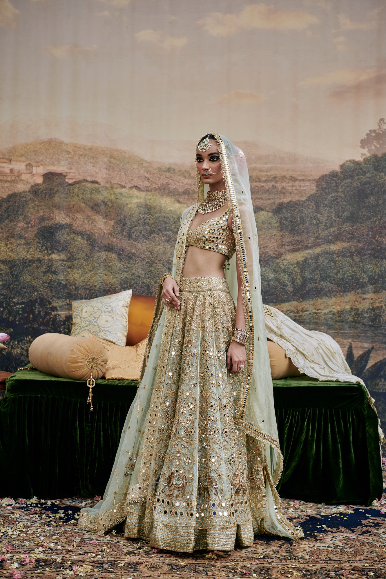 Powder blue organza Lehenga with mirror work and delicate elephant motif embroidery is done on the lehenga , paired with a mirror work blouse and organza dupatta with gota on border additional to the dupatta a veil is styled to complete the look.