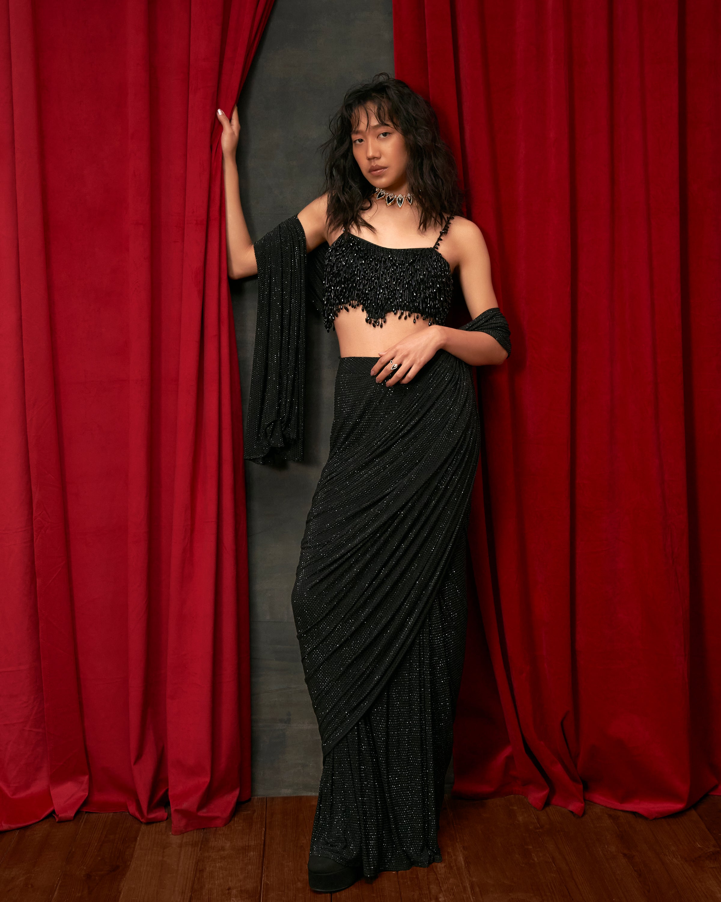 Black crystal embellished prestitched saree paired with strappy blouse which is beautifully crafted with polished crystal drops across the top.