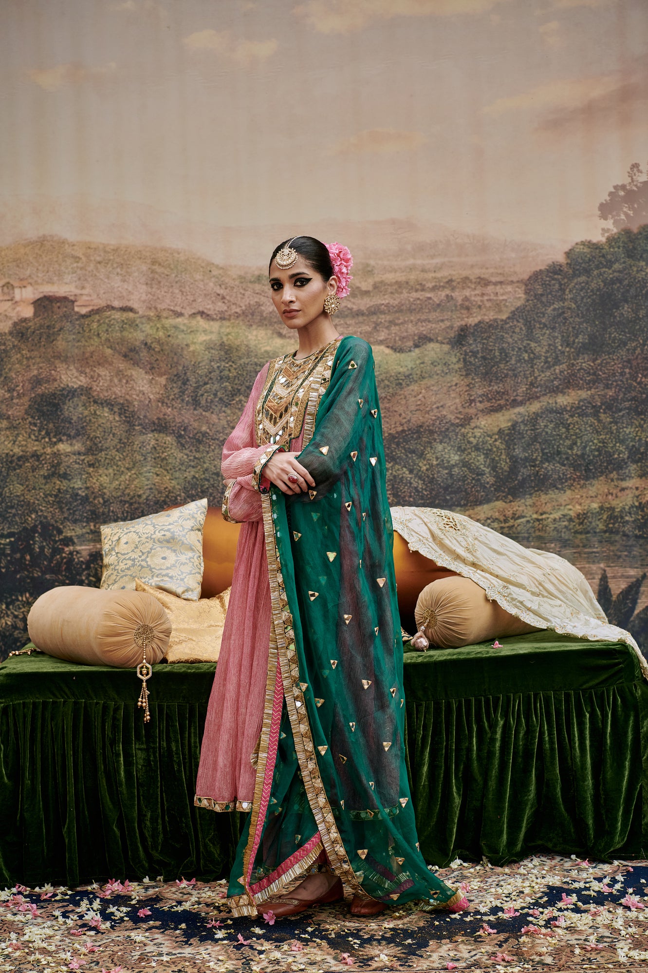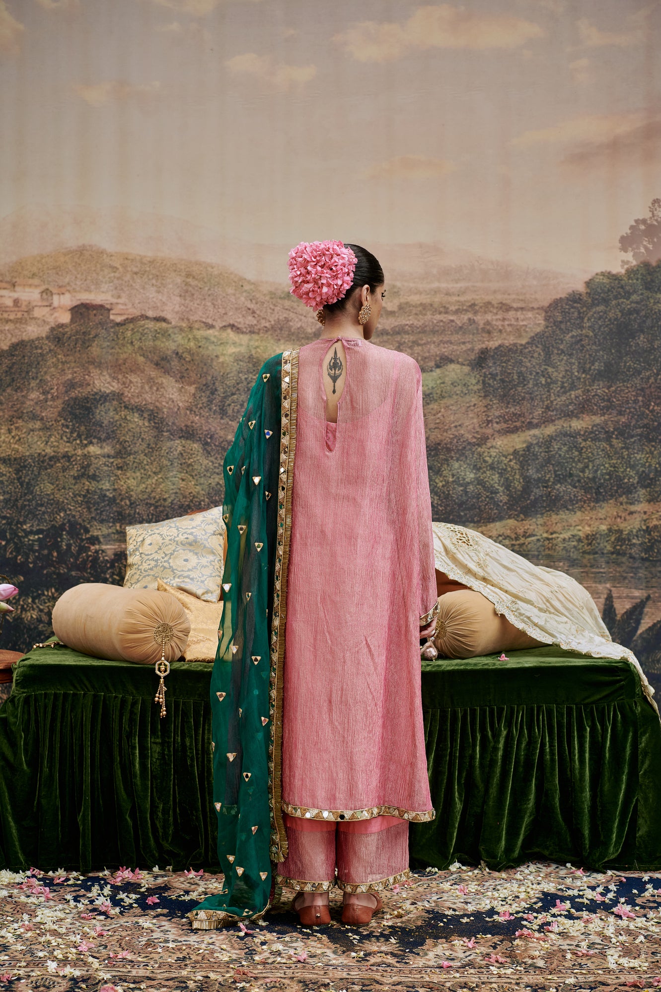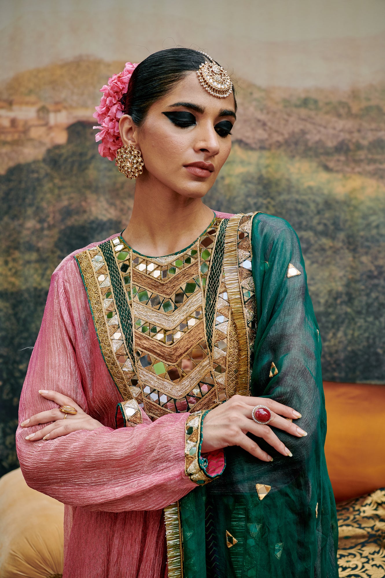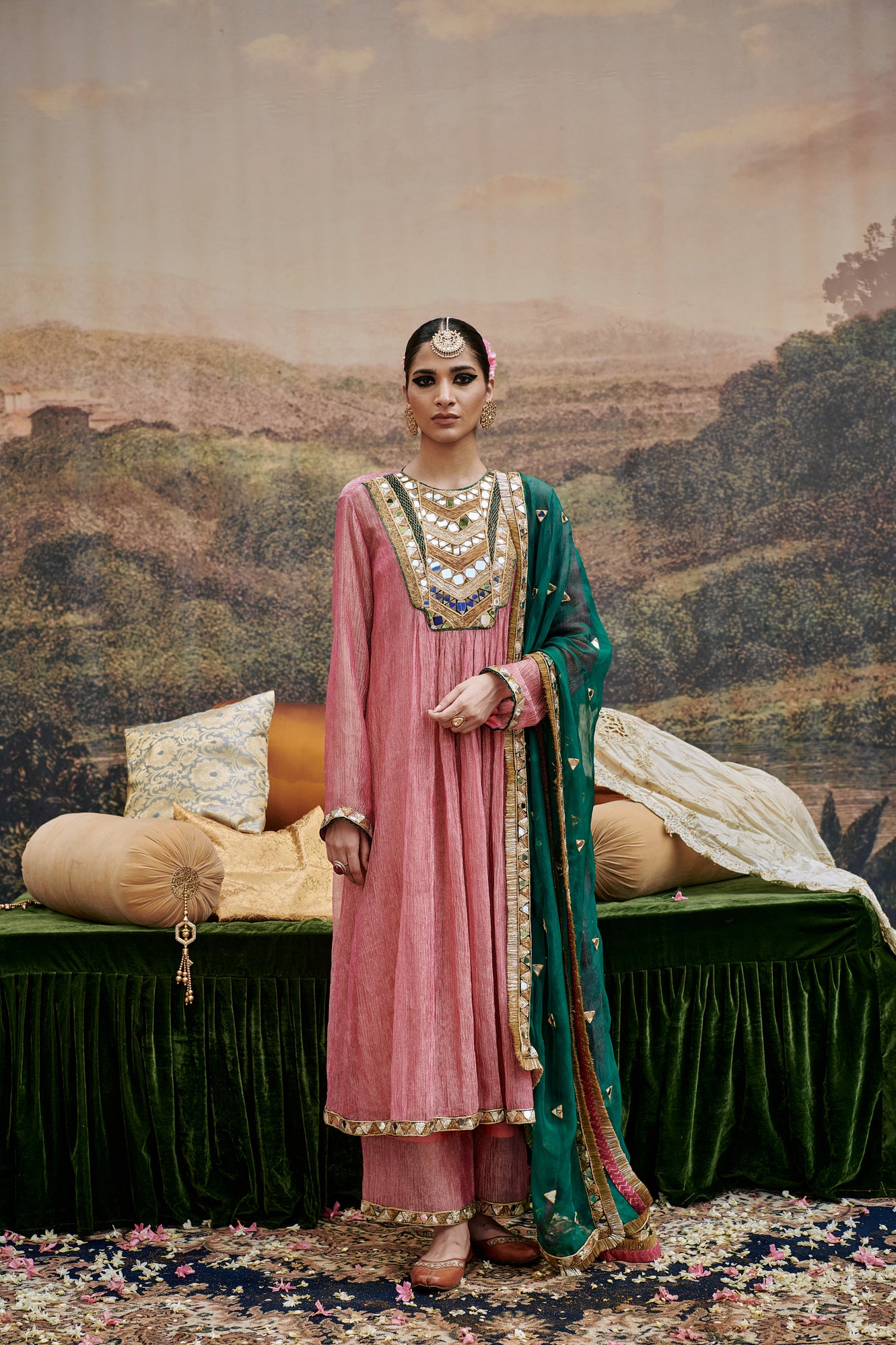Pink tissue suit  with mirror work yoke and crushed tissue lined with chanderi pants and a organza green dupatta delicate mirror work is done on border of pants, kurta, slip and dupatta.