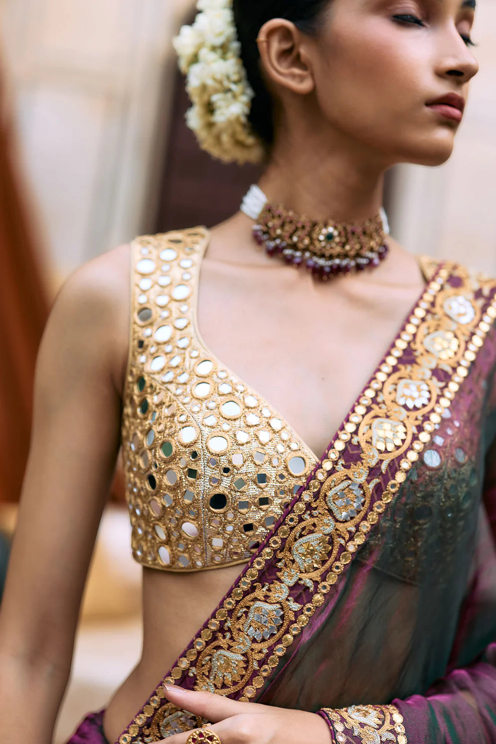 A purple dhoop chaon saree with beautiful hand-embroidered detailing, paired with a sparkling mirror blouse for a festive finish.