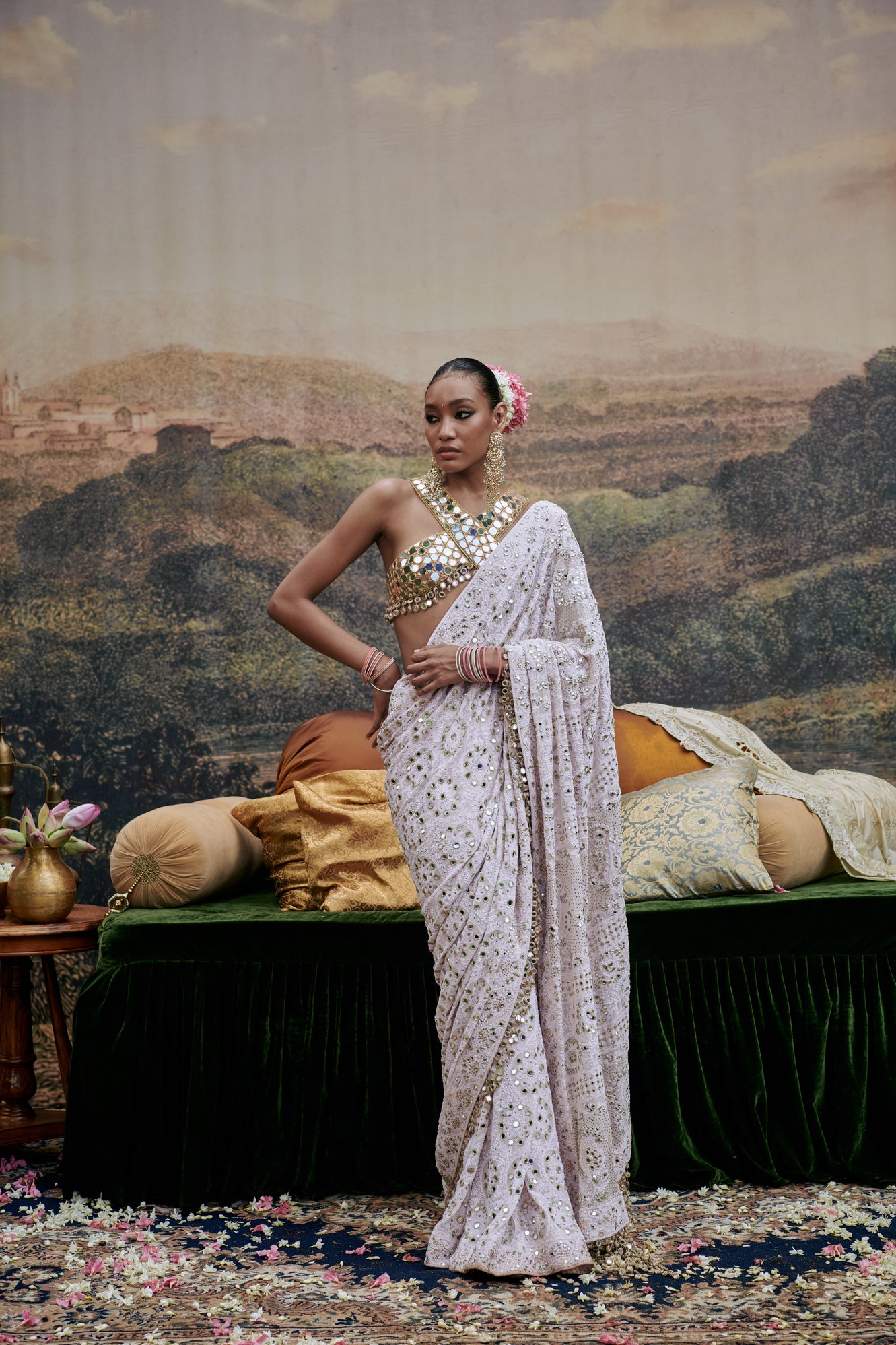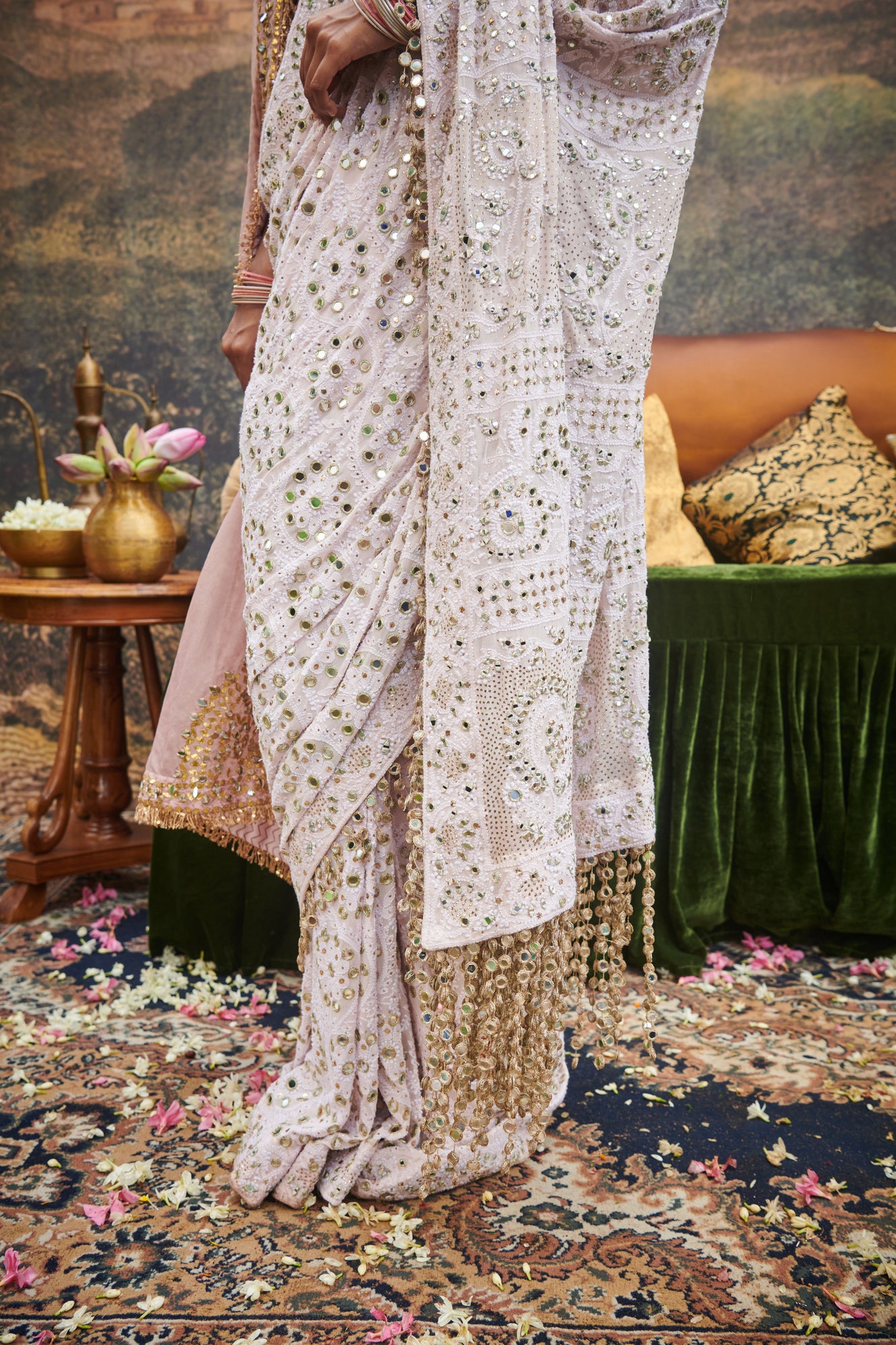 Pink Lucknowi saree,adorned with intricate hand-embroidery and small mirror tassels attached to  border and pallu is paired with mirror work blouse on gota lined with chanderi silk.