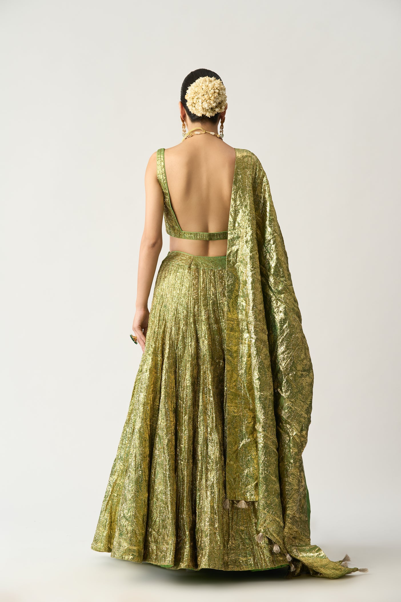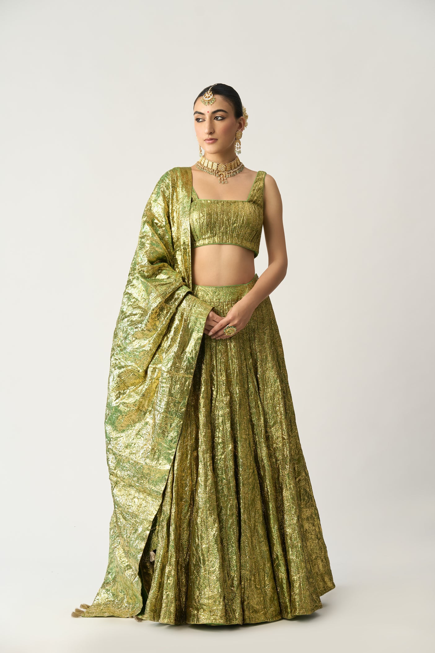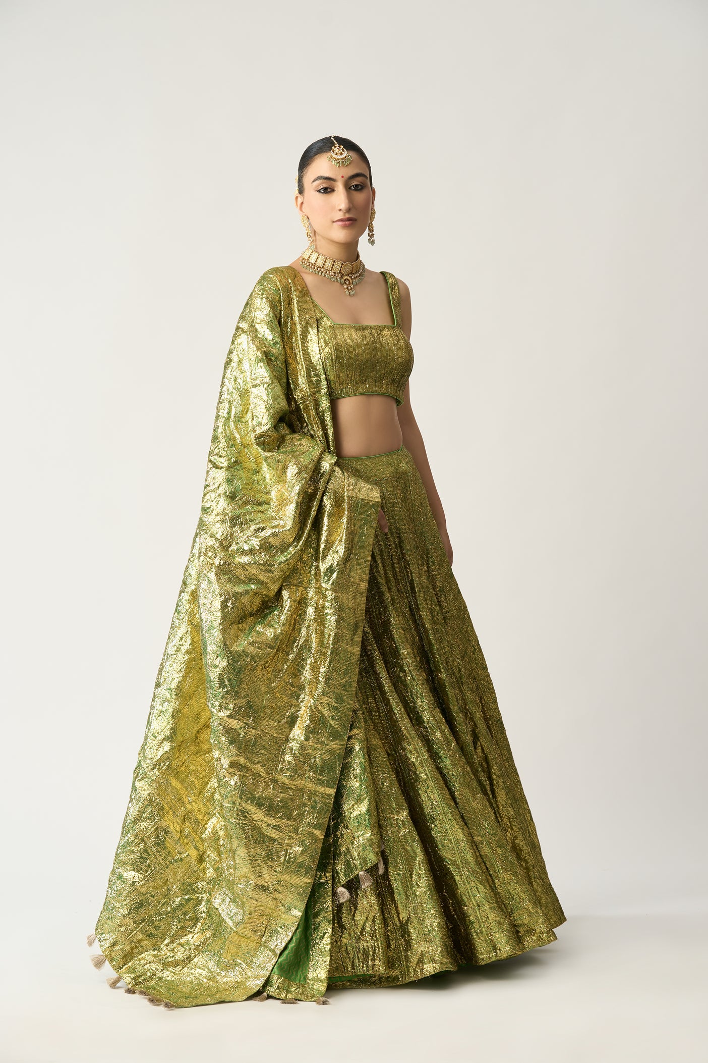 Green Lampi Lehenga , Square Neck Sleevless Blouse With Silk Organza Gota Patti Dupatta With Kiran Edging.