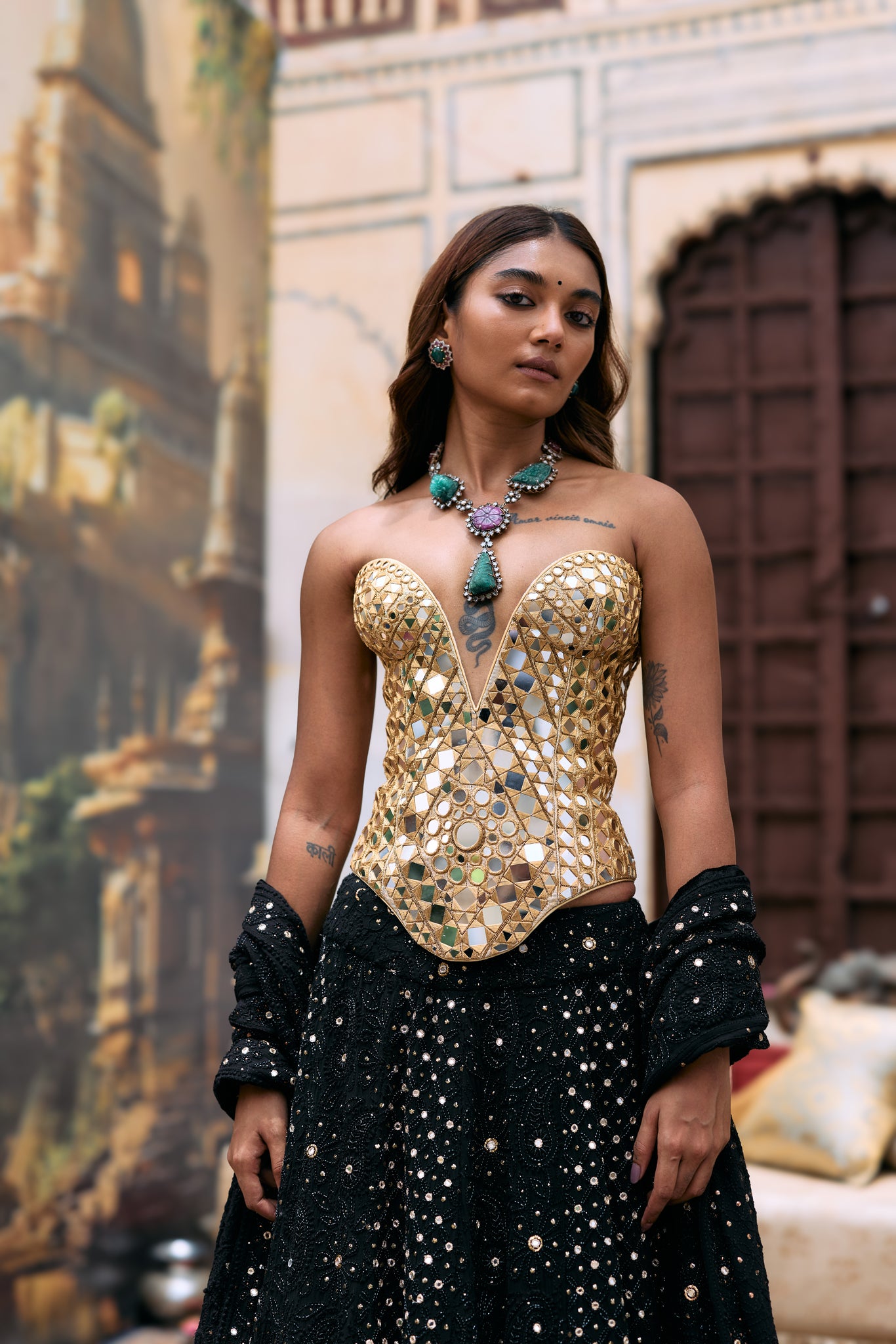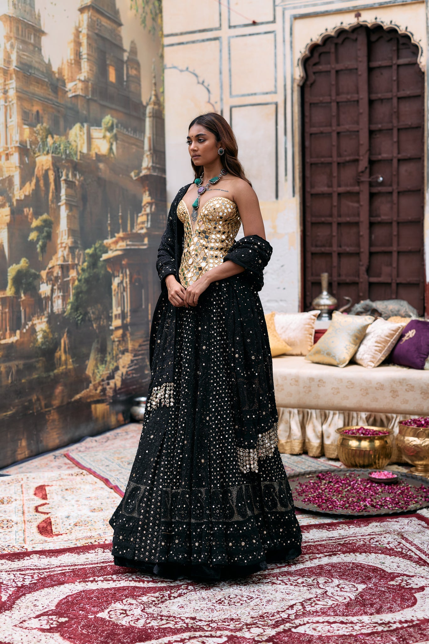 Our signature long mirror corset paired with an embroidered black chikankari godet lehenga and dupatta.