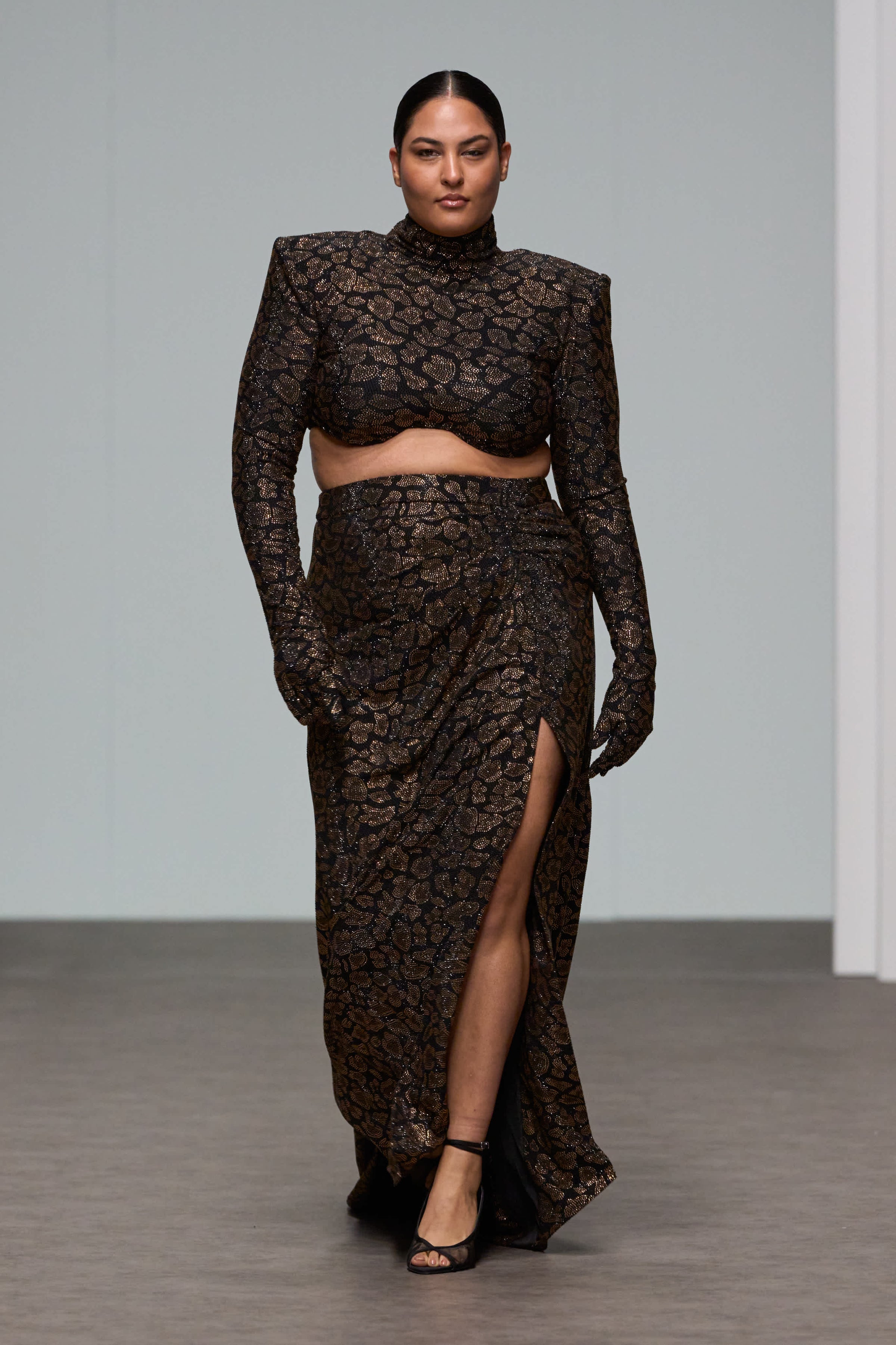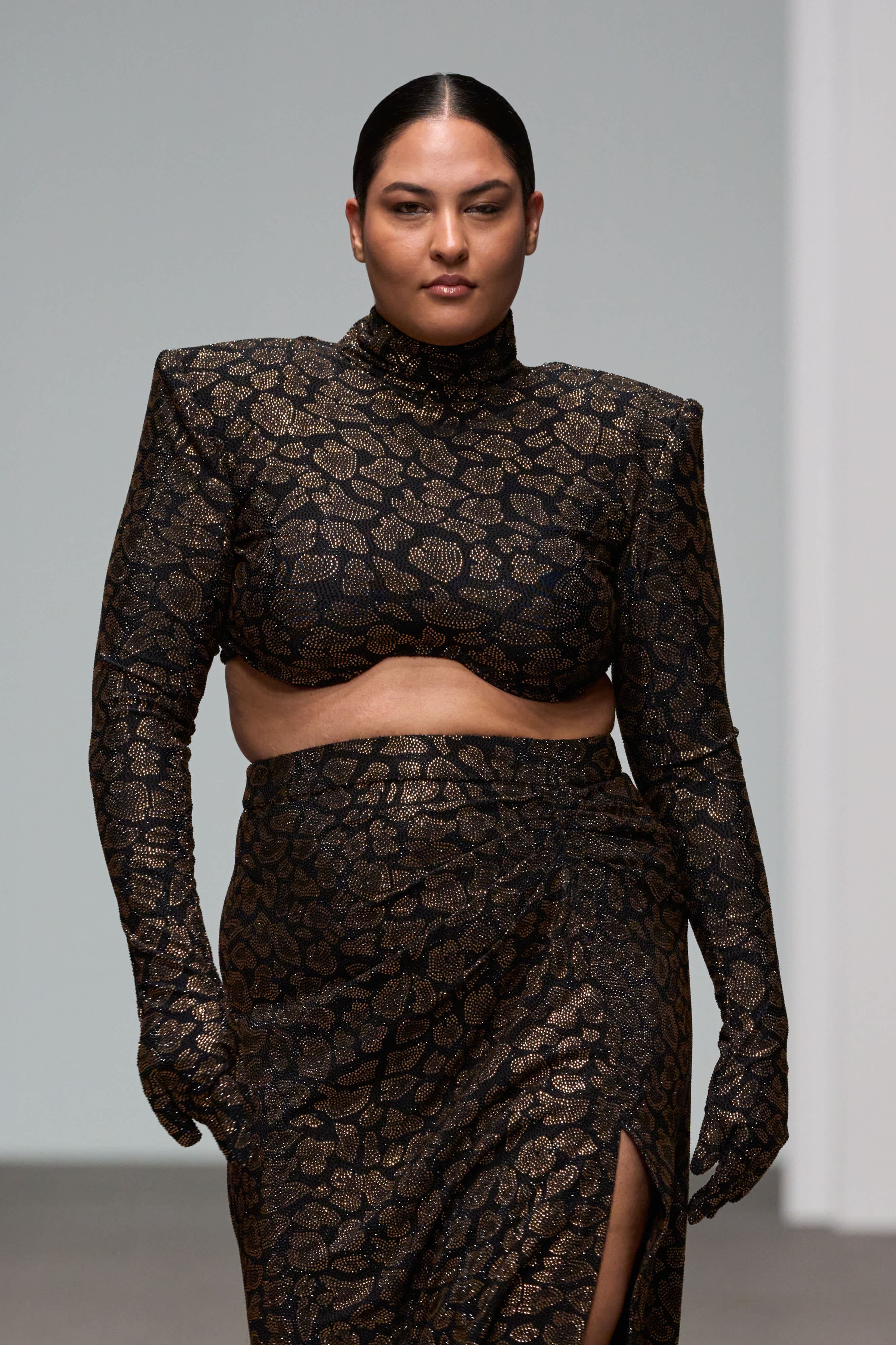 Leoapard prit crystal skirt with a side slit, paired with a power shouldered top with gloves attached.