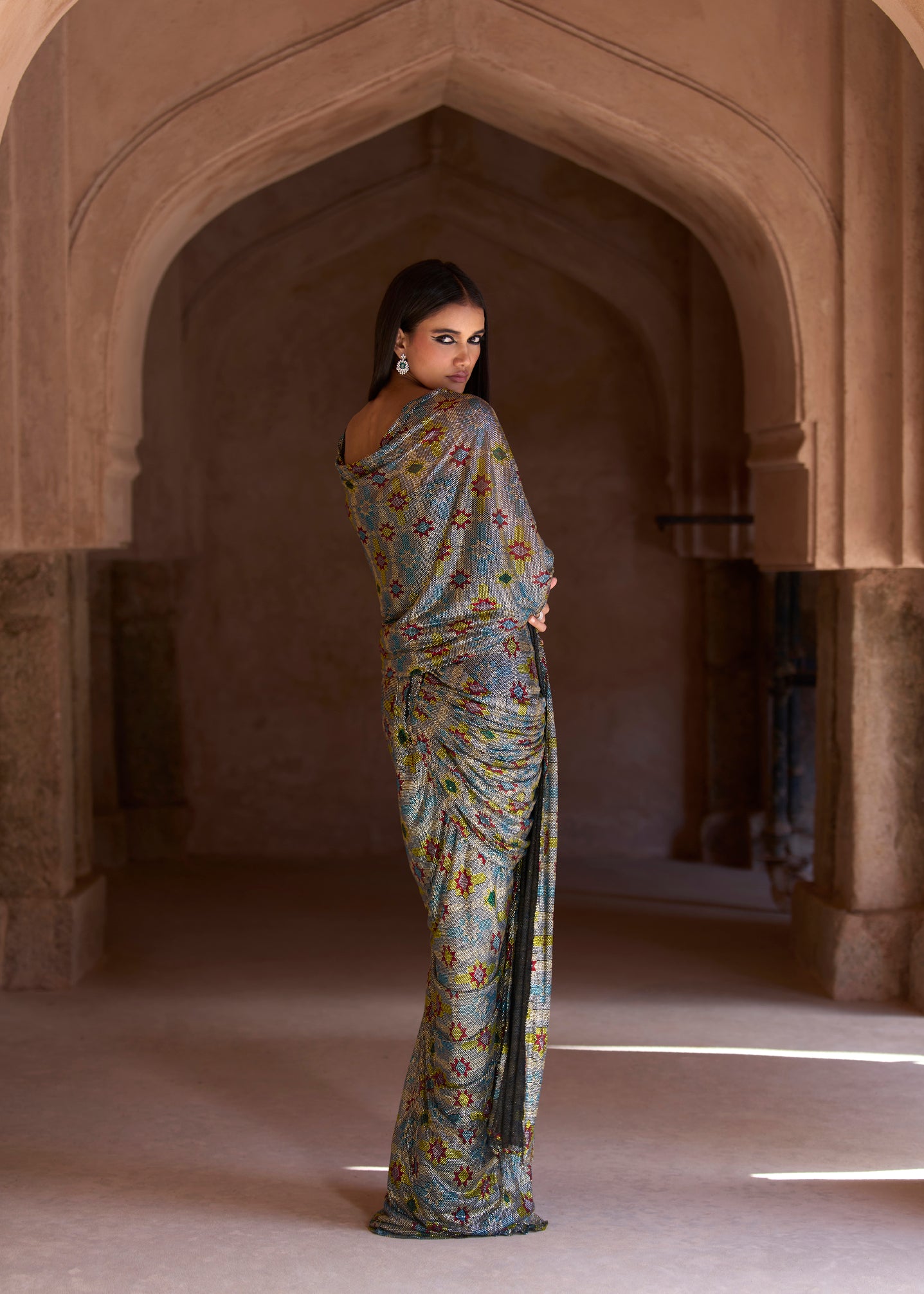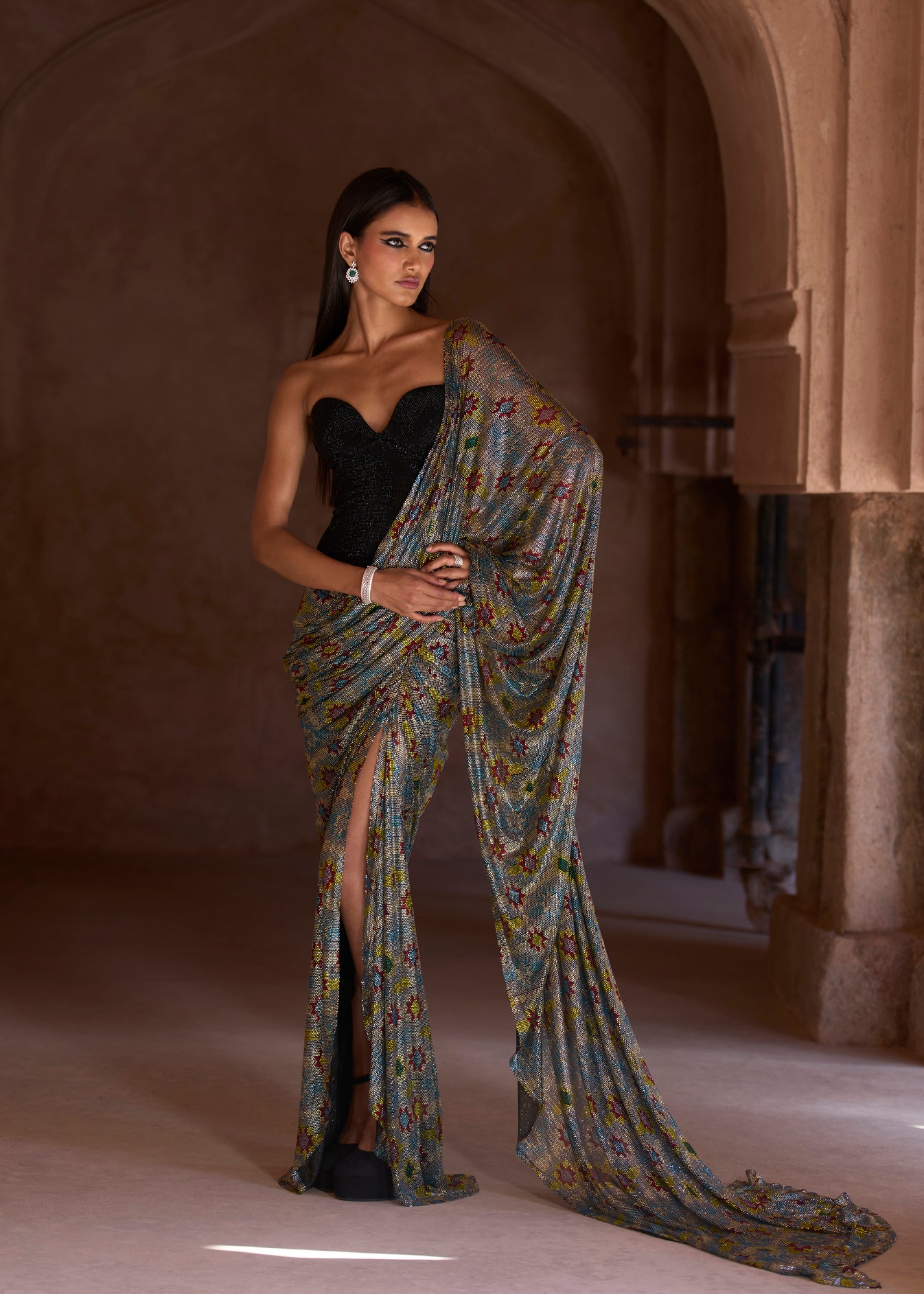 Solid Black Crystal-embellished corset paired with a silver floral print draped skirt and detachable pallu.