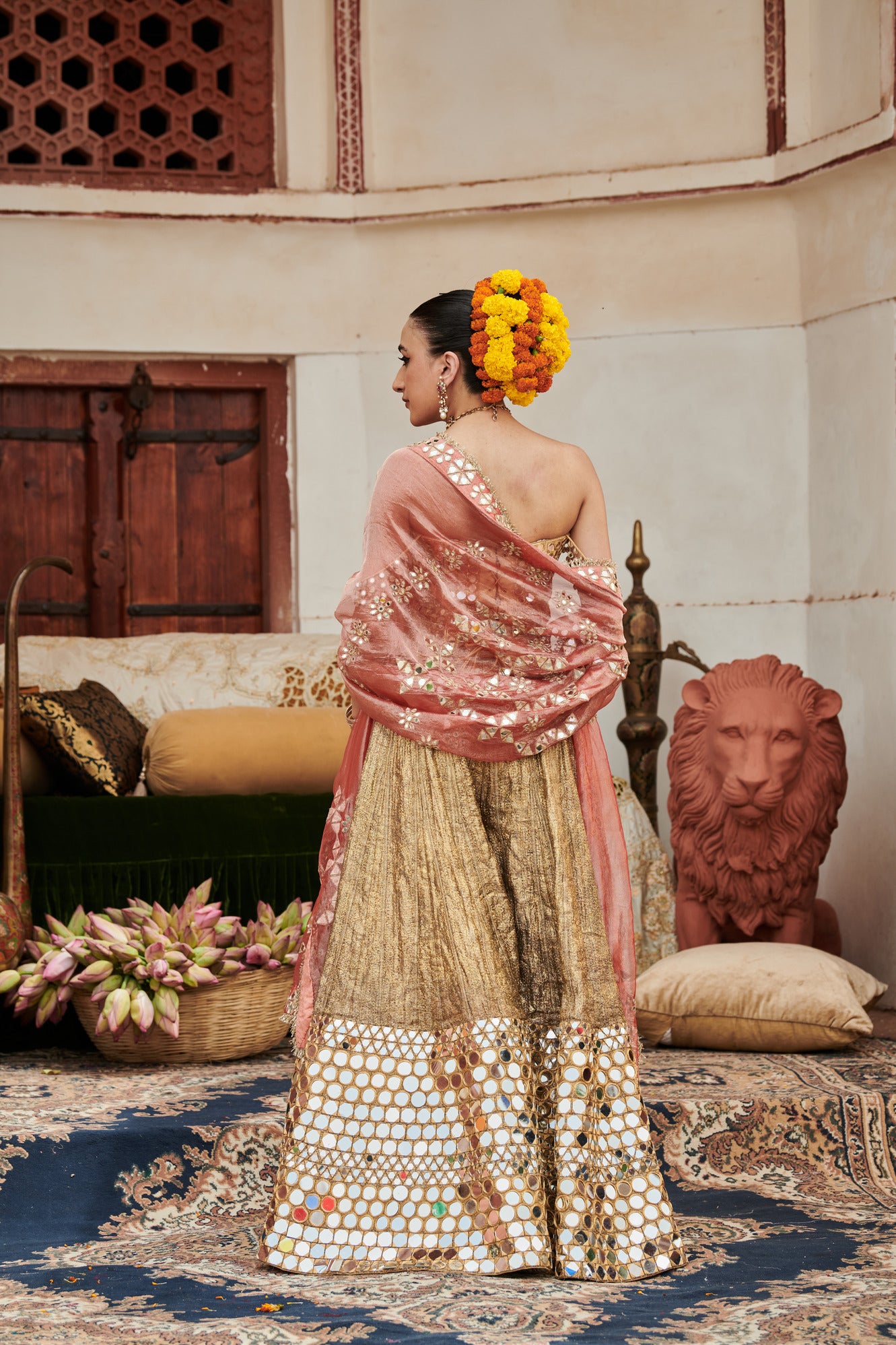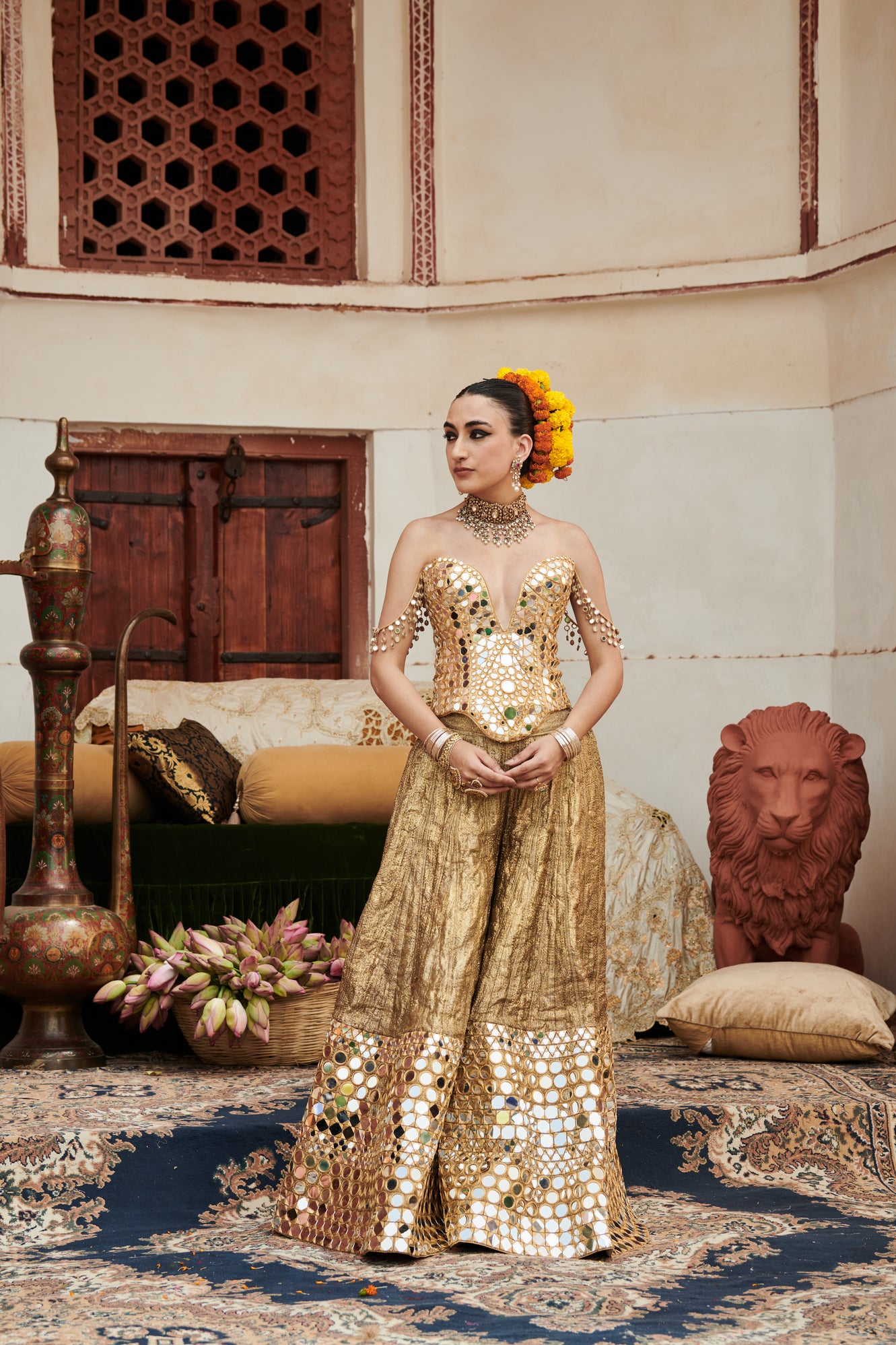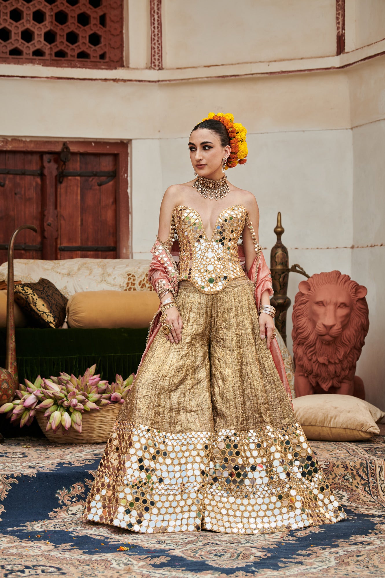 Gold mirror work sharara on lampi with intricate mirror embellishment on bottom, the sharara is paired with a mirror work corset blouse on gota lined with chanderi silk and red dupatta with mirror work.
