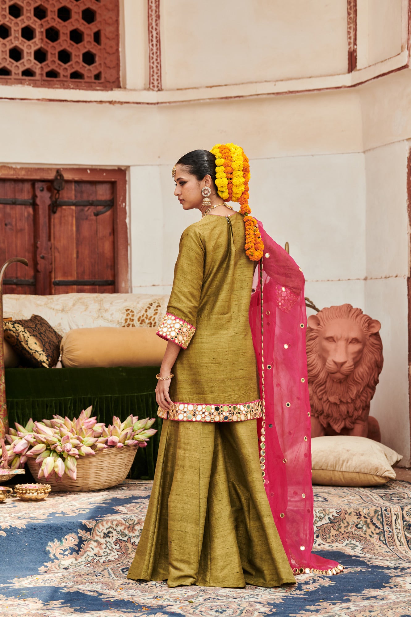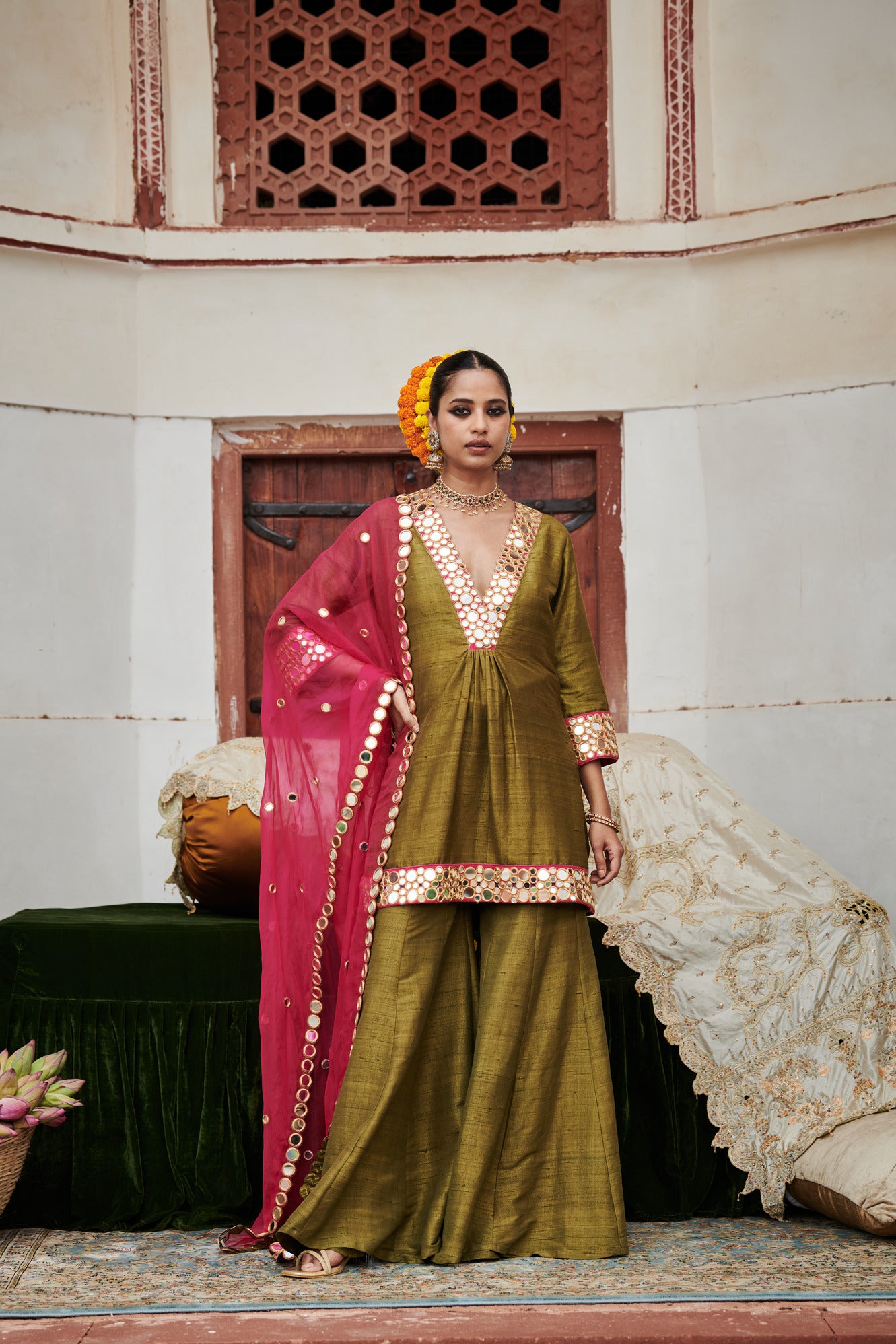 Green Raw Silk sharara set with mirror work on tunic and matching pants is paired with a contrasting pink organza dupatta