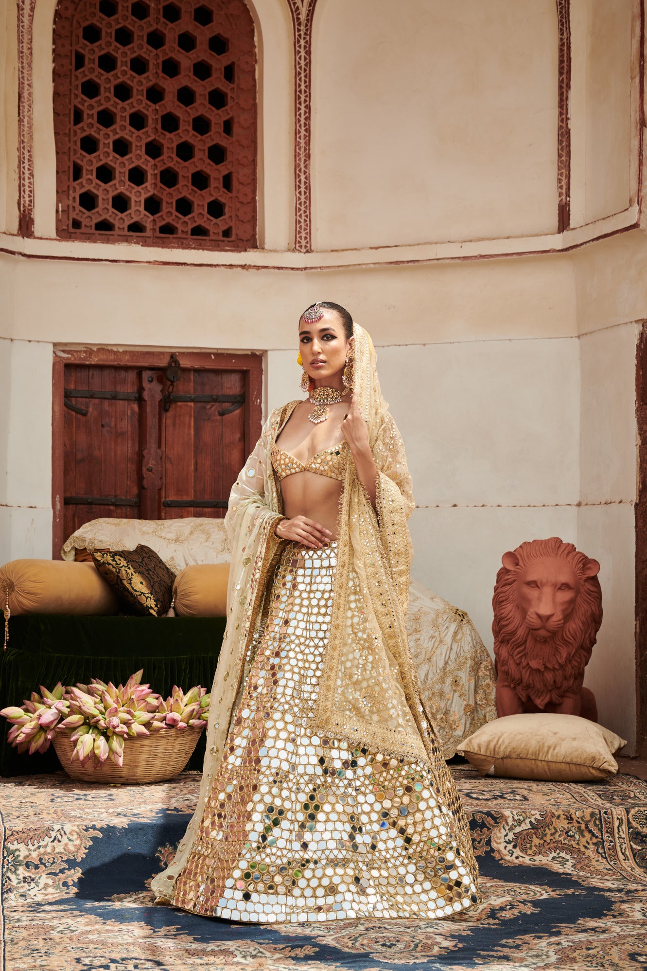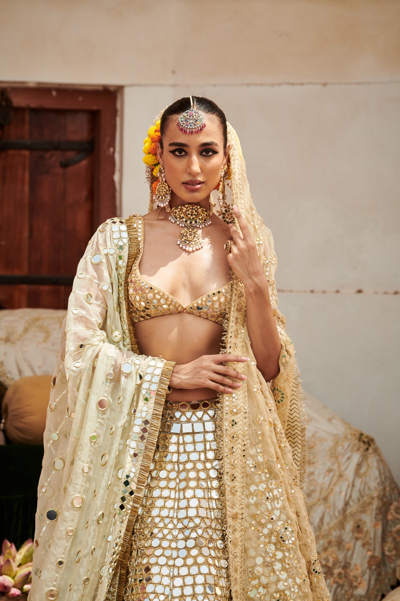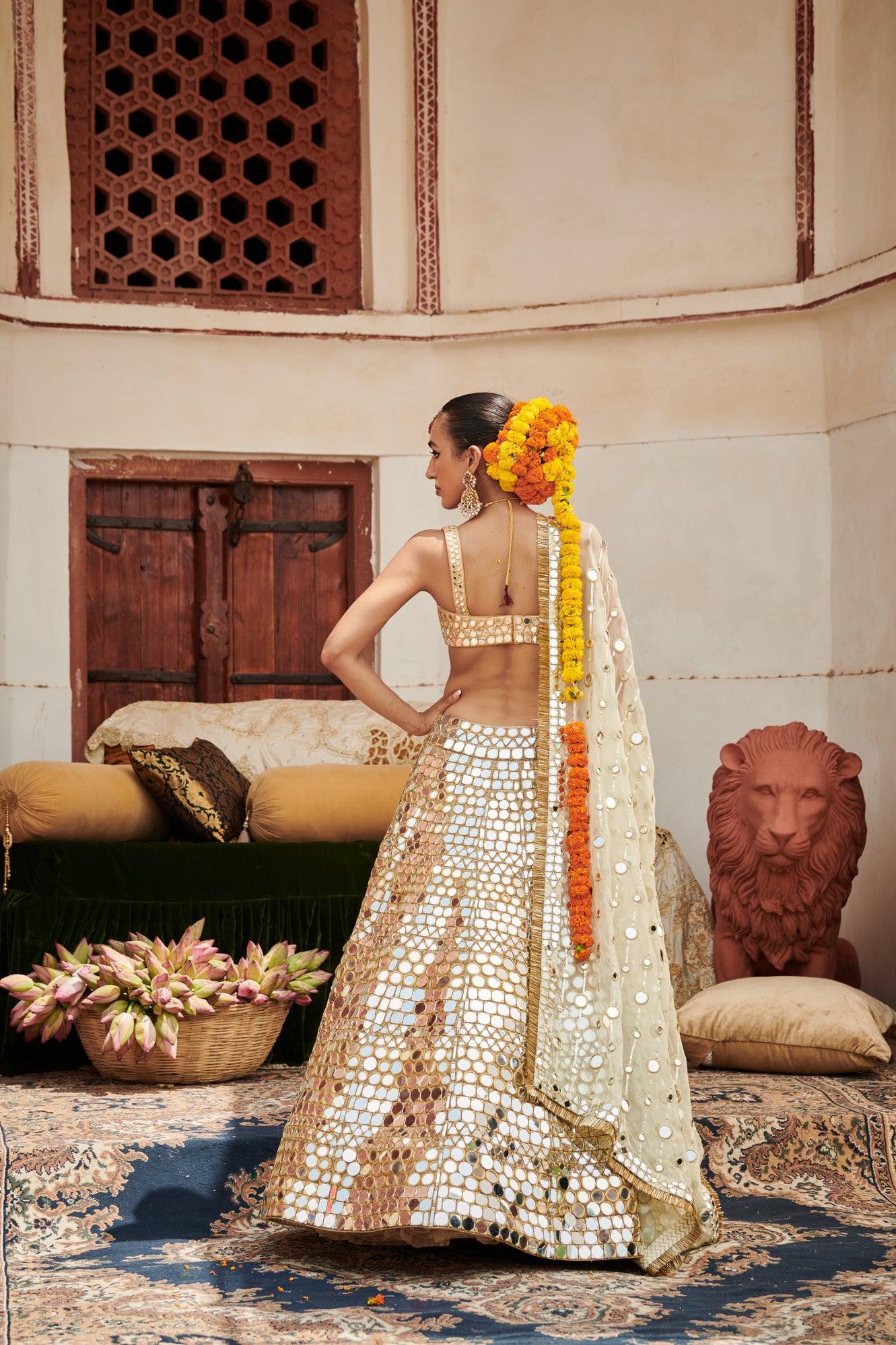 Heavy mirror work blouse and lehenga on gota lined with chanderi silk fabric is styled with an organza dupatta.
