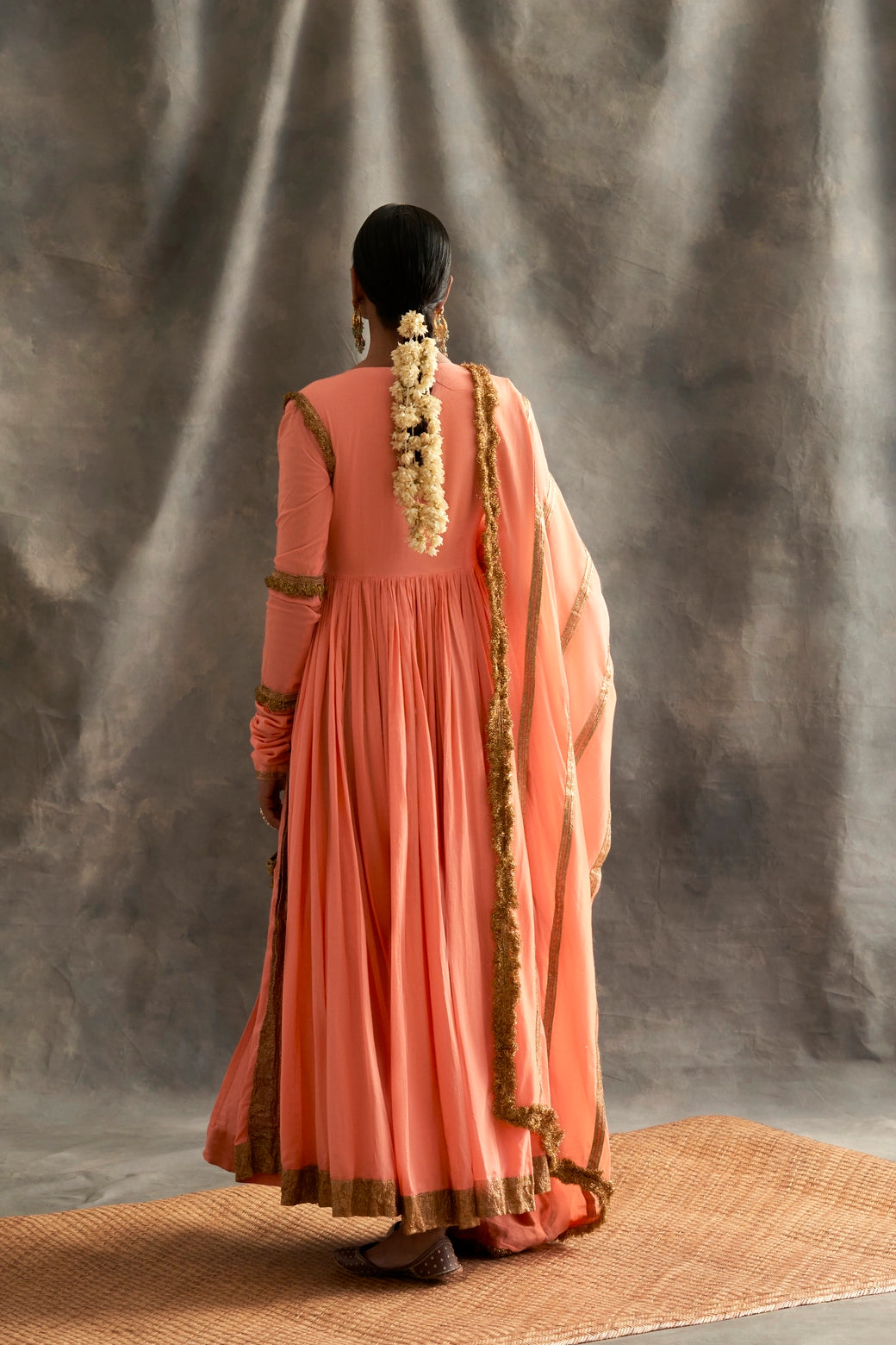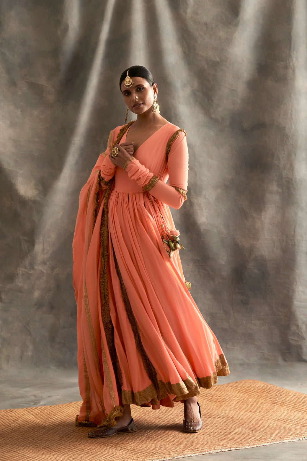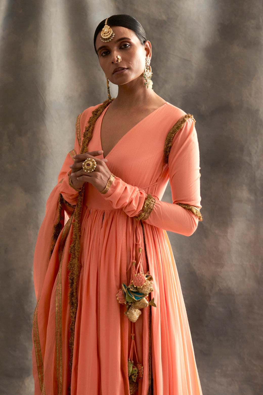 Peach Cotton Mul Angrakha With Metallic Lampi Godet , The Tieups Have Intricate Hand Made Animals For Tassels. The Dupatta Is An Alternate Panelled Organza, Chanderi Dupatta With Traditional Kiran
